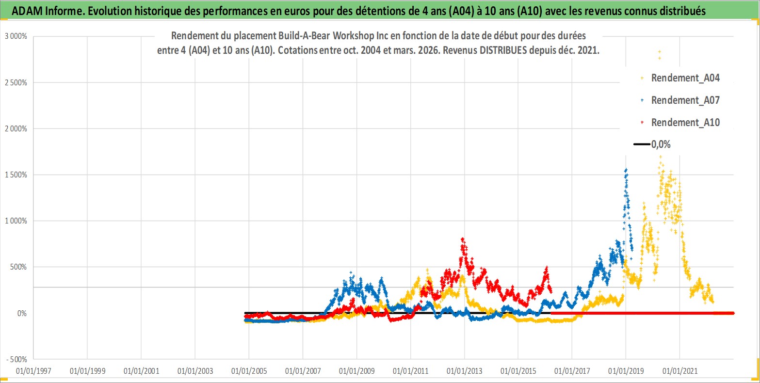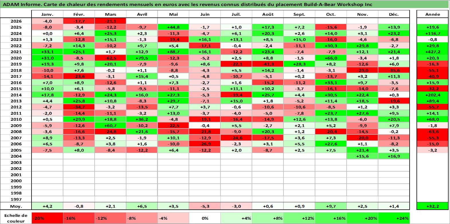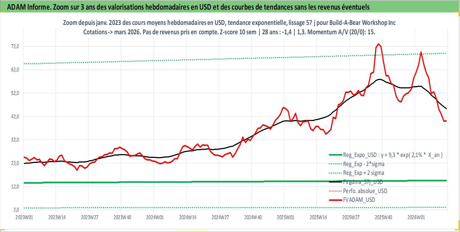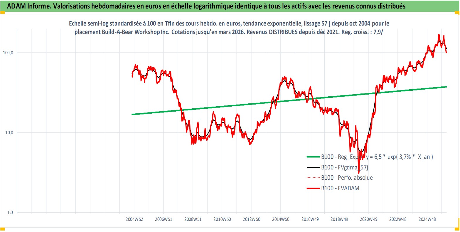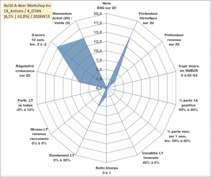 Site dédié aux investisseursPage dédiée sur site financeAnalyse des valorisations hebdomadaires de l'action Build-A-Bear Workshop Inc. Cet actif est cote en USD. Les valorisations sont en contrevaleur EURO et couvrent les semaines 2004W44 a 2026W13. Les revenus de cet actif financier sont pris en compte depuis la semaine 2021W49. La note ESG de cet actif n'est pas connue.