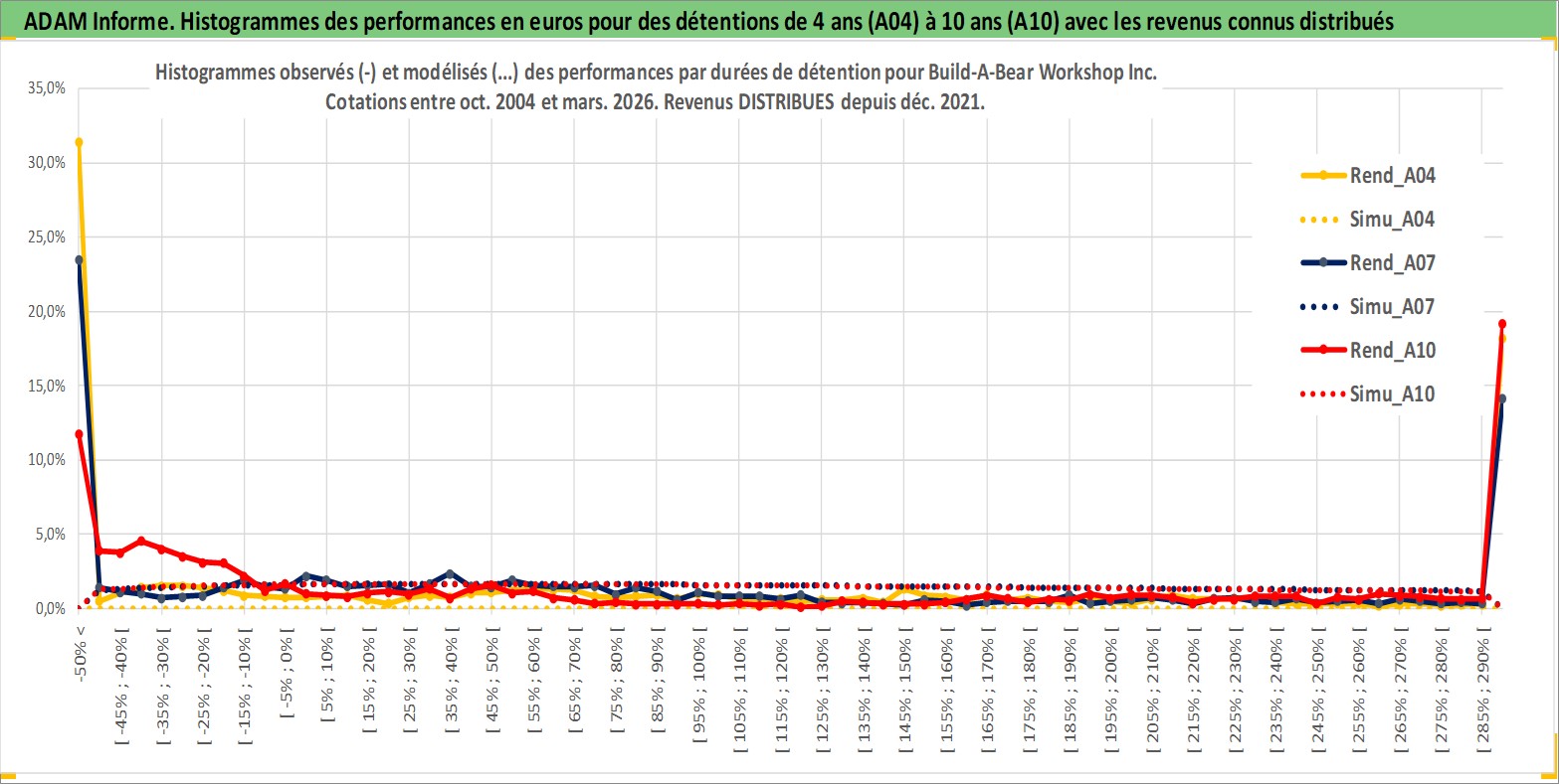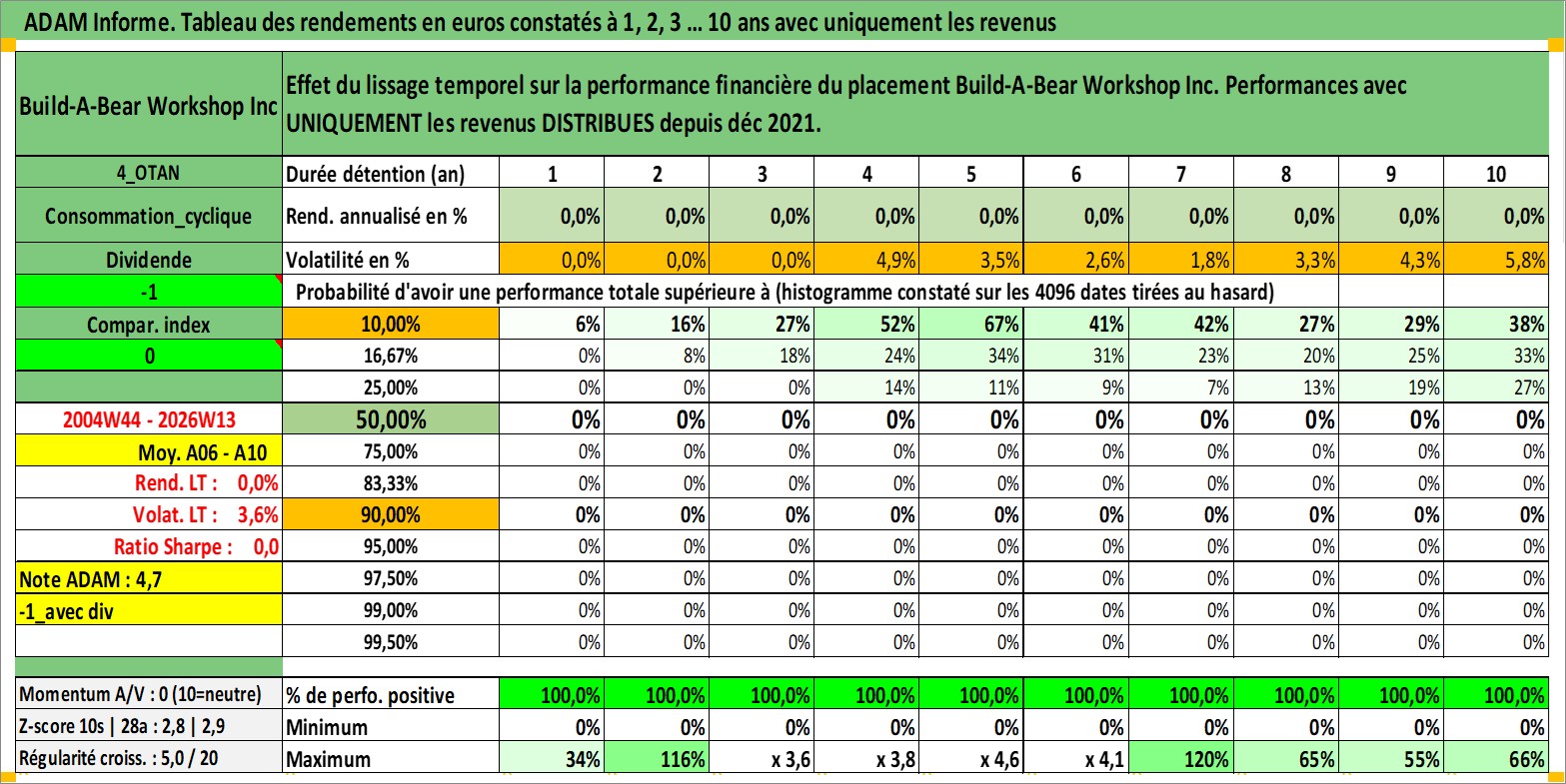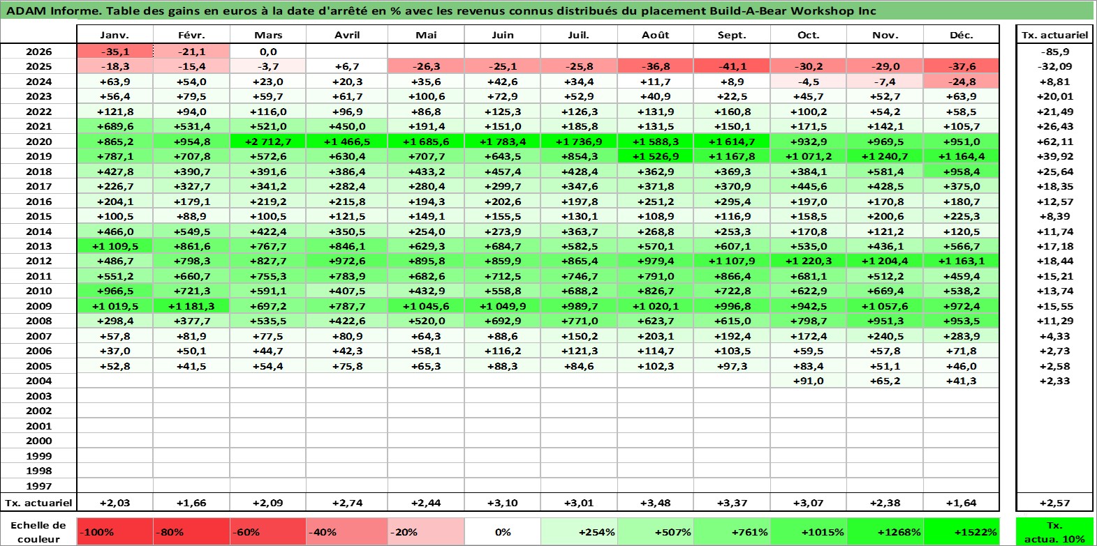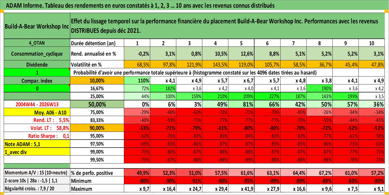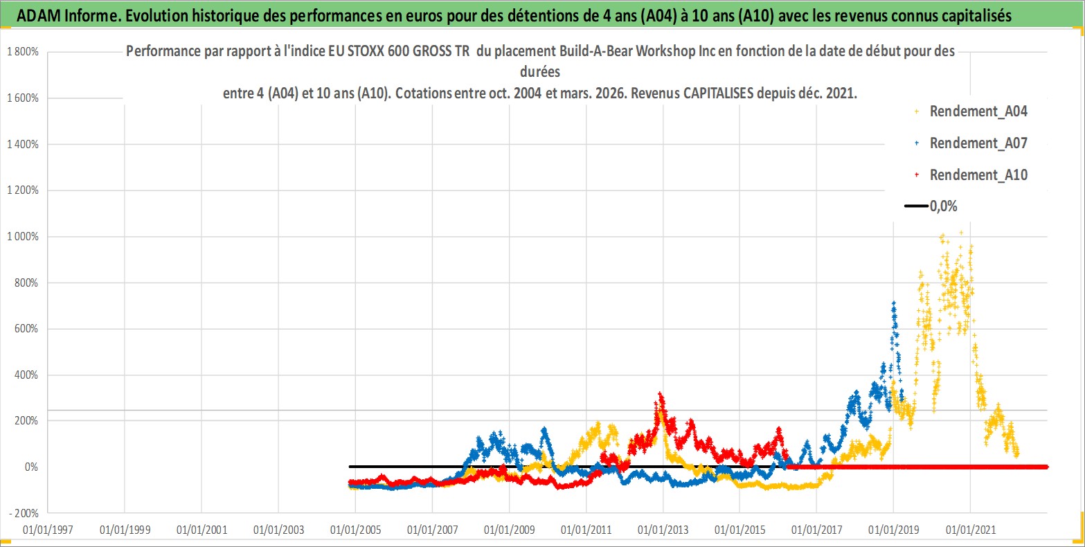 Site dédié aux investisseursPage dédiée sur site financeAnalyse des valorisations hebdomadaires de l'action Build-A-Bear Workshop Inc. Cet actif est cote en USD. Les valorisations sont en contrevaleur EURO et couvrent les semaines 2004W44 a 2026W13. Les revenus de cet actif financier sont pris en compte depuis la semaine 2021W49. La note ESG de cet actif n'est pas connue.