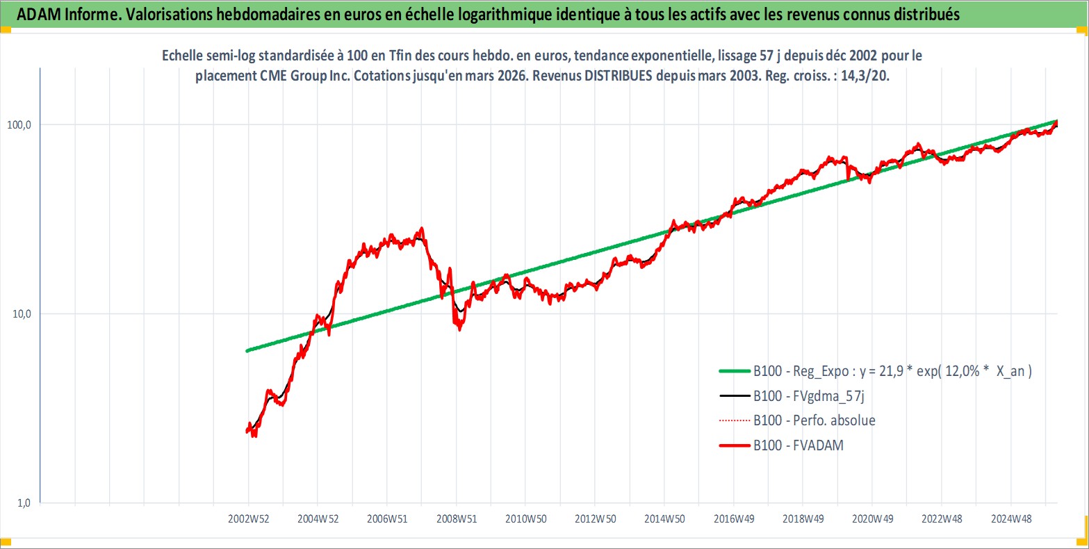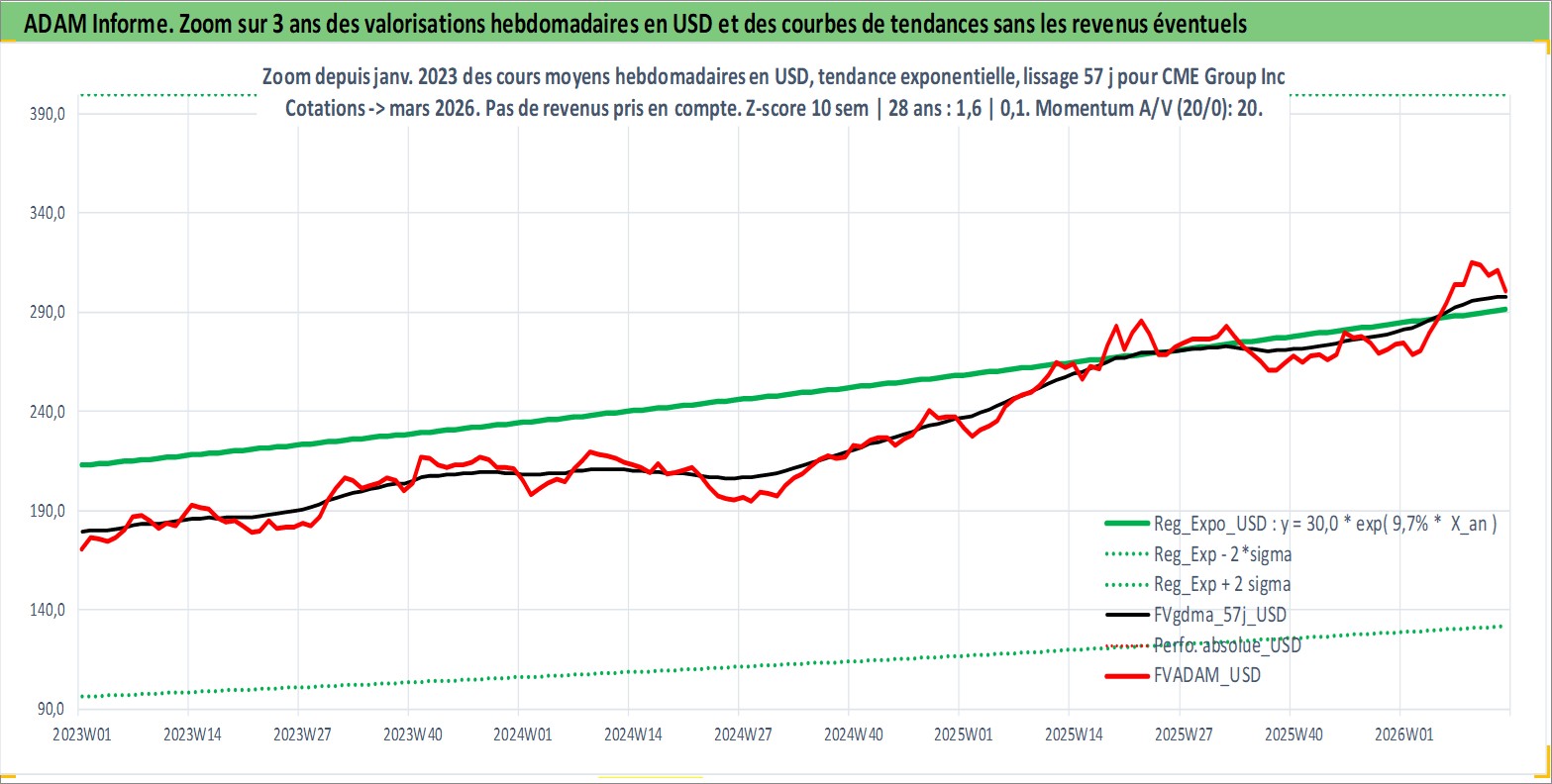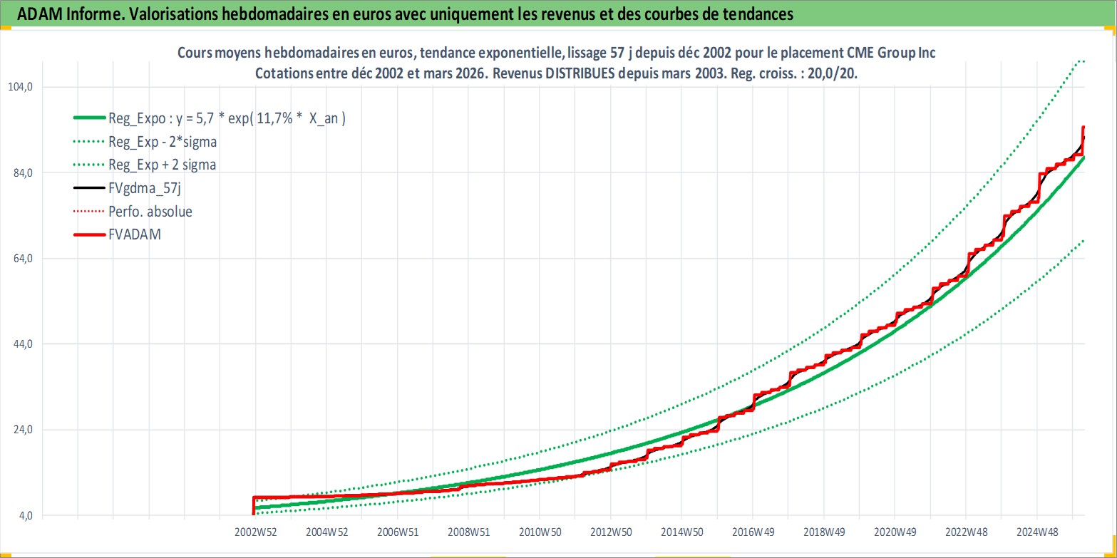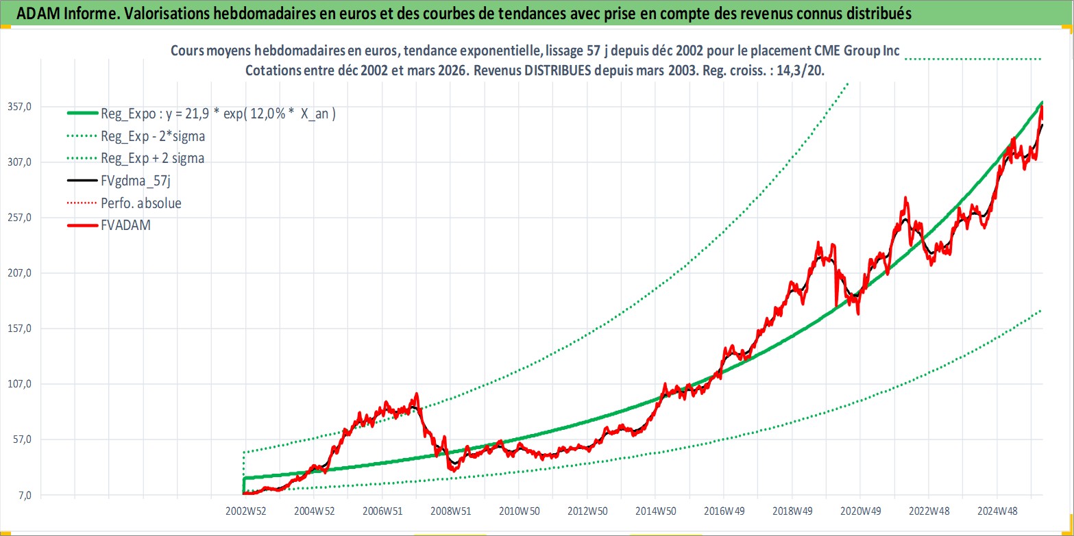 Site dédié aux investisseursPage dédiée sur site financeAnalyse des valorisations hebdomadaires de l'action CME Group Inc. Cet actif est cote en USD. Les valorisations sont en contrevaleur EURO et couvrent les semaines 2002W49 a 2026W13. Les revenus de cet actif financier sont pris en compte depuis la semaine 2003W10. La note globale ESG de cet actif est estimee a 13.0 (apres rebasage entre 0 et 20).