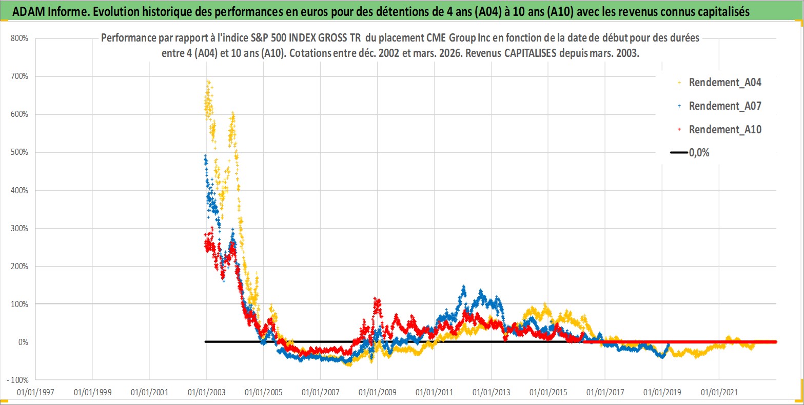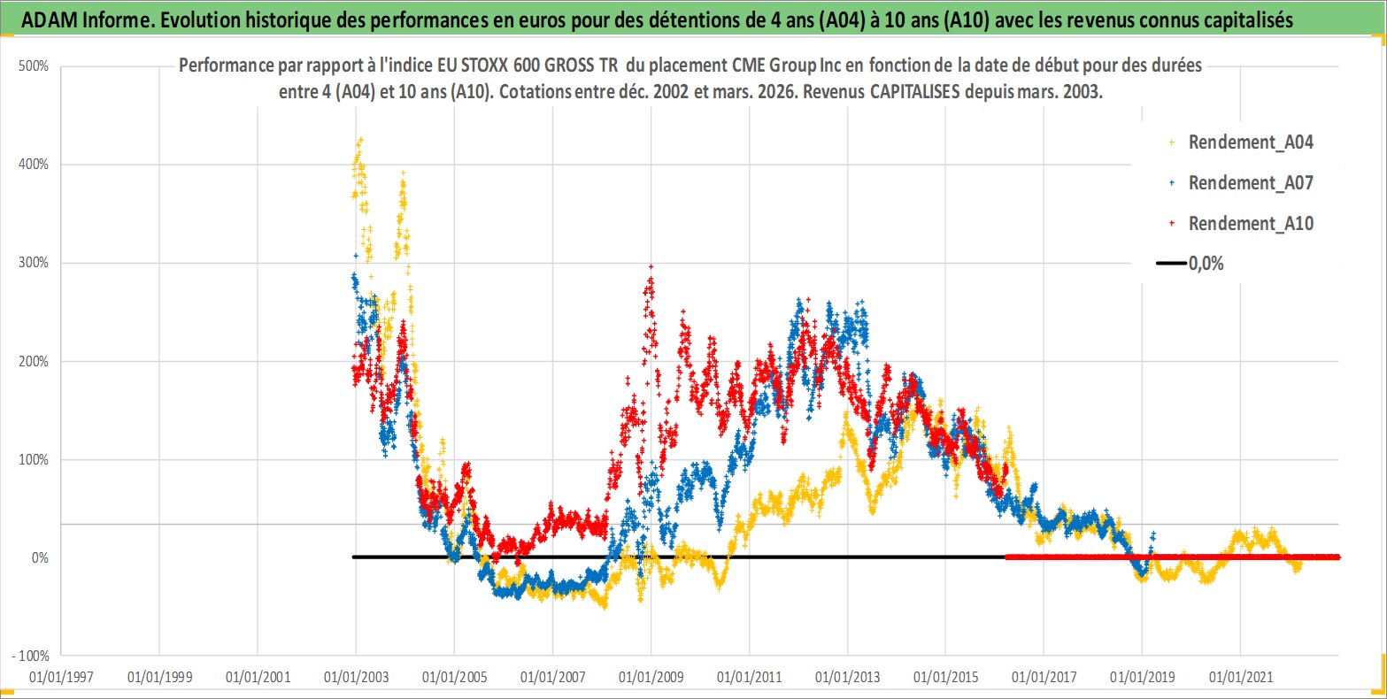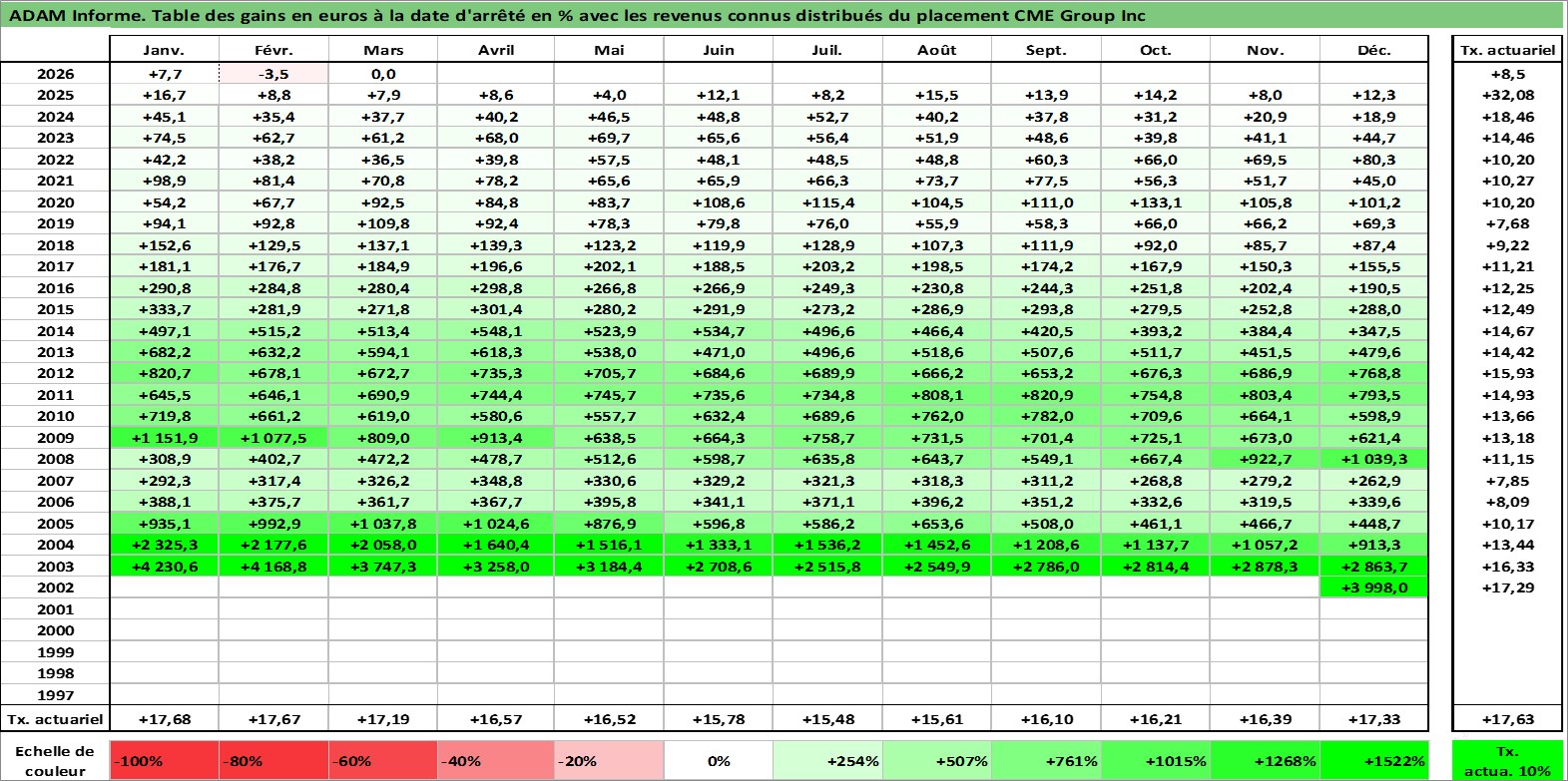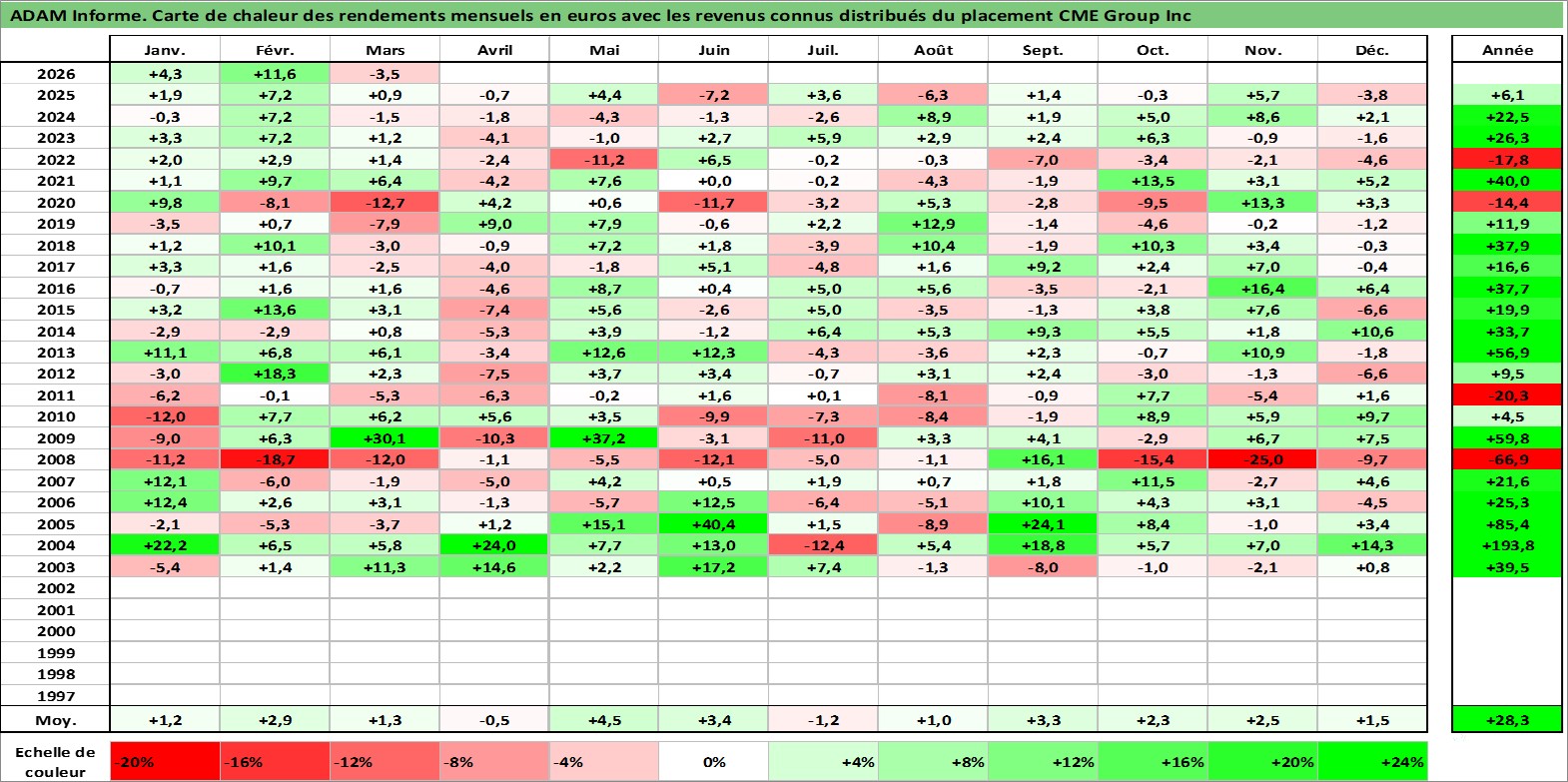 Site dédié aux investisseursPage dédiée sur site financeAnalyse des valorisations hebdomadaires de l'action CME Group Inc. Cet actif est cote en USD. Les valorisations sont en contrevaleur EURO et couvrent les semaines 2002W49 a 2026W13. Les revenus de cet actif financier sont pris en compte depuis la semaine 2003W10. La note globale ESG de cet actif est estimee a 13.0 (apres rebasage entre 0 et 20).