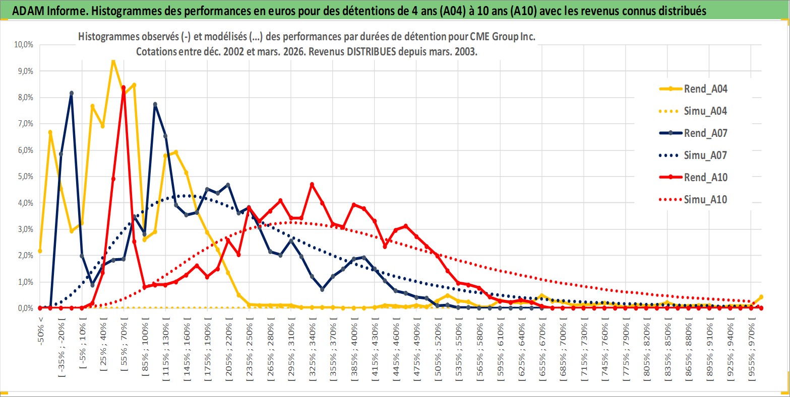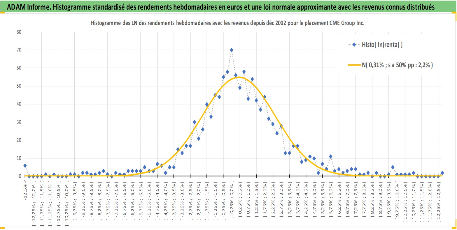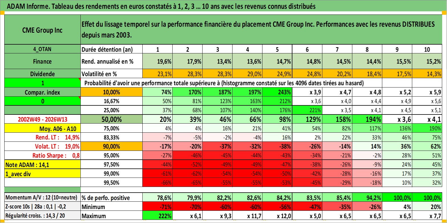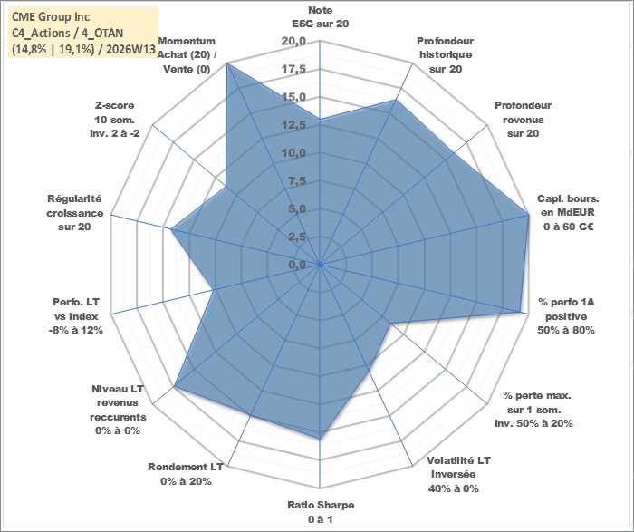 Site dédié aux investisseursPage dédiée sur site financeAnalyse des valorisations hebdomadaires de l'action CME Group Inc. Cet actif est cote en USD. Les valorisations sont en contrevaleur EURO et couvrent les semaines 2002W49 a 2026W13. Les revenus de cet actif financier sont pris en compte depuis la semaine 2003W10. La note globale ESG de cet actif est estimee a 13.0 (apres rebasage entre 0 et 20).