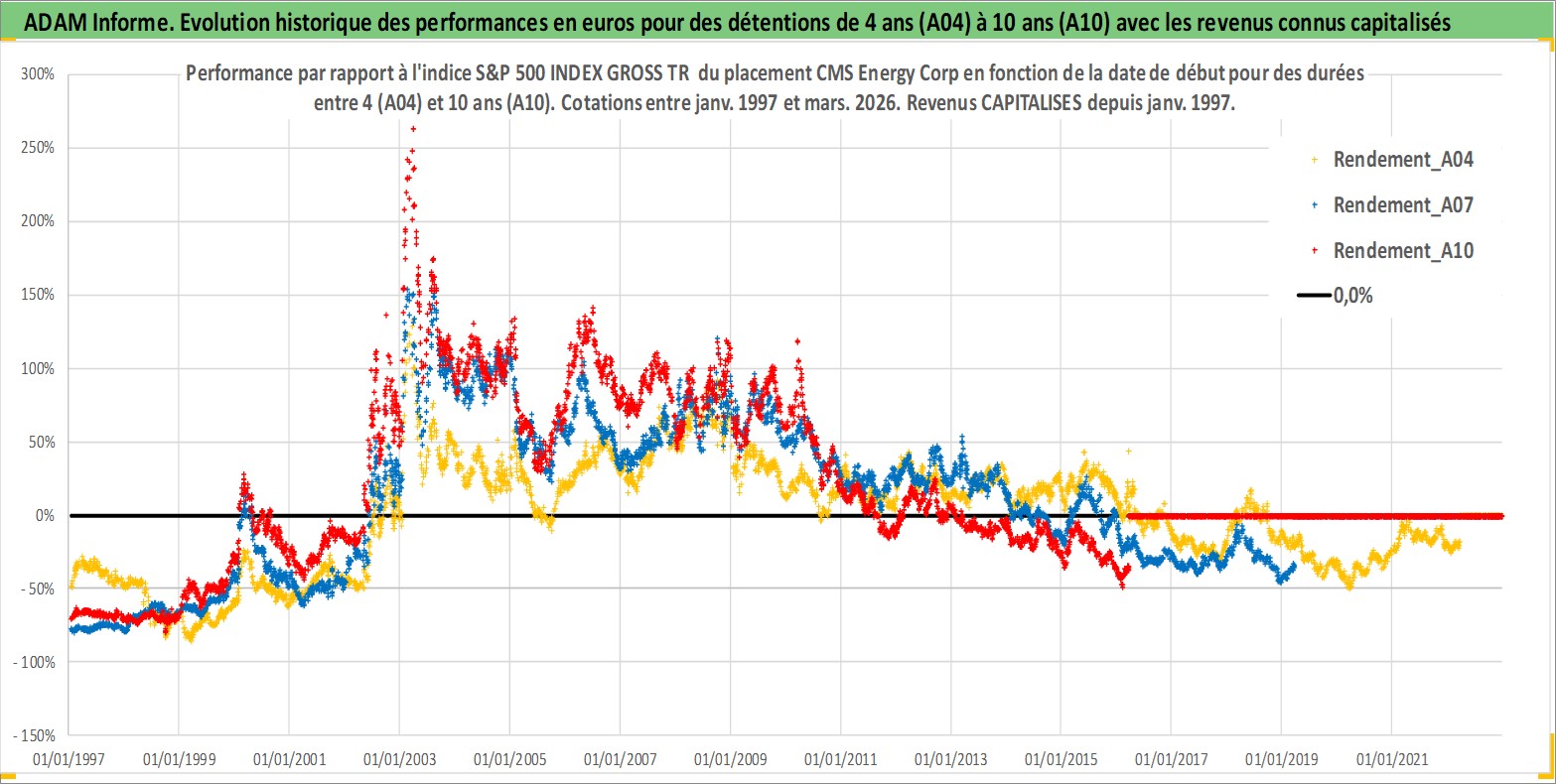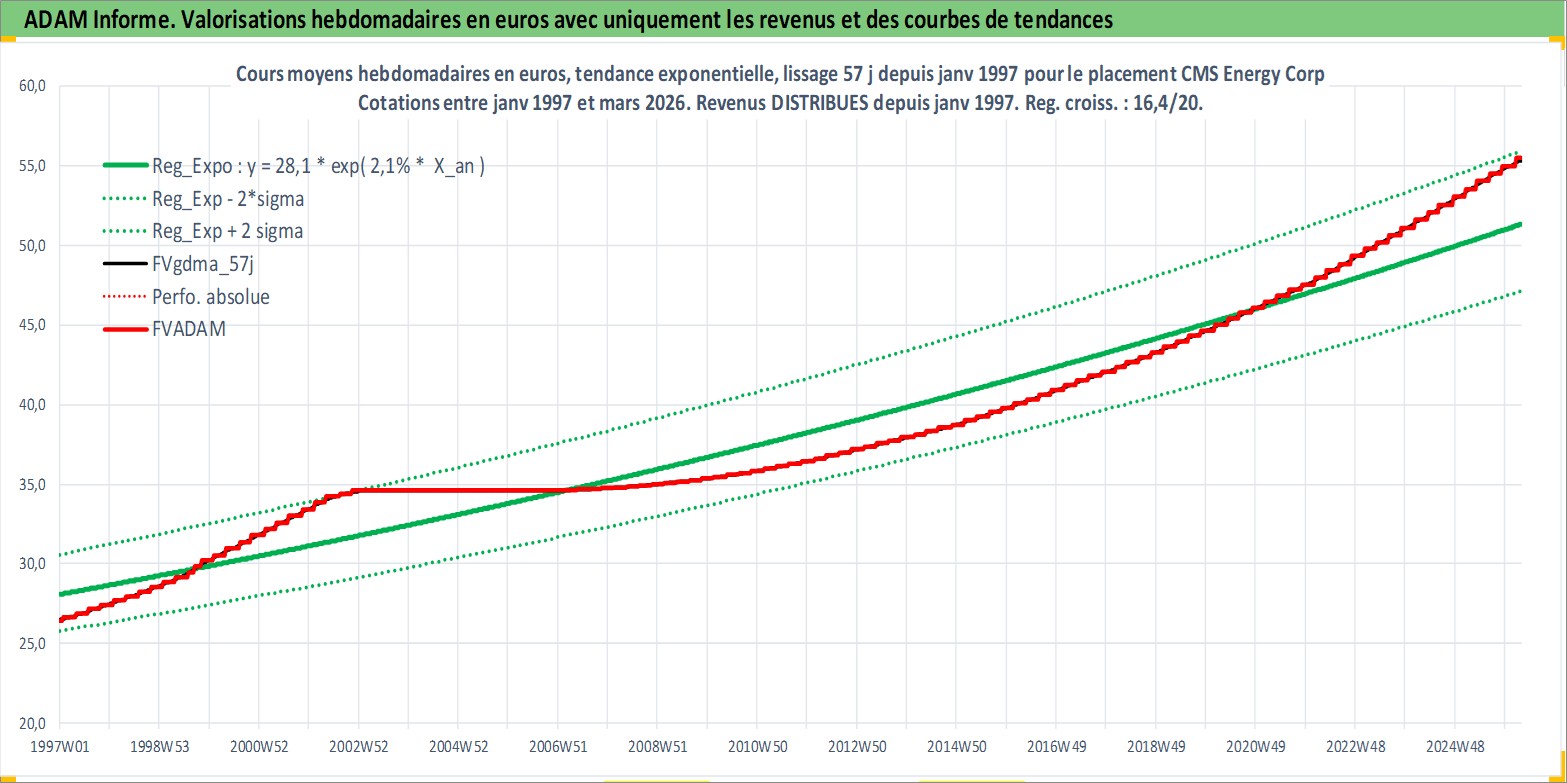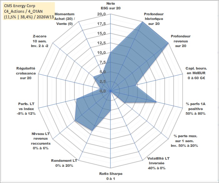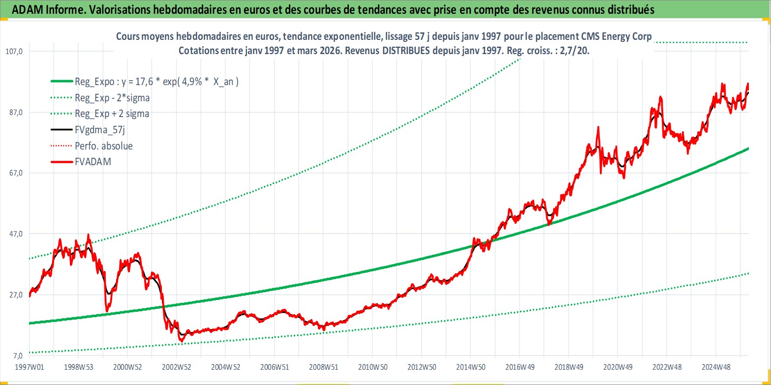 Site dédié aux investisseursPage dédiée sur site financeAnalyse des valorisations hebdomadaires de l'action CMS Energy Corp. Cet actif est cote en USD. Les valorisations sont en contrevaleur EURO et couvrent les semaines 1997W01 a 2026W13. Les revenus de cet actif financier sont pris en compte depuis la semaine 1997W05. La note globale ESG de cet actif est estimee a 10.0 (apres rebasage entre 0 et 20).