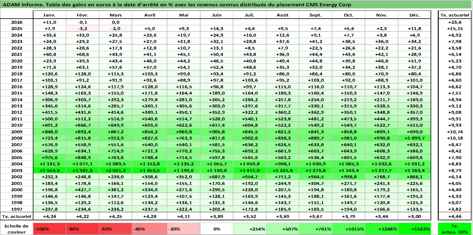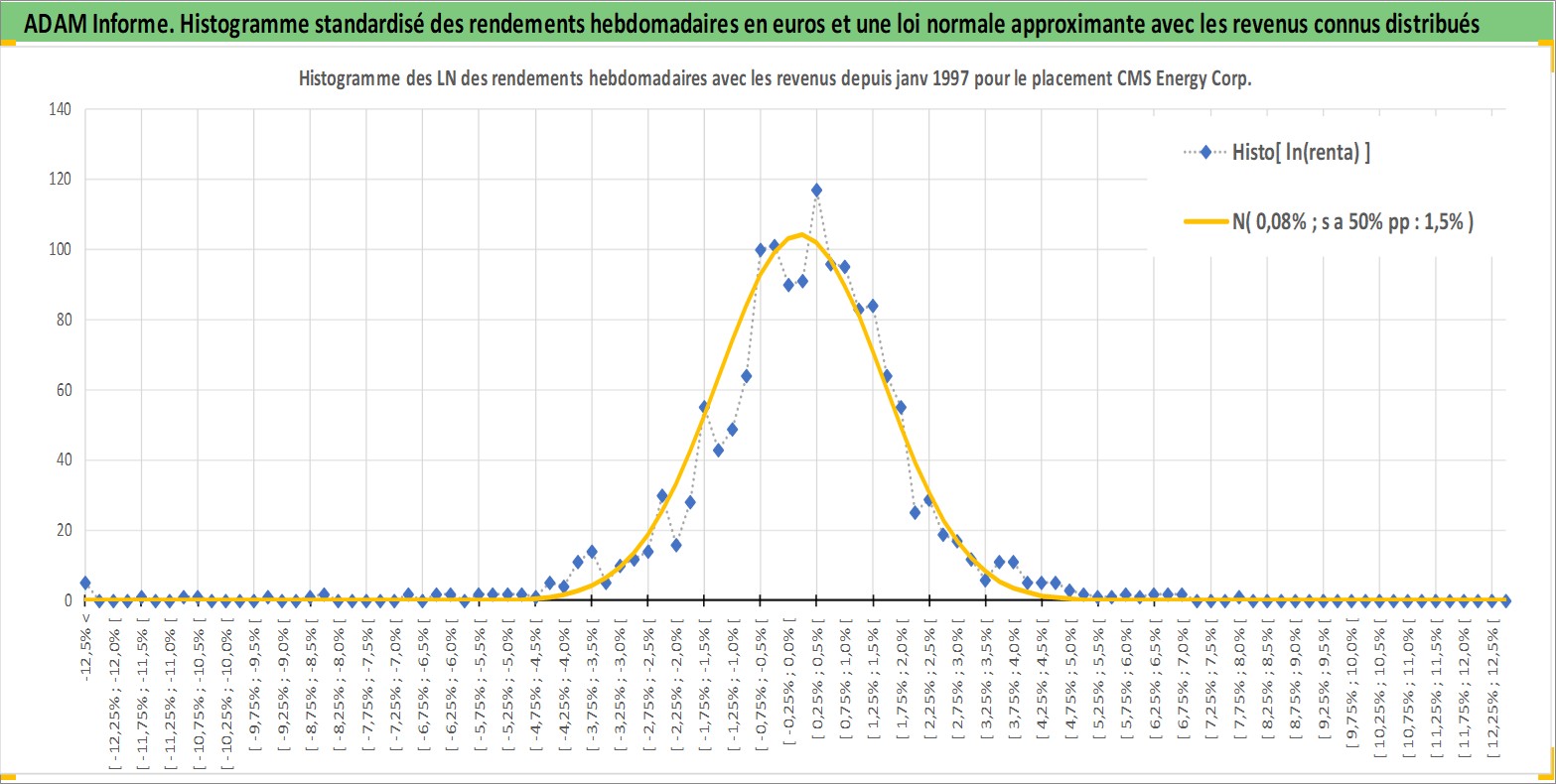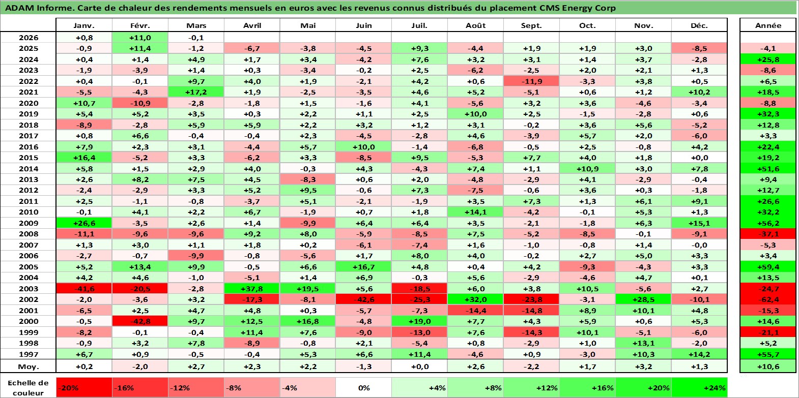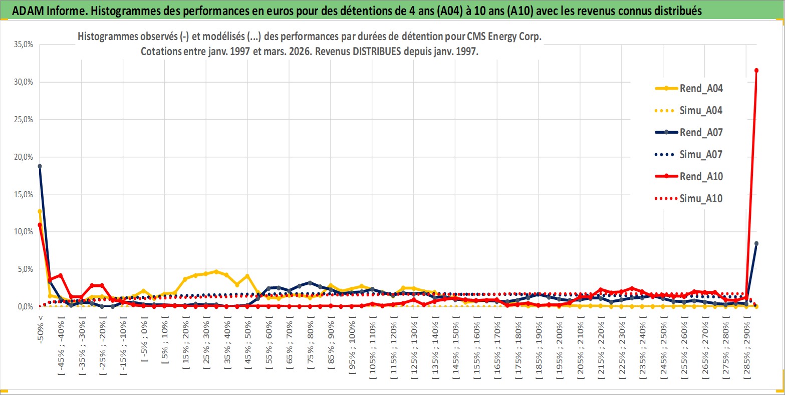 Site dédié aux investisseursPage dédiée sur site financeAnalyse des valorisations hebdomadaires de l'action CMS Energy Corp. Cet actif est cote en USD. Les valorisations sont en contrevaleur EURO et couvrent les semaines 1997W01 a 2026W13. Les revenus de cet actif financier sont pris en compte depuis la semaine 1997W05. La note globale ESG de cet actif est estimee a 10.0 (apres rebasage entre 0 et 20).