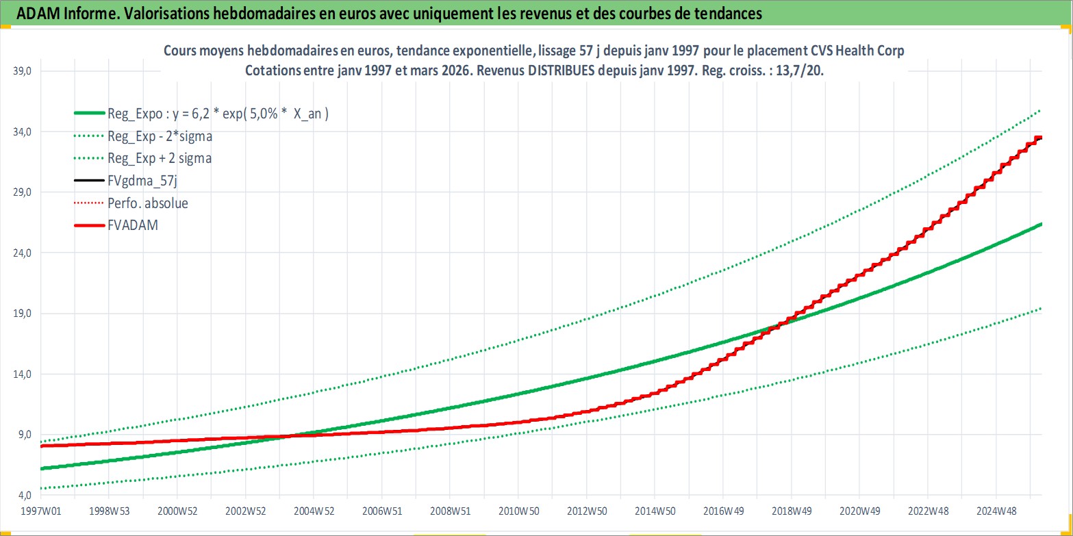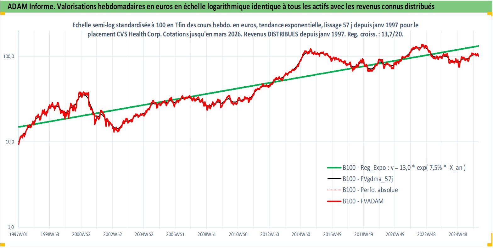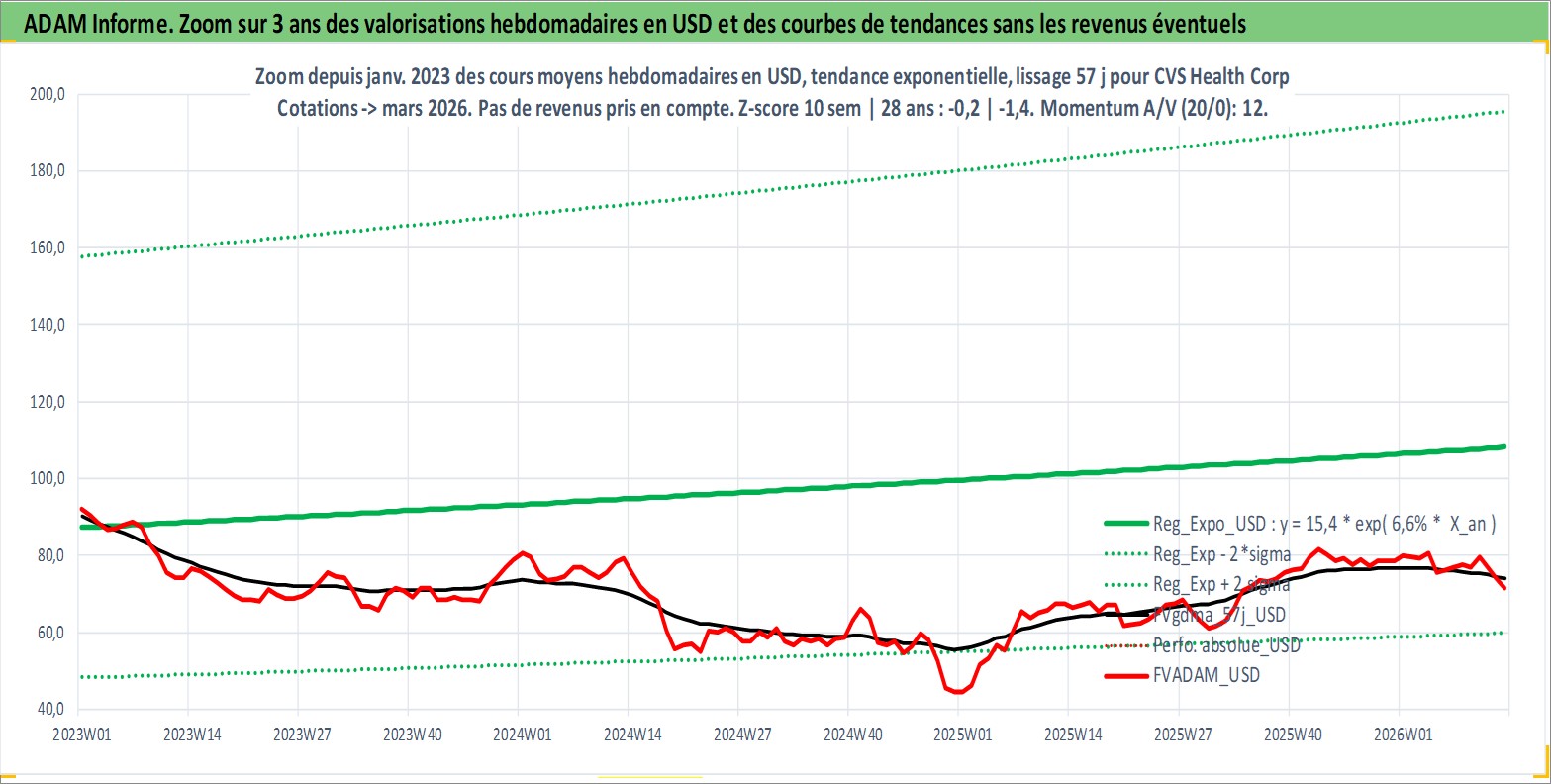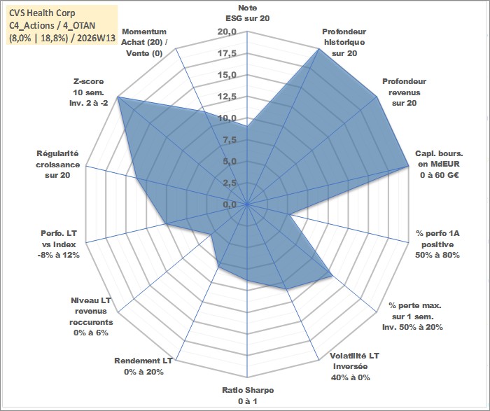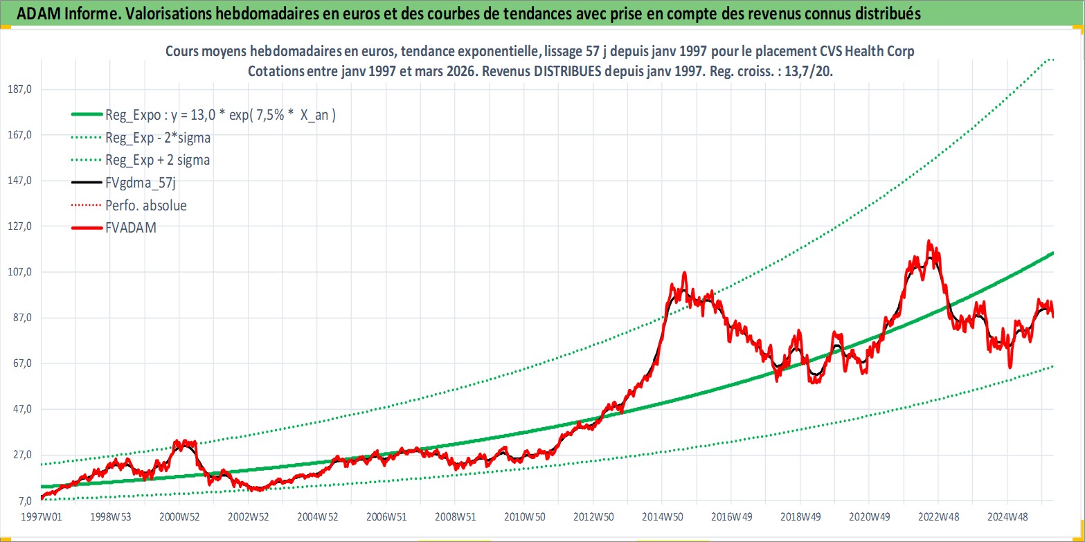 Site dédié aux investisseursPage dédiée sur site financeAnalyse des valorisations hebdomadaires de l'action CVS Health Corp. Cet actif est cote en USD. Les valorisations sont en contrevaleur EURO et couvrent les semaines 1997W01 a 2026W13. Les revenus de cet actif financier sont pris en compte depuis la semaine 1997W04. La note globale ESG de cet actif est estimee a 9.0 (apres rebasage entre 0 et 20).