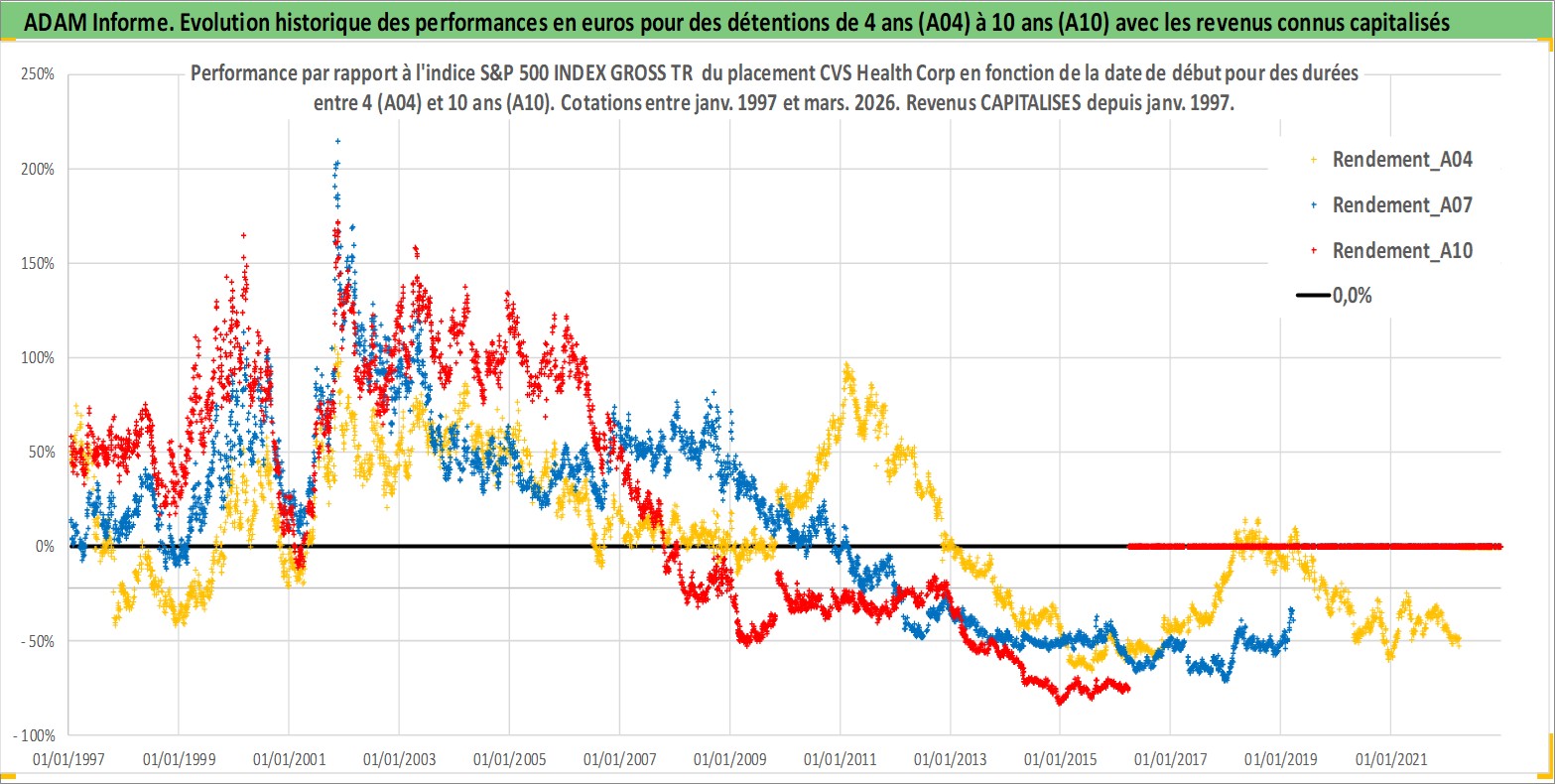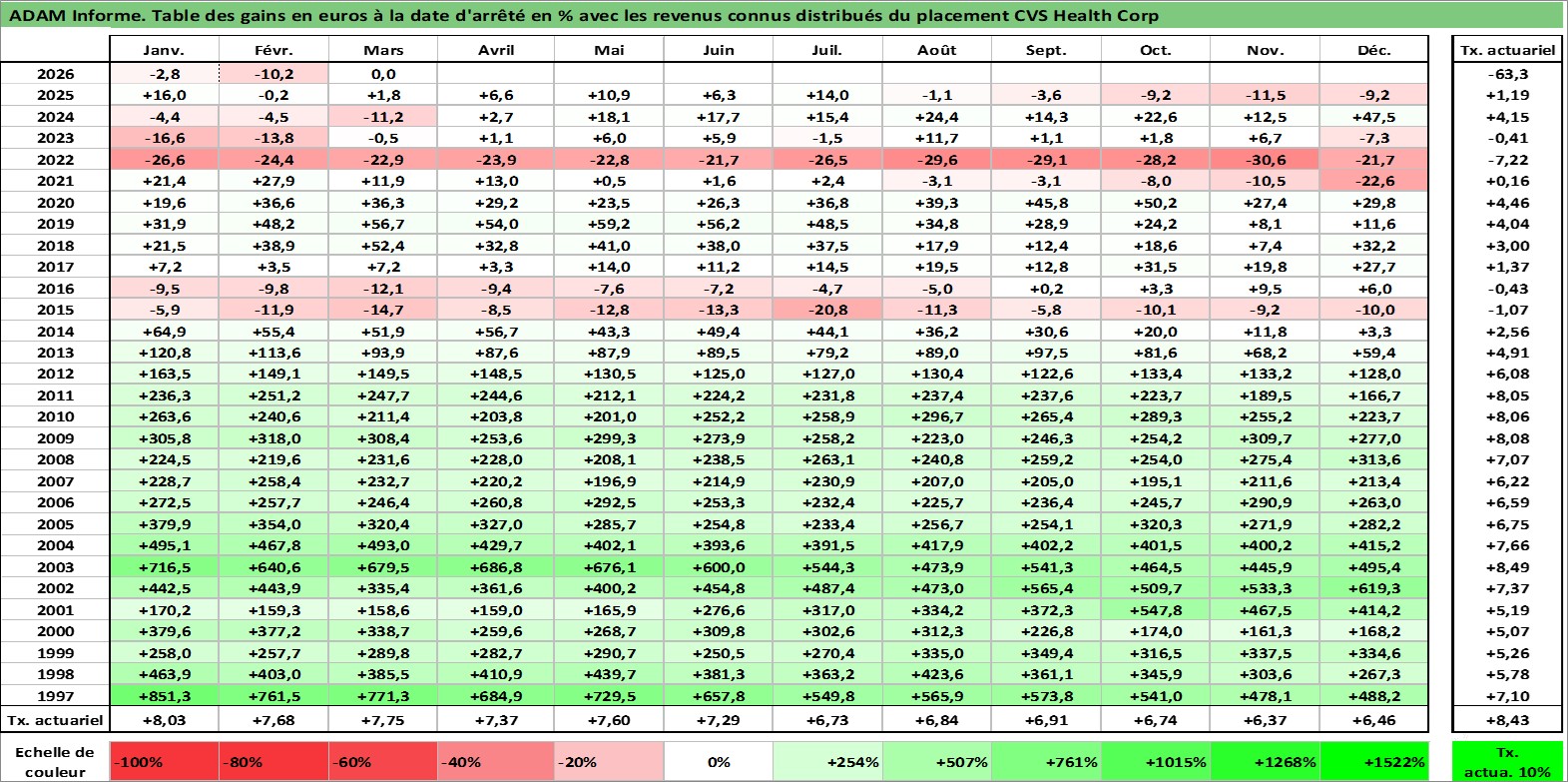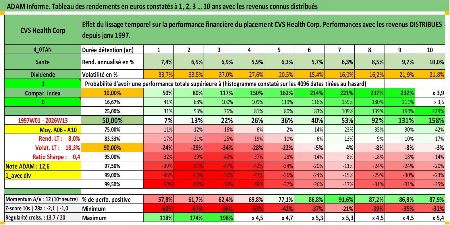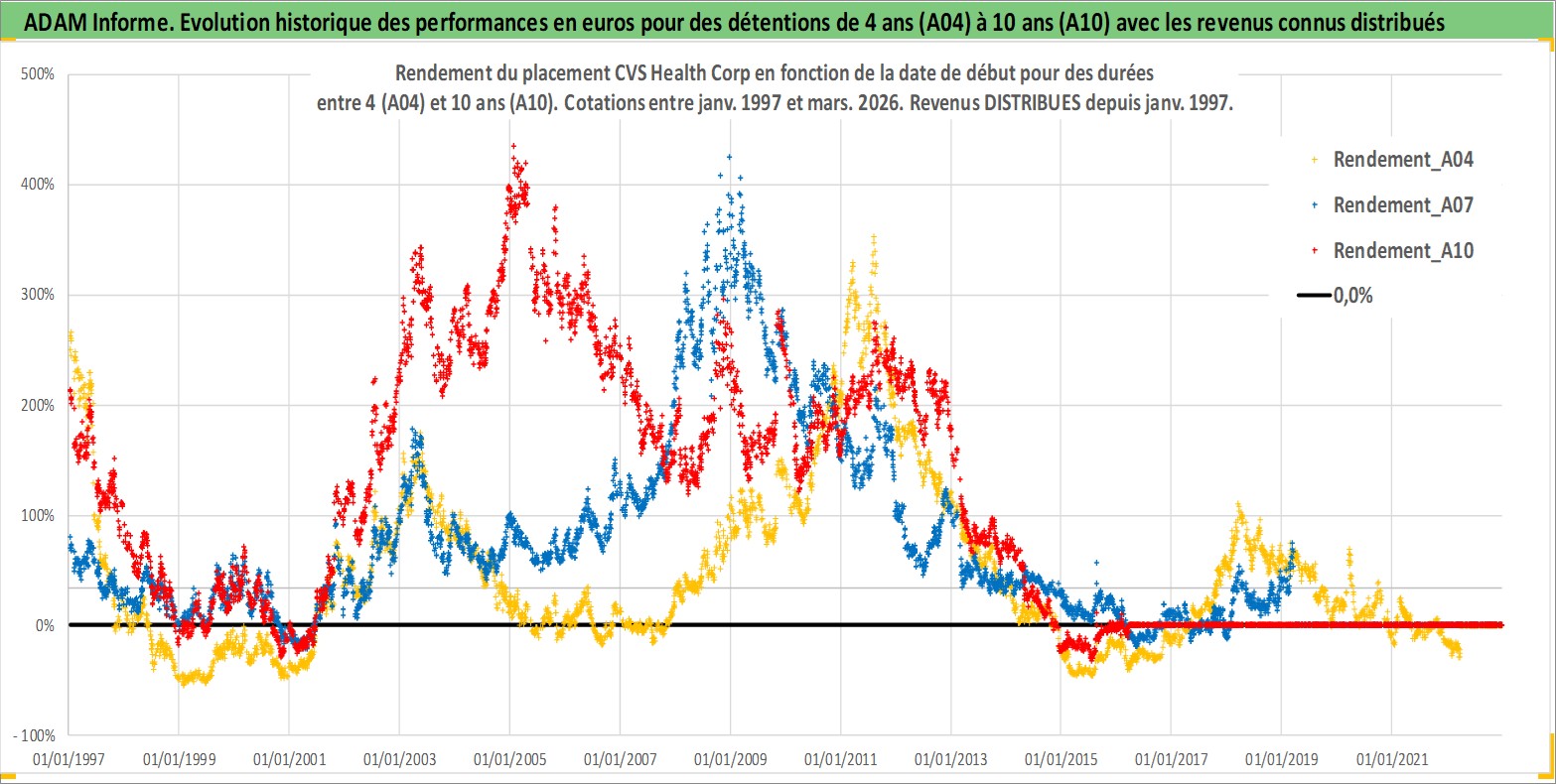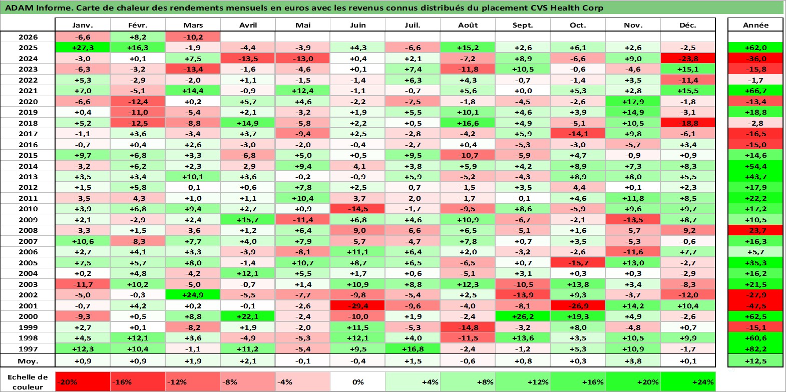 Site dédié aux investisseursPage dédiée sur site financeAnalyse des valorisations hebdomadaires de l'action CVS Health Corp. Cet actif est cote en USD. Les valorisations sont en contrevaleur EURO et couvrent les semaines 1997W01 a 2026W13. Les revenus de cet actif financier sont pris en compte depuis la semaine 1997W04. La note globale ESG de cet actif est estimee a 9.0 (apres rebasage entre 0 et 20).