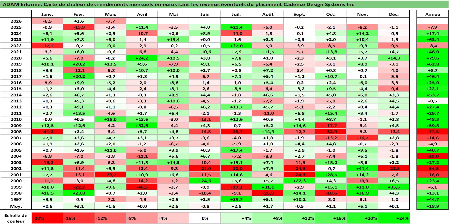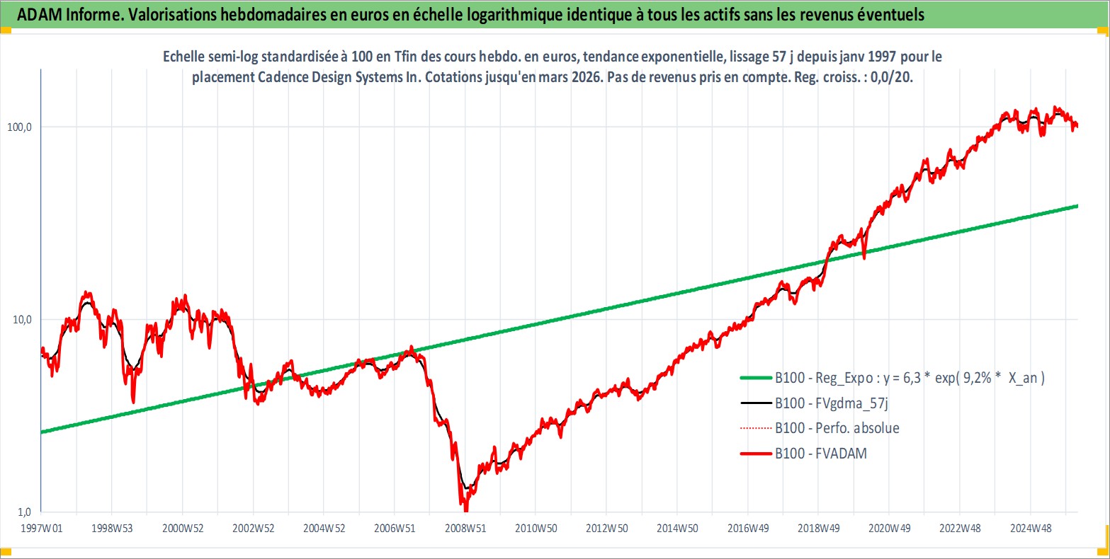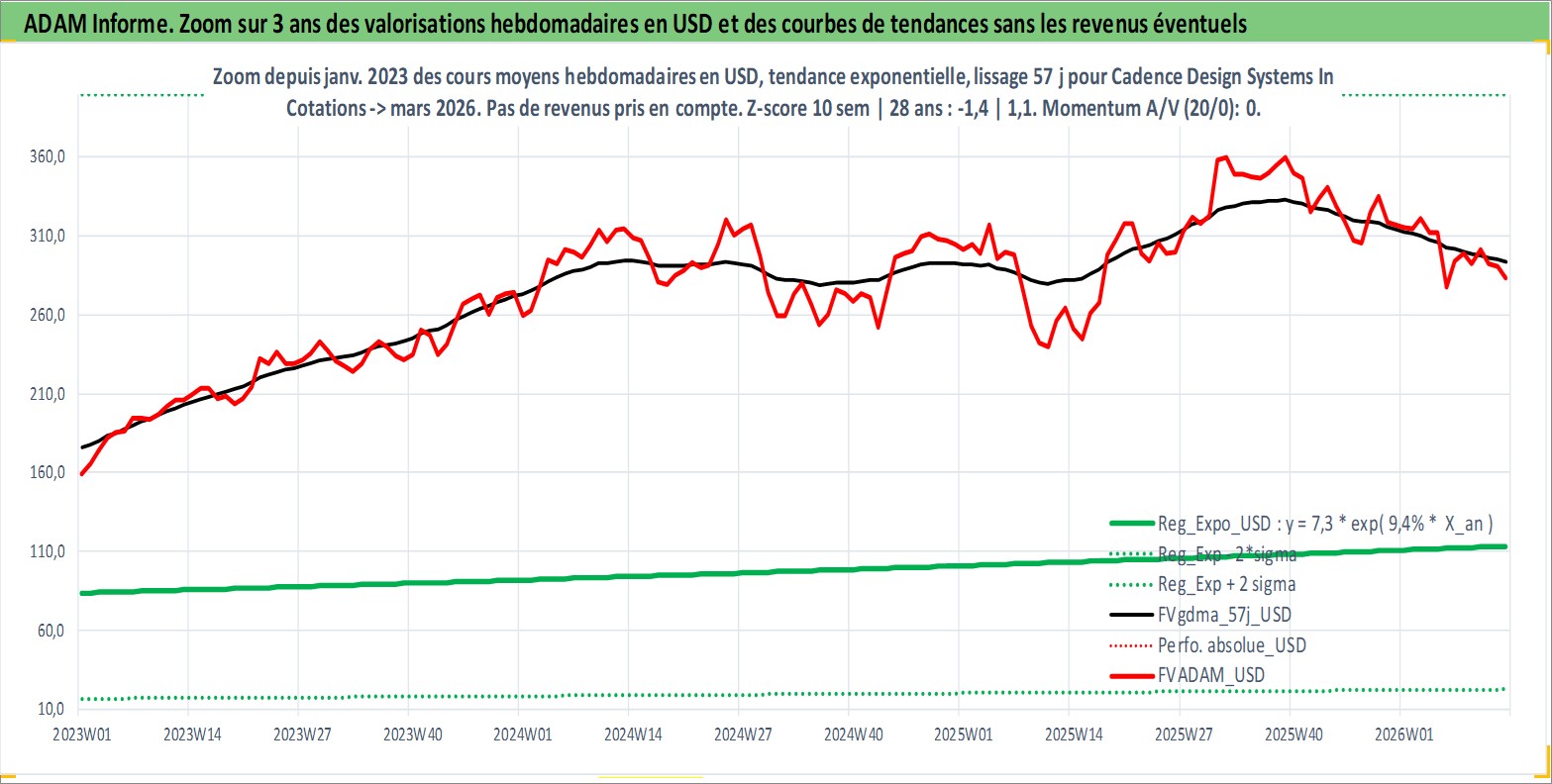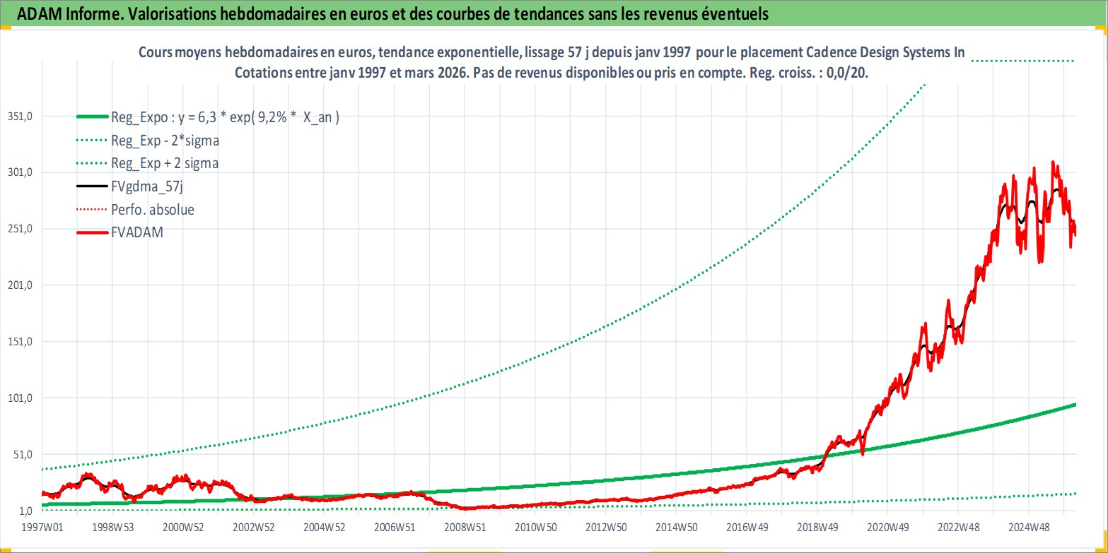 Site dédié aux investisseursPage dédiée sur site financeAnalyse des valorisations hebdomadaires de l'action Cadence Design Systems Inc. Cet actif est cote en USD. Les valorisations sont en contrevaleur EURO et couvrent les semaines 1997W01 a 2026W13. Les revenus de cet actif financier ne sont pas connus car non existants ou non disponibles sur le site Yahoo Finance. La note globale ESG de cet actif est estimee a 15.0 (apres rebasage entre 0 et 20).