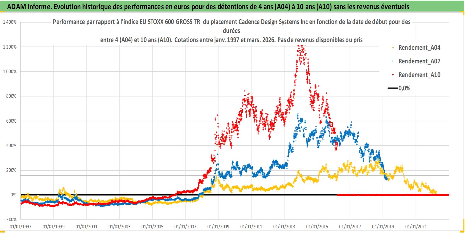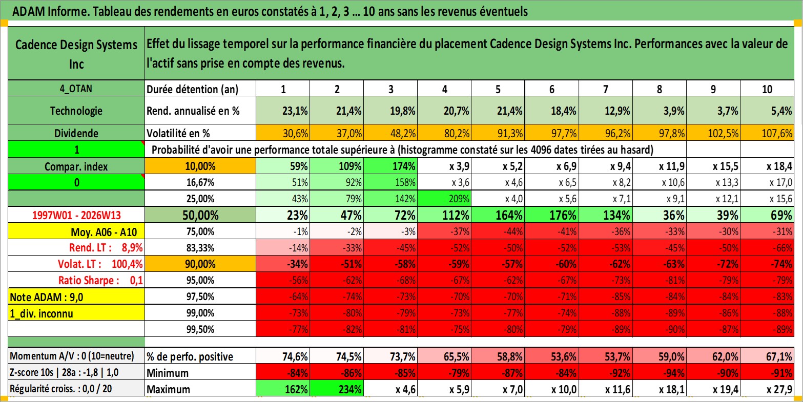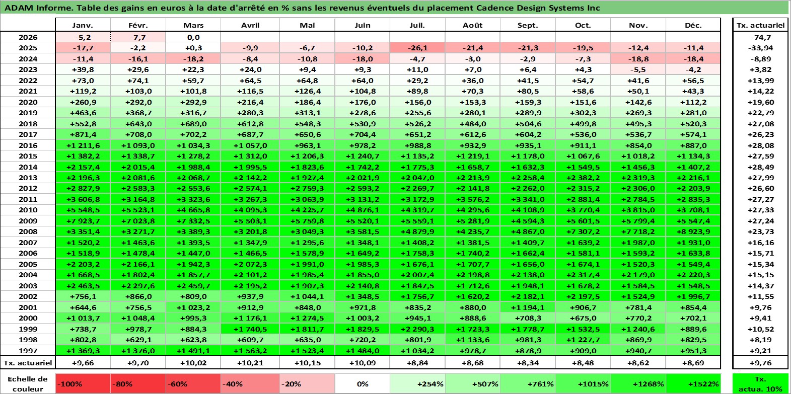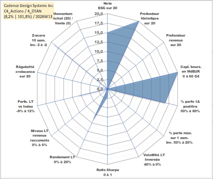 Site dédié aux investisseursPage dédiée sur site financeAnalyse des valorisations hebdomadaires de l'action Cadence Design Systems Inc. Cet actif est cote en USD. Les valorisations sont en contrevaleur EURO et couvrent les semaines 1997W01 a 2026W13. Les revenus de cet actif financier ne sont pas connus car non existants ou non disponibles sur le site Yahoo Finance. La note globale ESG de cet actif est estimee a 15.0 (apres rebasage entre 0 et 20).
