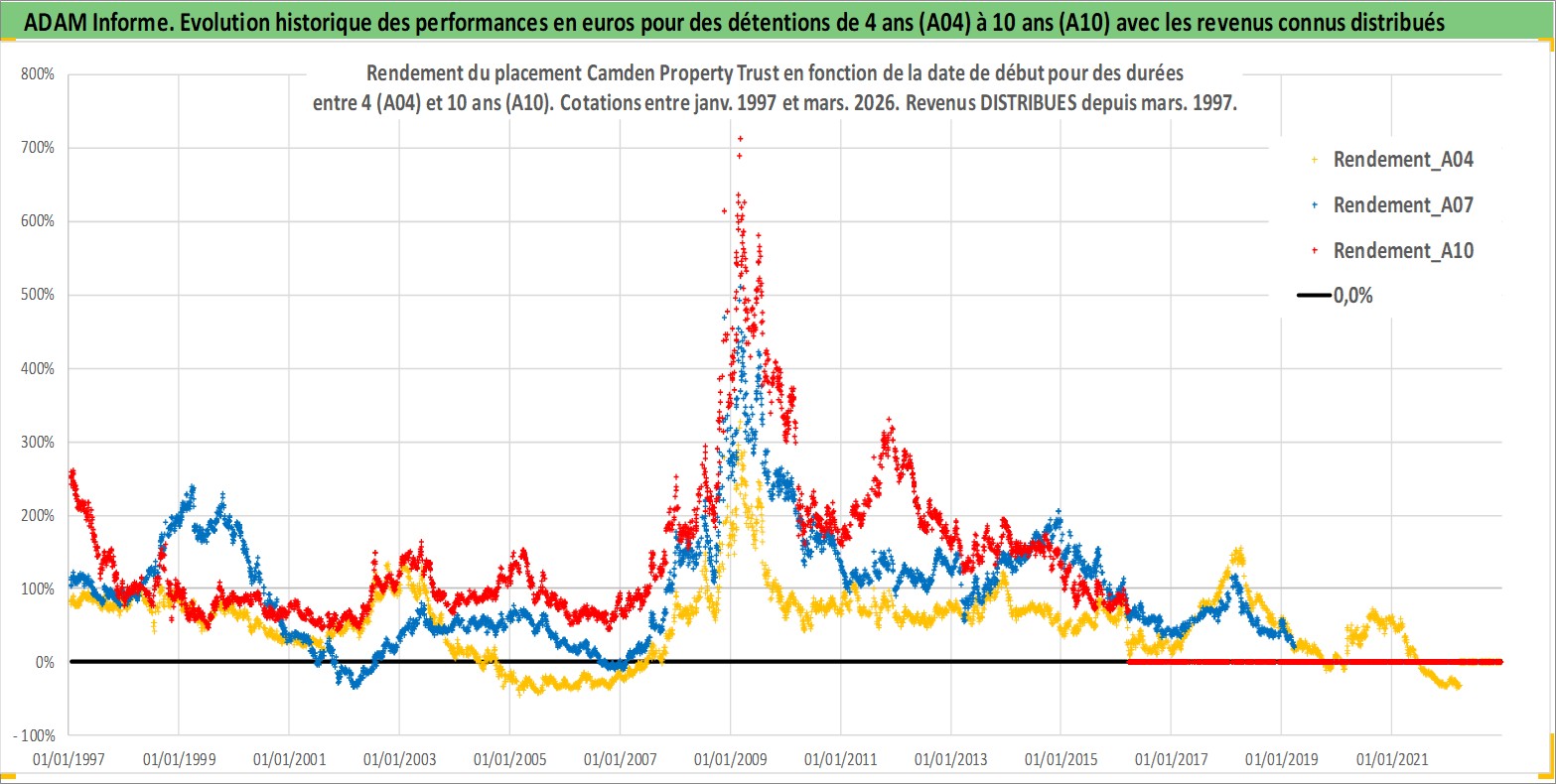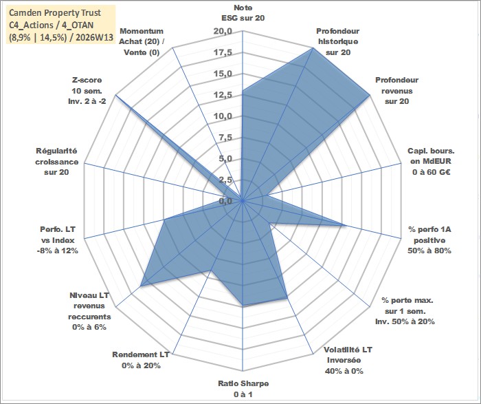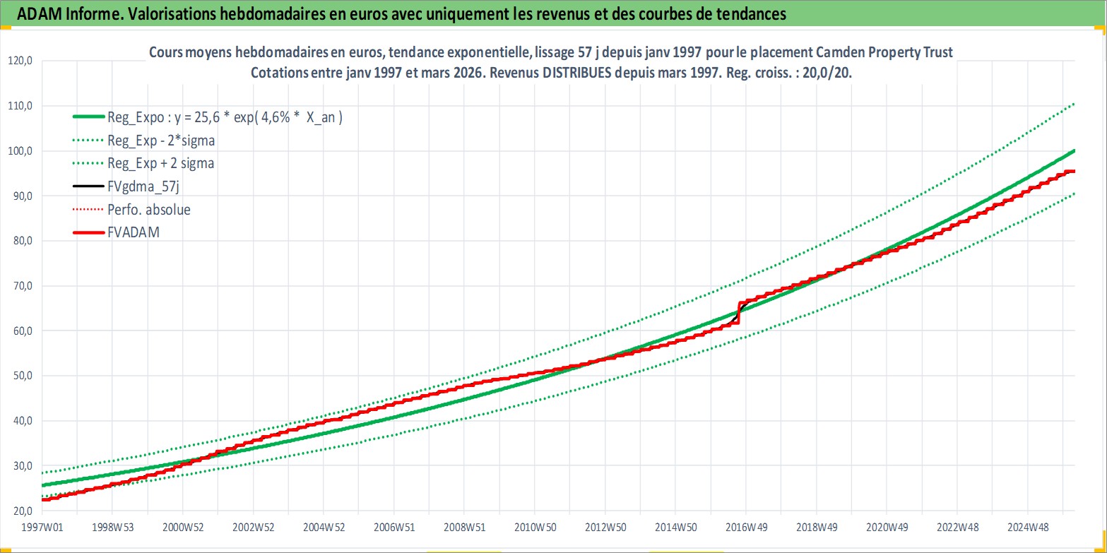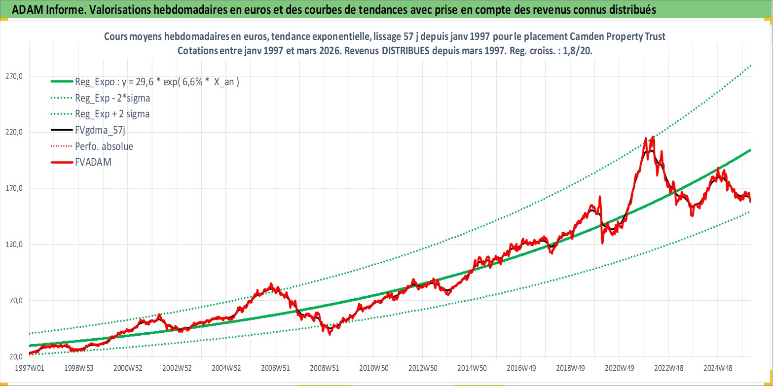 Site dédié aux investisseursPage dédiée sur site financeAnalyse des valorisations hebdomadaires de l'action Camden Property Trust. Cet actif est cote en USD. Les valorisations sont en contrevaleur EURO et couvrent les semaines 1997W01 a 2026W13. Les revenus de cet actif financier sont pris en compte depuis la semaine 1997W13. La note globale ESG de cet actif est estimee a 13.0 (apres rebasage entre 0 et 20).