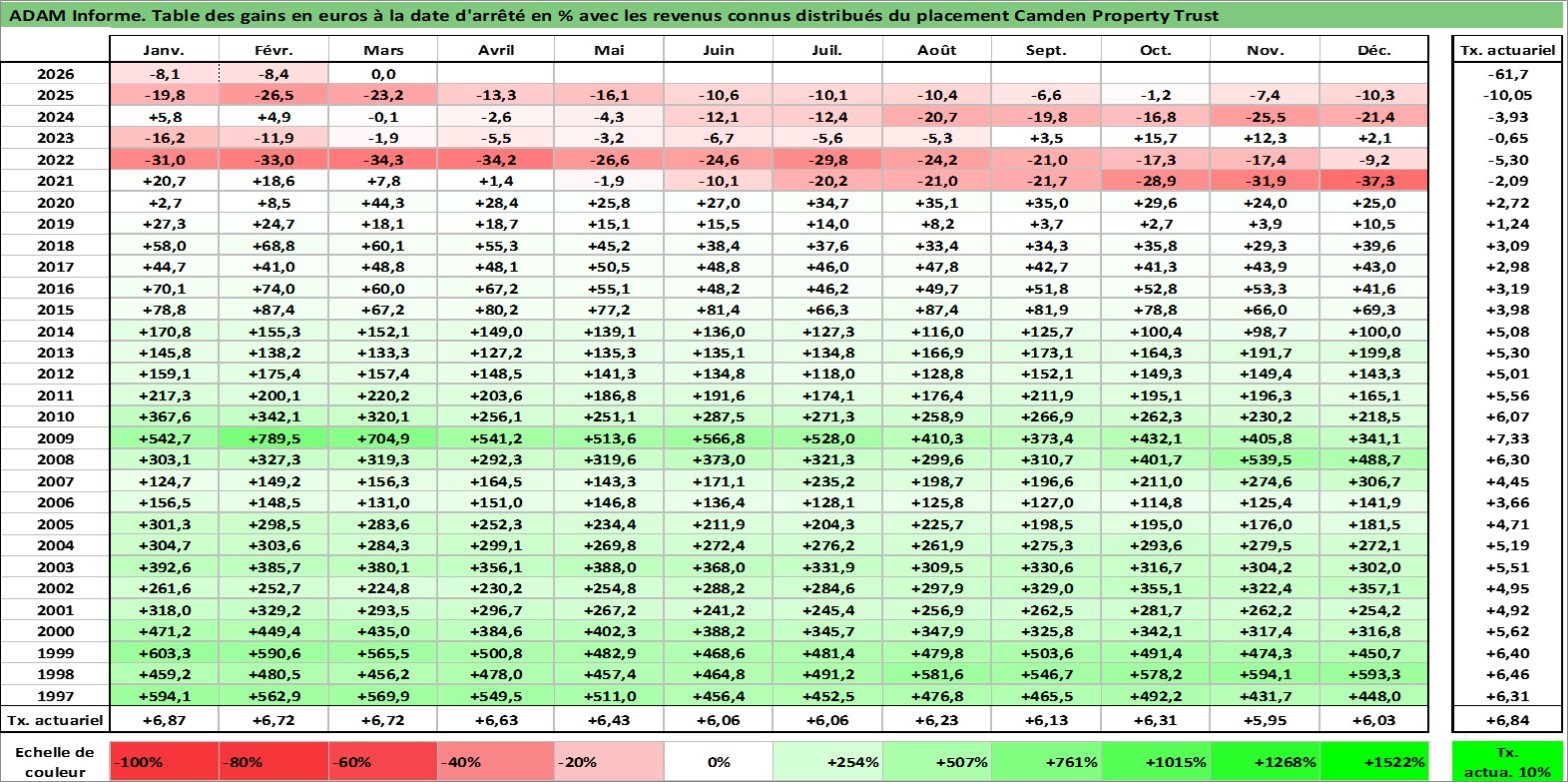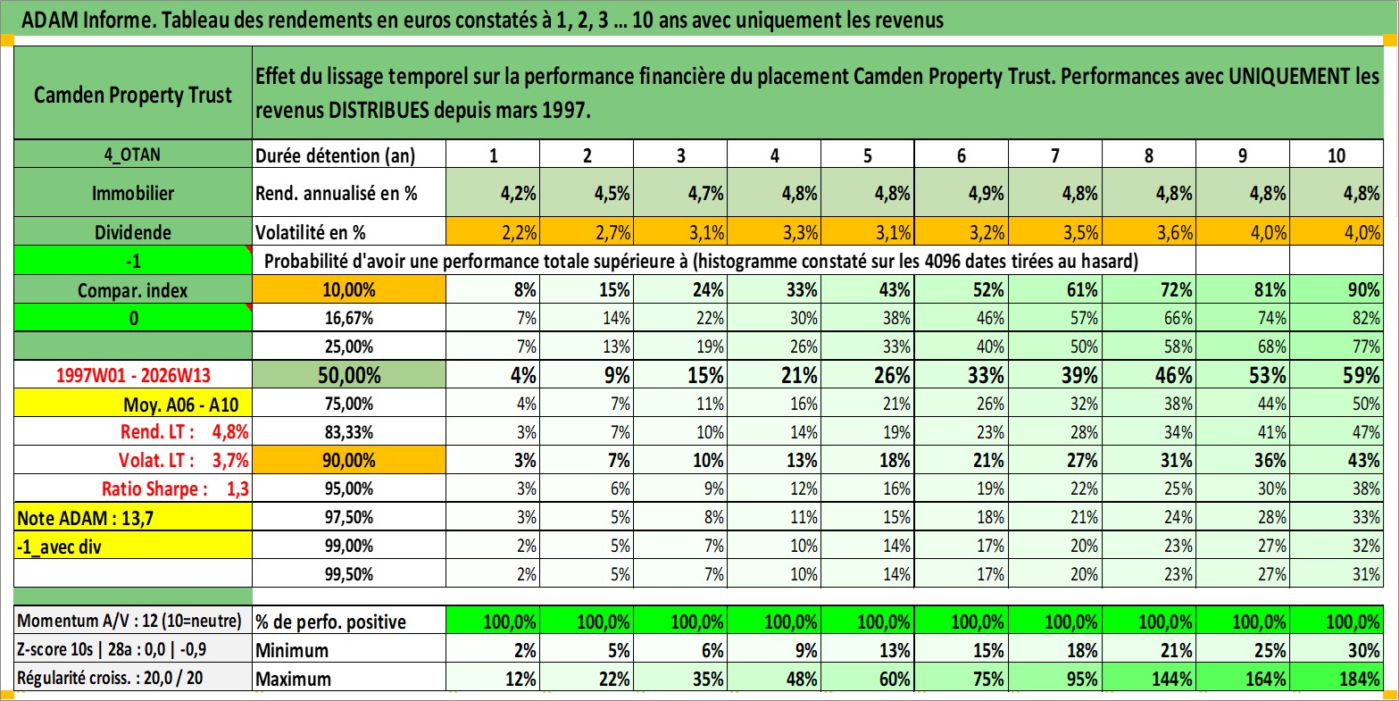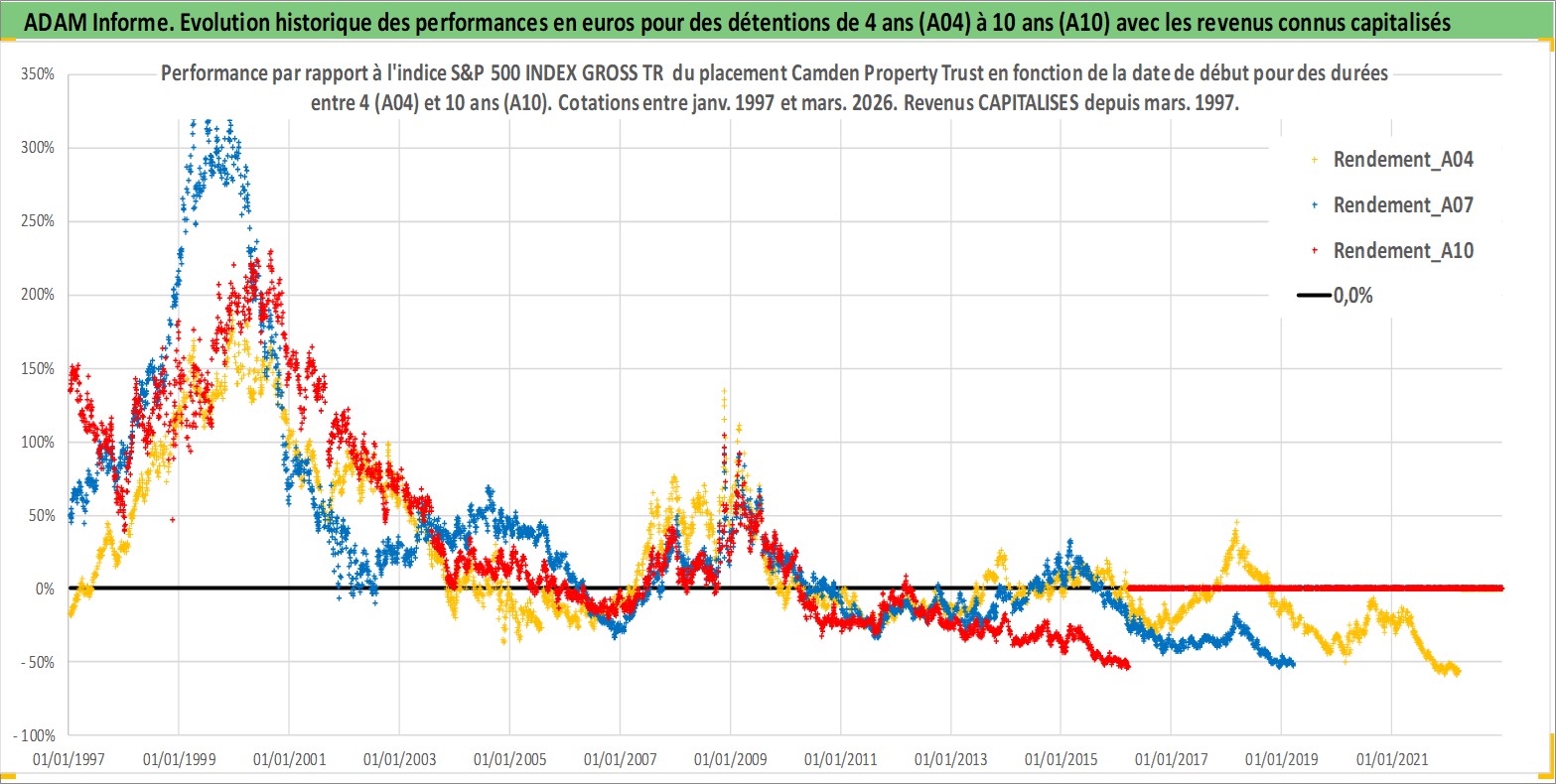 Site dédié aux investisseursPage dédiée sur site financeAnalyse des valorisations hebdomadaires de l'action Camden Property Trust. Cet actif est cote en USD. Les valorisations sont en contrevaleur EURO et couvrent les semaines 1997W01 a 2026W13. Les revenus de cet actif financier sont pris en compte depuis la semaine 1997W13. La note globale ESG de cet actif est estimee a 13.0 (apres rebasage entre 0 et 20).