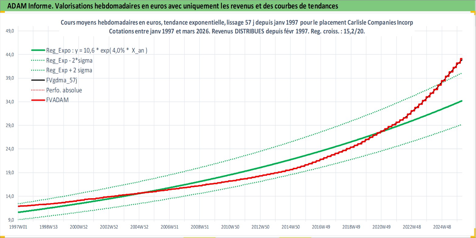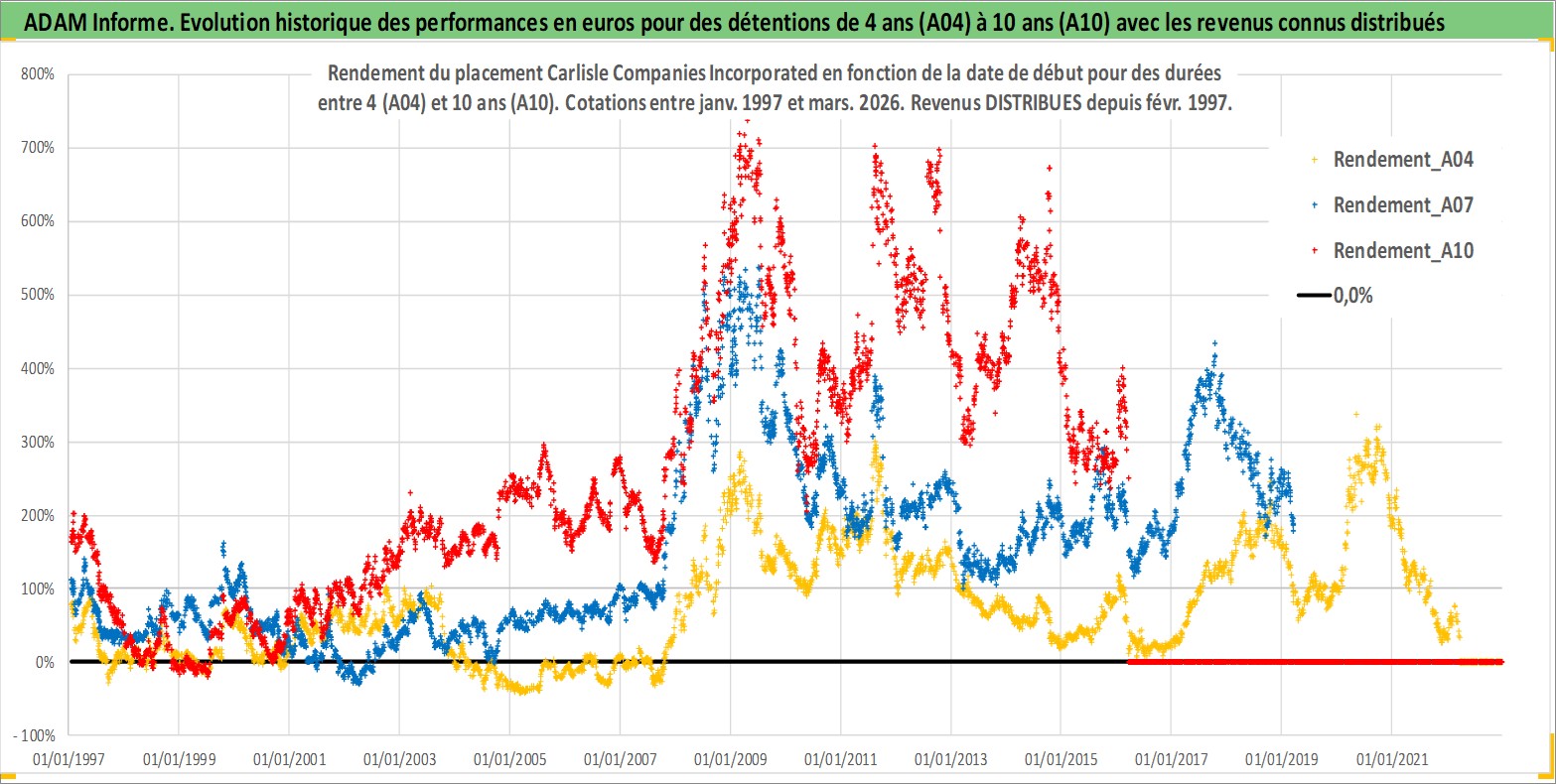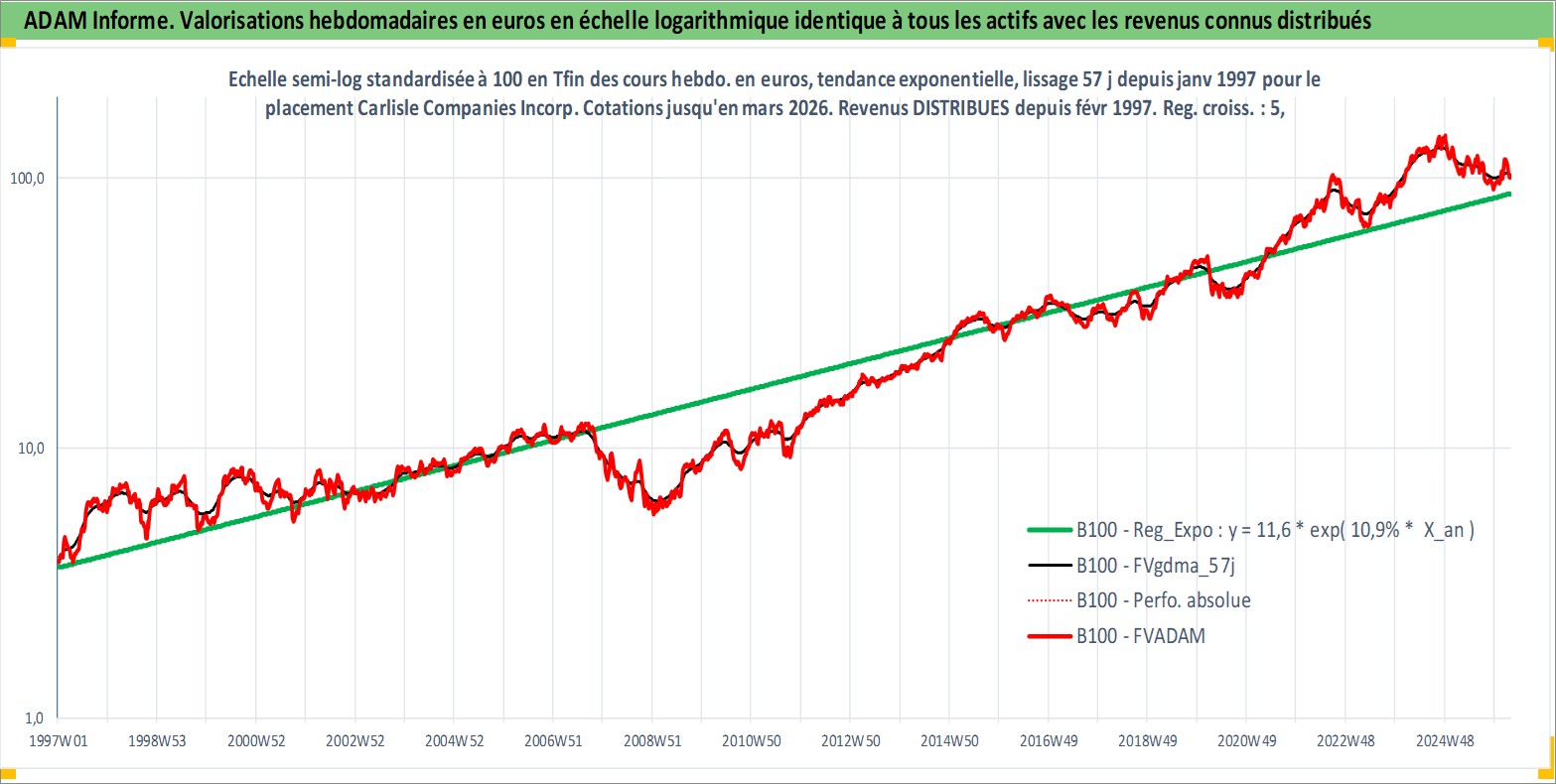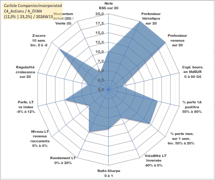 Site dédié aux investisseursPage dédiée sur site financeAnalyse des valorisations hebdomadaires de l'action Carlisle Companies Incorporated. Cet actif est cote en USD. Les valorisations sont en contrevaleur EURO et couvrent les semaines 1997W01 a 2026W13. Les revenus de cet actif financier sont pris en compte depuis la semaine 1997W08. La note globale ESG de cet actif est estimee a 10.0 (apres rebasage entre 0 et 20).