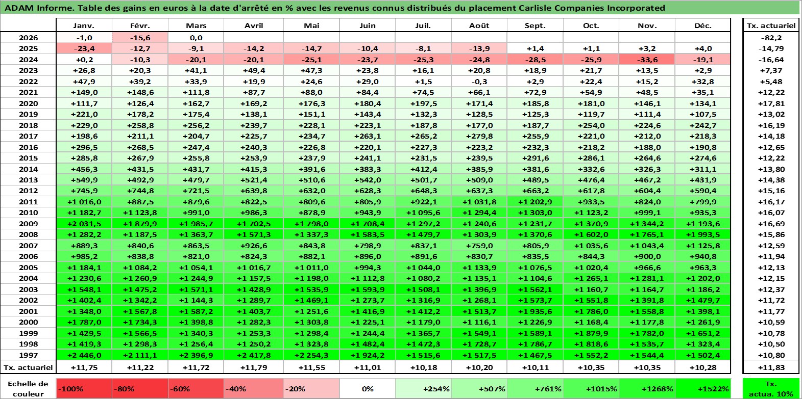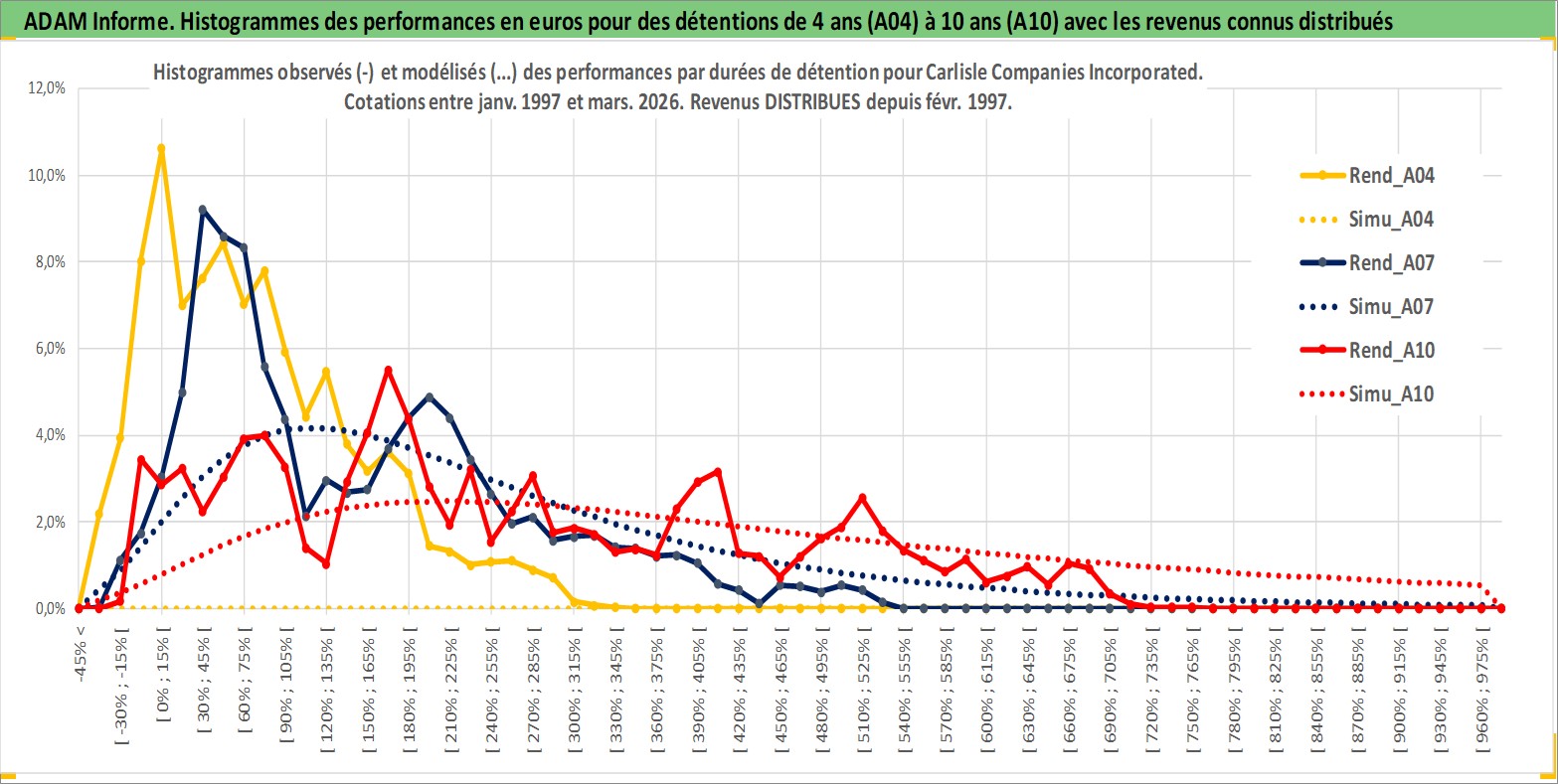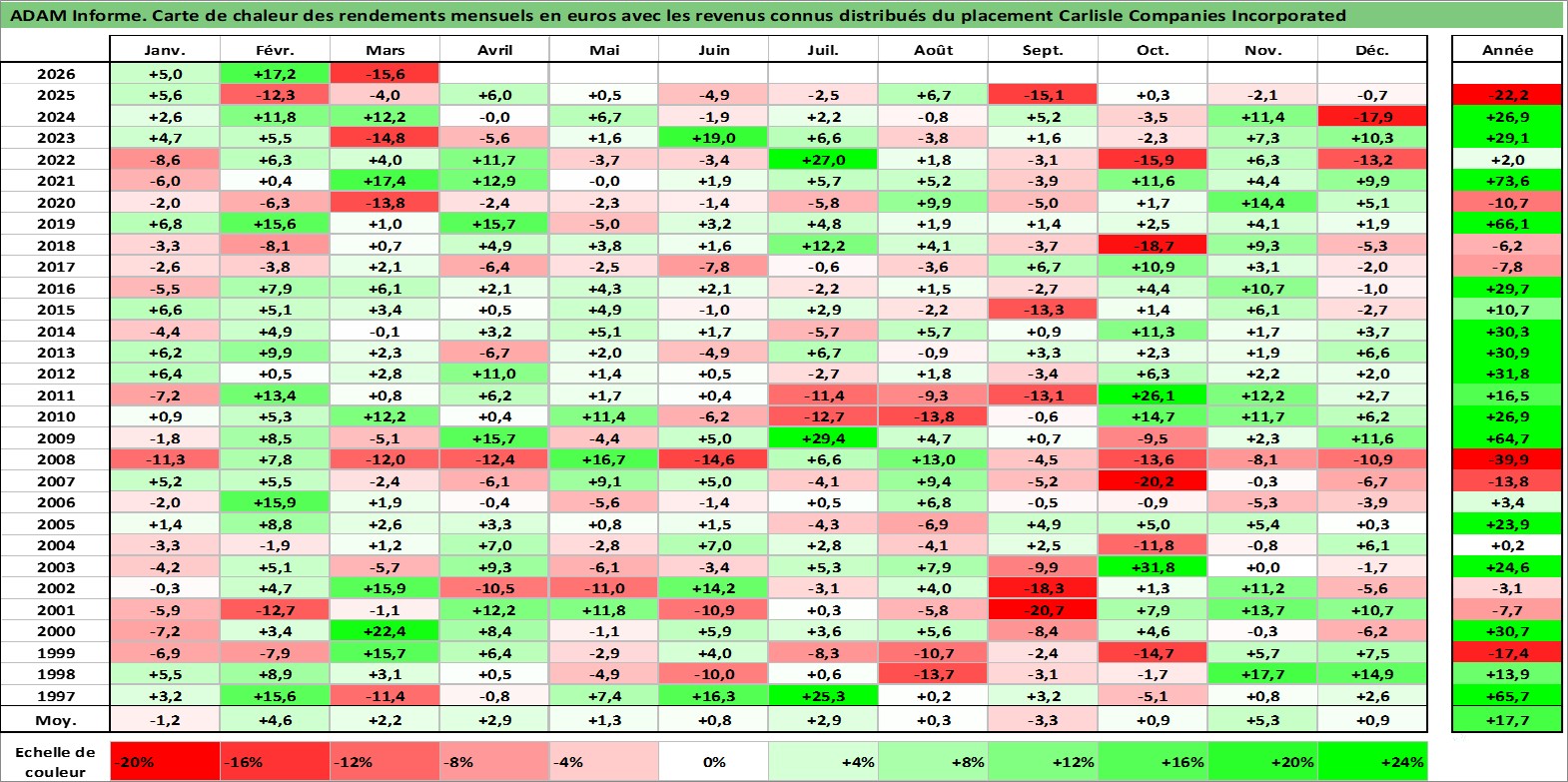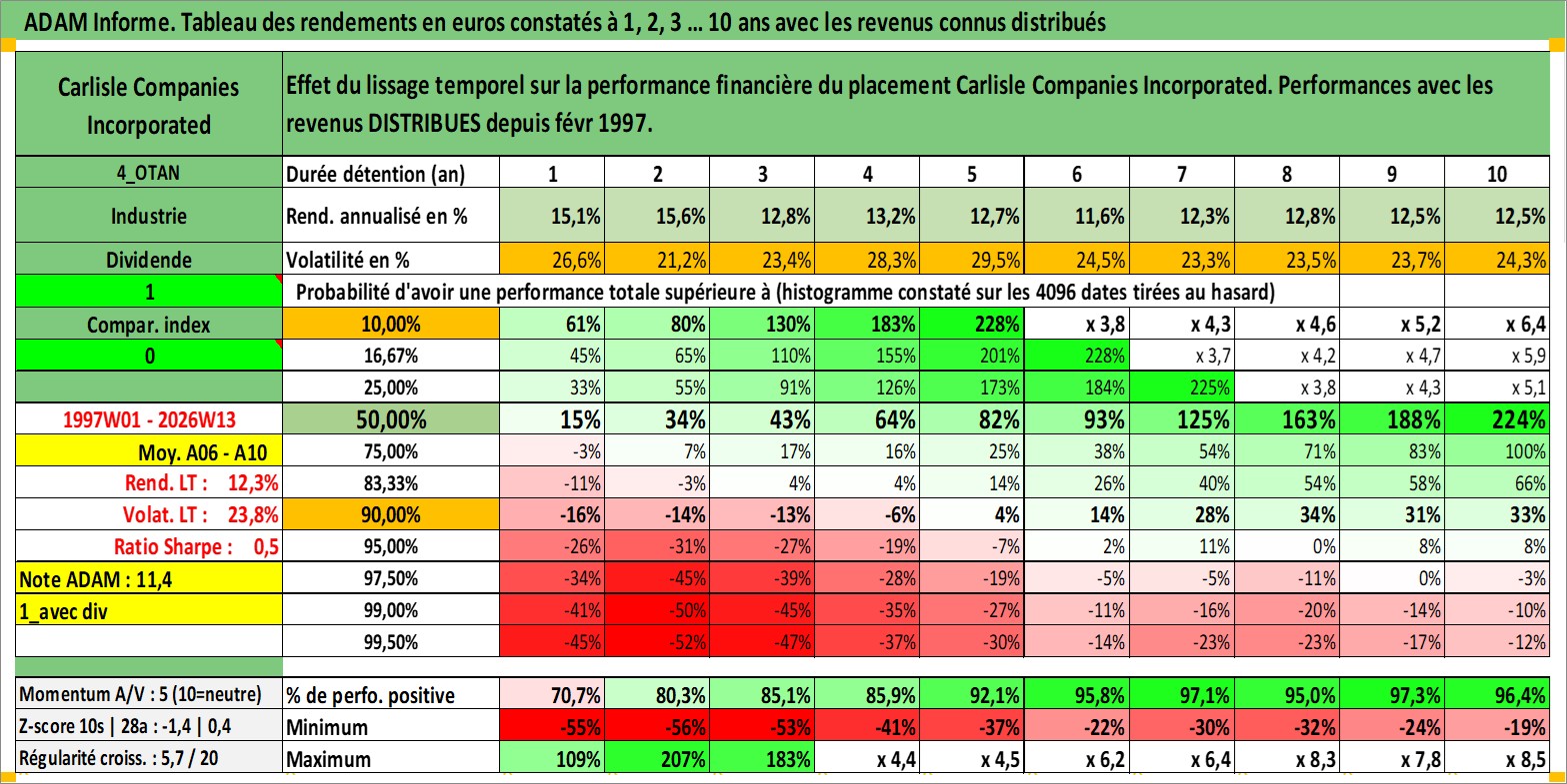 Site dédié aux investisseursPage dédiée sur site financeAnalyse des valorisations hebdomadaires de l'action Carlisle Companies Incorporated. Cet actif est cote en USD. Les valorisations sont en contrevaleur EURO et couvrent les semaines 1997W01 a 2026W13. Les revenus de cet actif financier sont pris en compte depuis la semaine 1997W08. La note globale ESG de cet actif est estimee a 10.0 (apres rebasage entre 0 et 20).