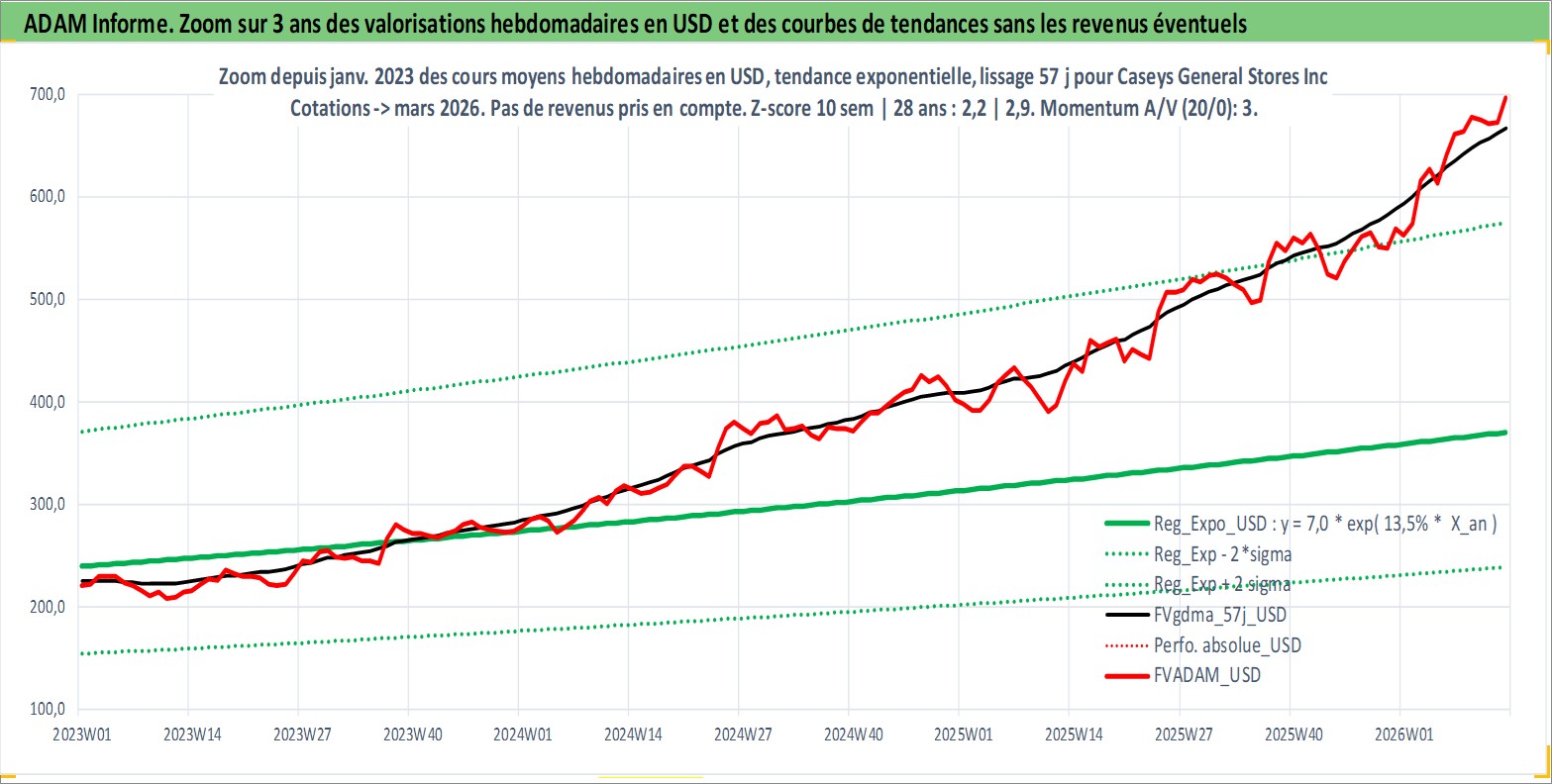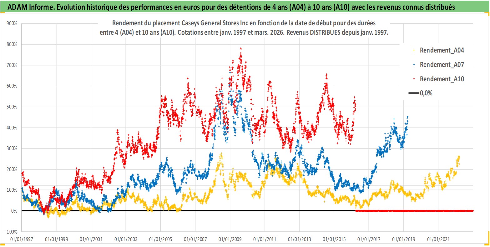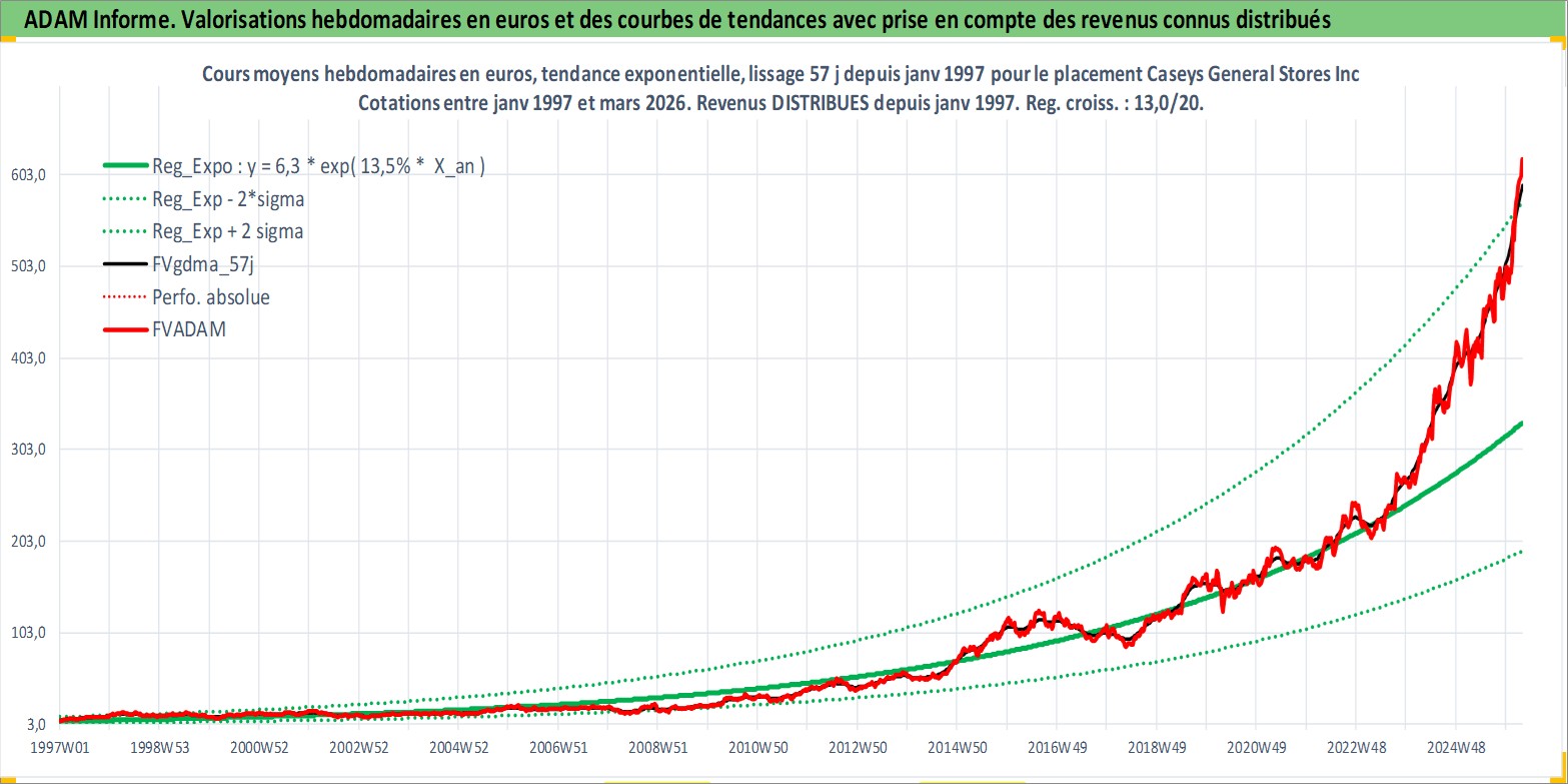 Site dédié aux investisseursPage dédiée sur site financeAnalyse des valorisations hebdomadaires de l'action Caseys General Stores Inc. Cet actif est cote en USD. Les valorisations sont en contrevaleur EURO et couvrent les semaines 1997W01 a 2026W13. Les revenus de cet actif financier sont pris en compte depuis la semaine 1997W05. La note ESG de cet actif n'est pas connue.