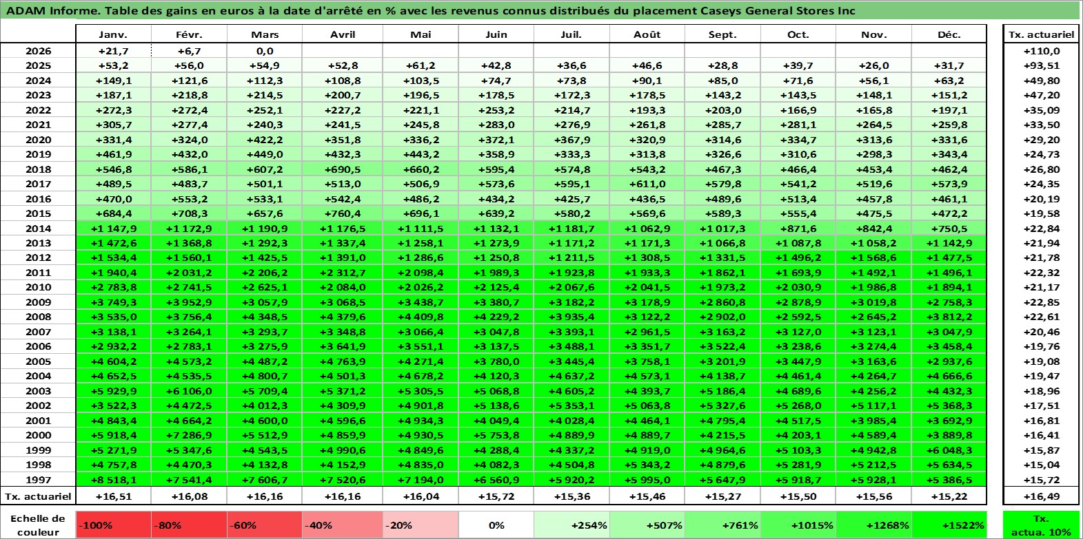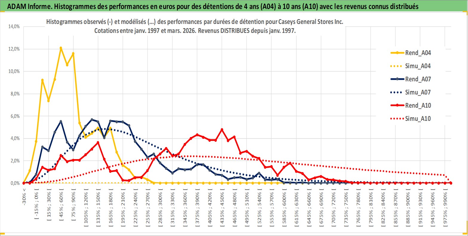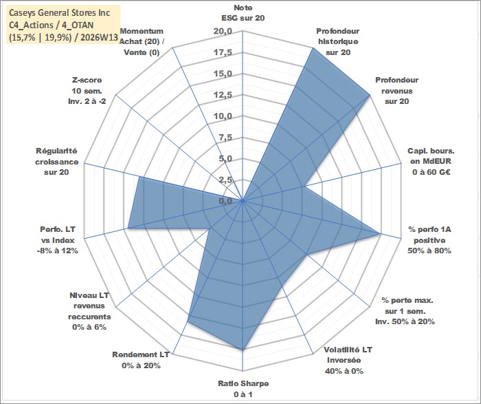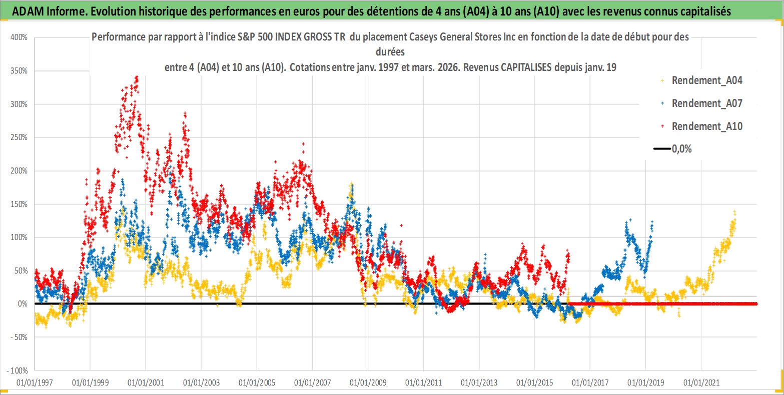 Site dédié aux investisseursPage dédiée sur site financeAnalyse des valorisations hebdomadaires de l'action Caseys General Stores Inc. Cet actif est cote en USD. Les valorisations sont en contrevaleur EURO et couvrent les semaines 1997W01 a 2026W13. Les revenus de cet actif financier sont pris en compte depuis la semaine 1997W05. La note ESG de cet actif n'est pas connue.