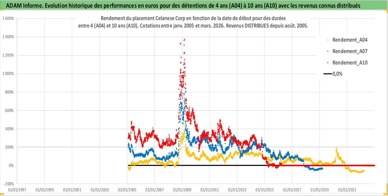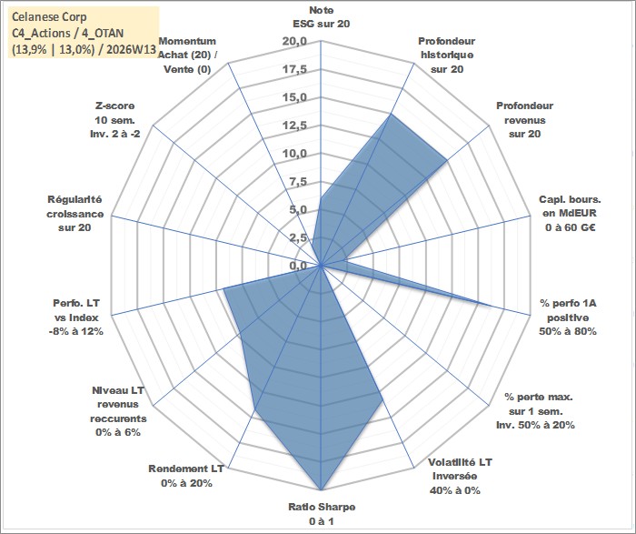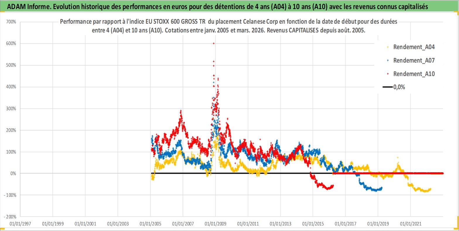 Site dédié aux investisseursPage dédiée sur site financeAnalyse des valorisations hebdomadaires de l'action Celanese Corp. Cet actif est cote en USD. Les valorisations sont en contrevaleur EURO et couvrent les semaines 2005W03 a 2026W13. Les revenus de cet actif financier sont pris en compte depuis la semaine 2005W31. La note globale ESG de cet actif est estimee a 6.0 (apres rebasage entre 0 et 20).