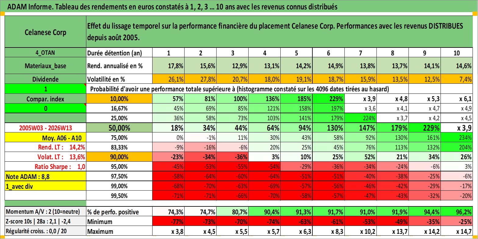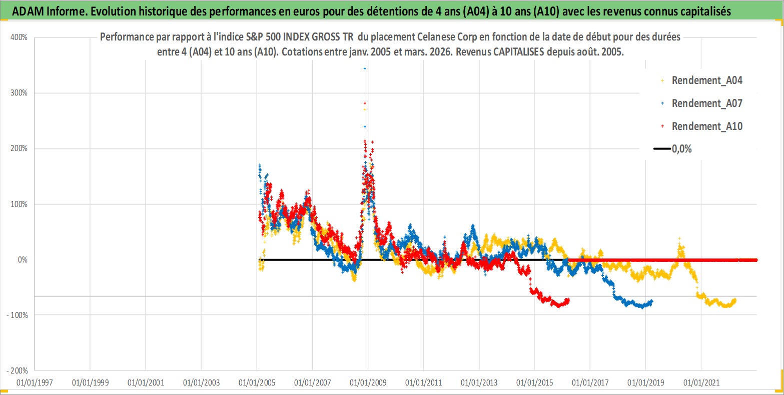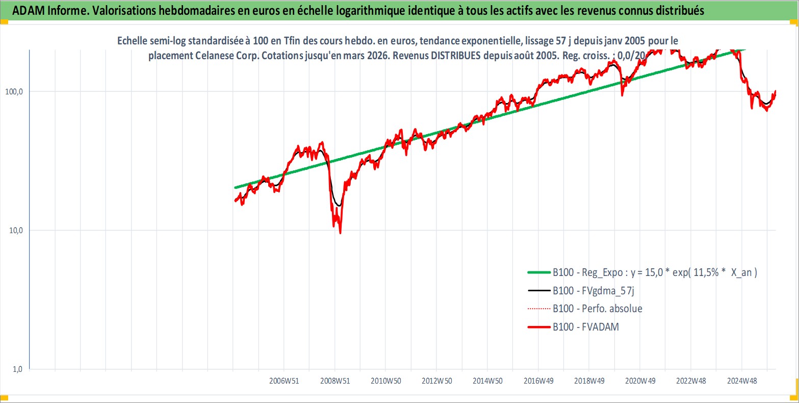 Site dédié aux investisseursPage dédiée sur site financeAnalyse des valorisations hebdomadaires de l'action Celanese Corp. Cet actif est cote en USD. Les valorisations sont en contrevaleur EURO et couvrent les semaines 2005W03 a 2026W13. Les revenus de cet actif financier sont pris en compte depuis la semaine 2005W31. La note globale ESG de cet actif est estimee a 6.0 (apres rebasage entre 0 et 20).
