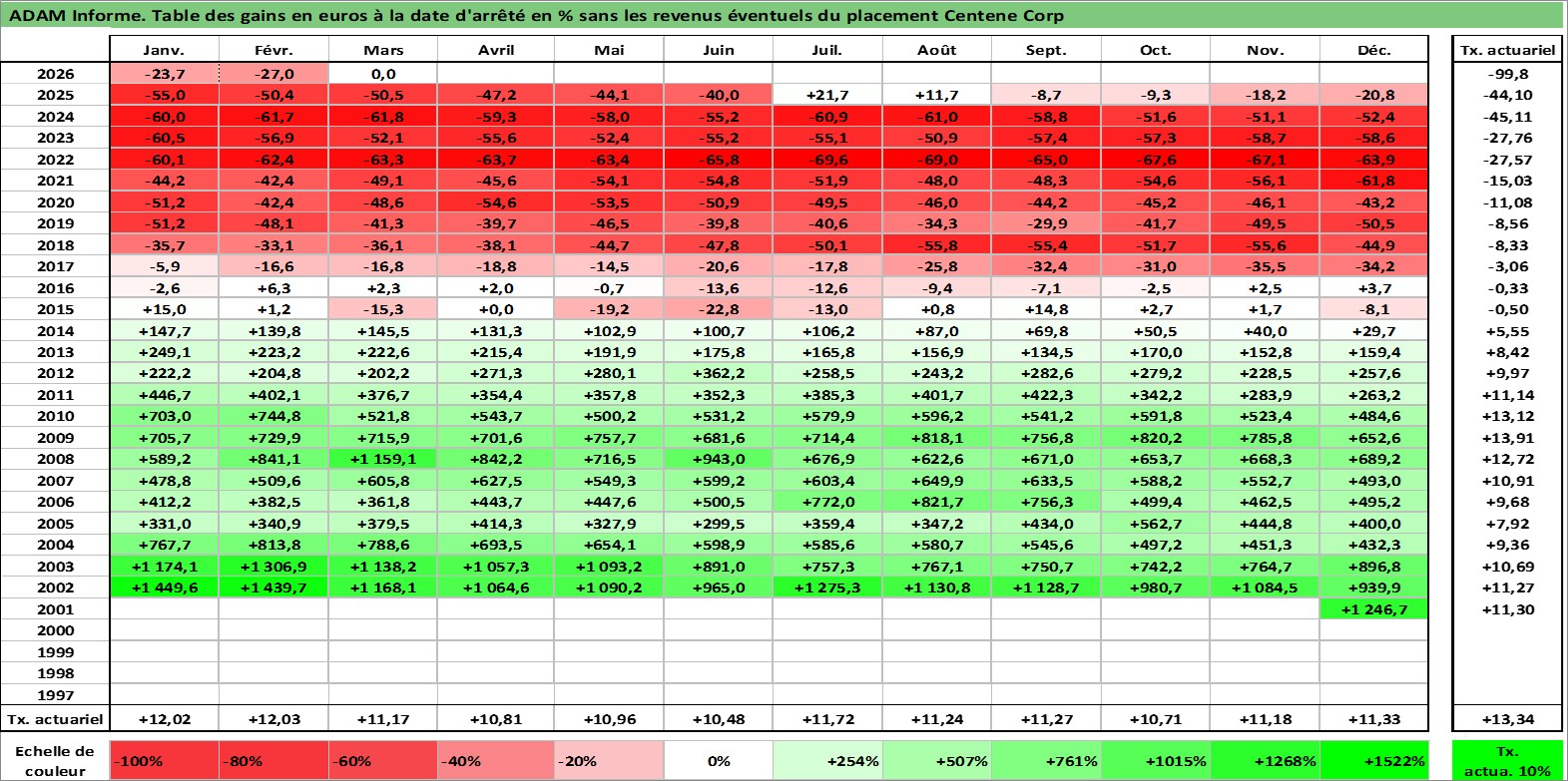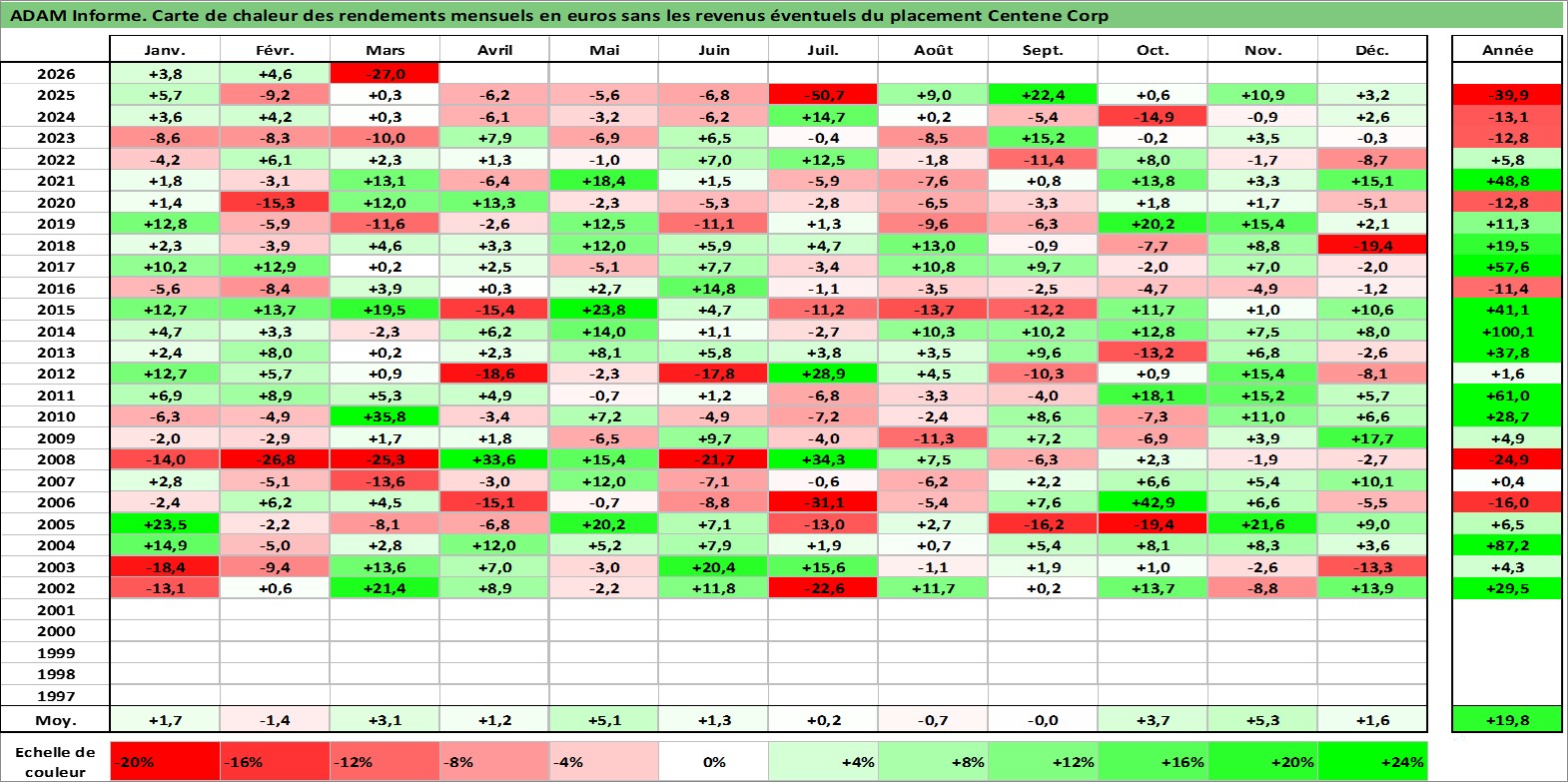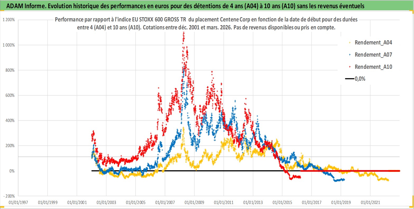 Site dédié aux investisseursPage dédiée sur site financeAnalyse des valorisations hebdomadaires de l'action Centene Corp. Cet actif est cote en USD. Les valorisations sont en contrevaleur EURO et couvrent les semaines 2001W50 a 2026W13. Les revenus de cet actif financier ne sont pas connus car non existants ou non disponibles sur le site Yahoo Finance. La note globale ESG de cet actif est estimee a 10.0 (apres rebasage entre 0 et 20).