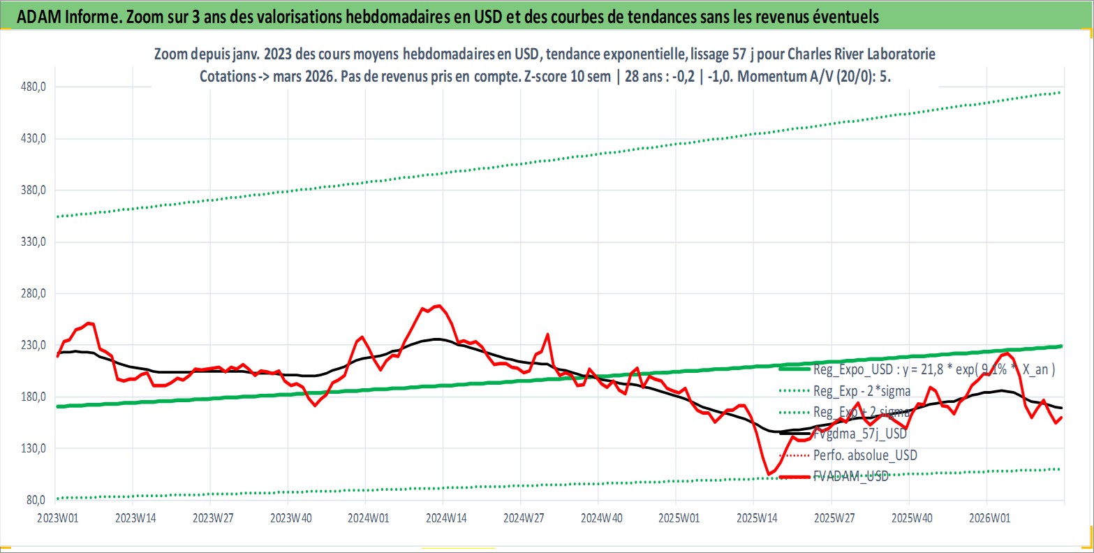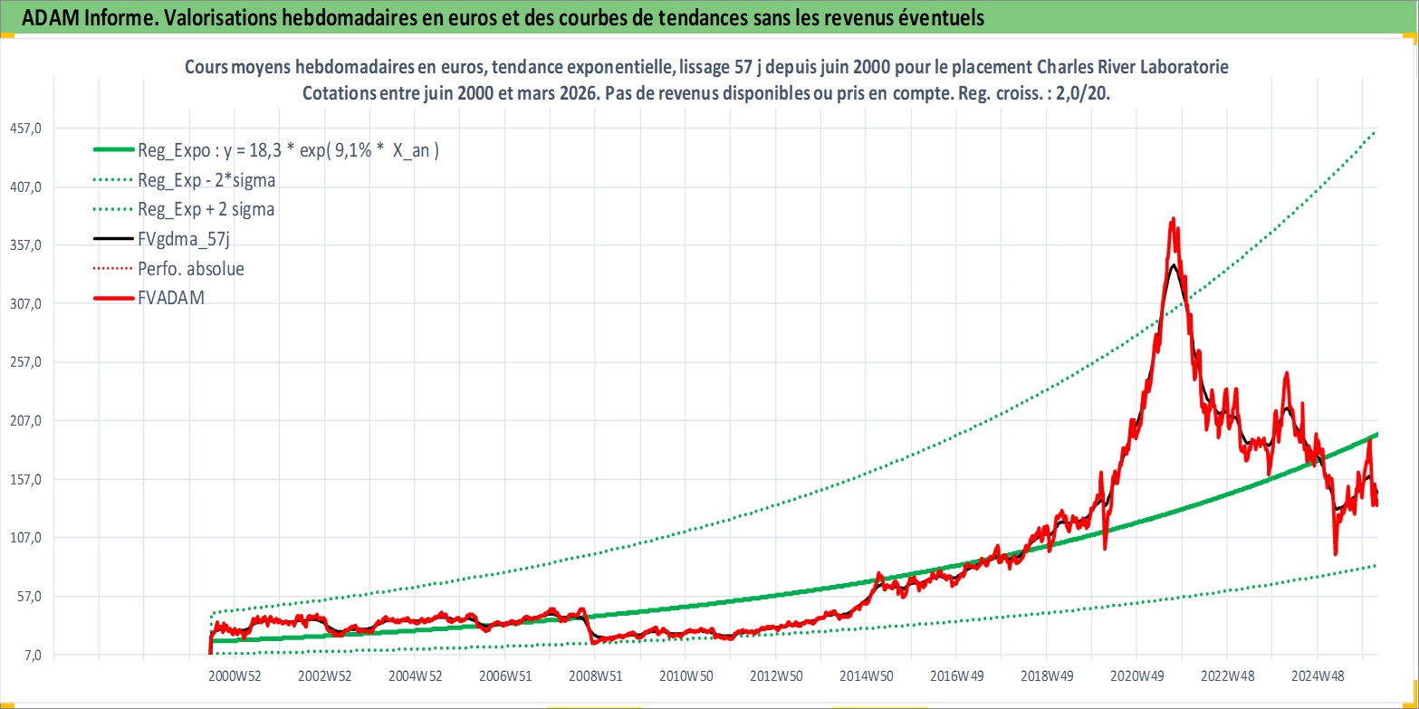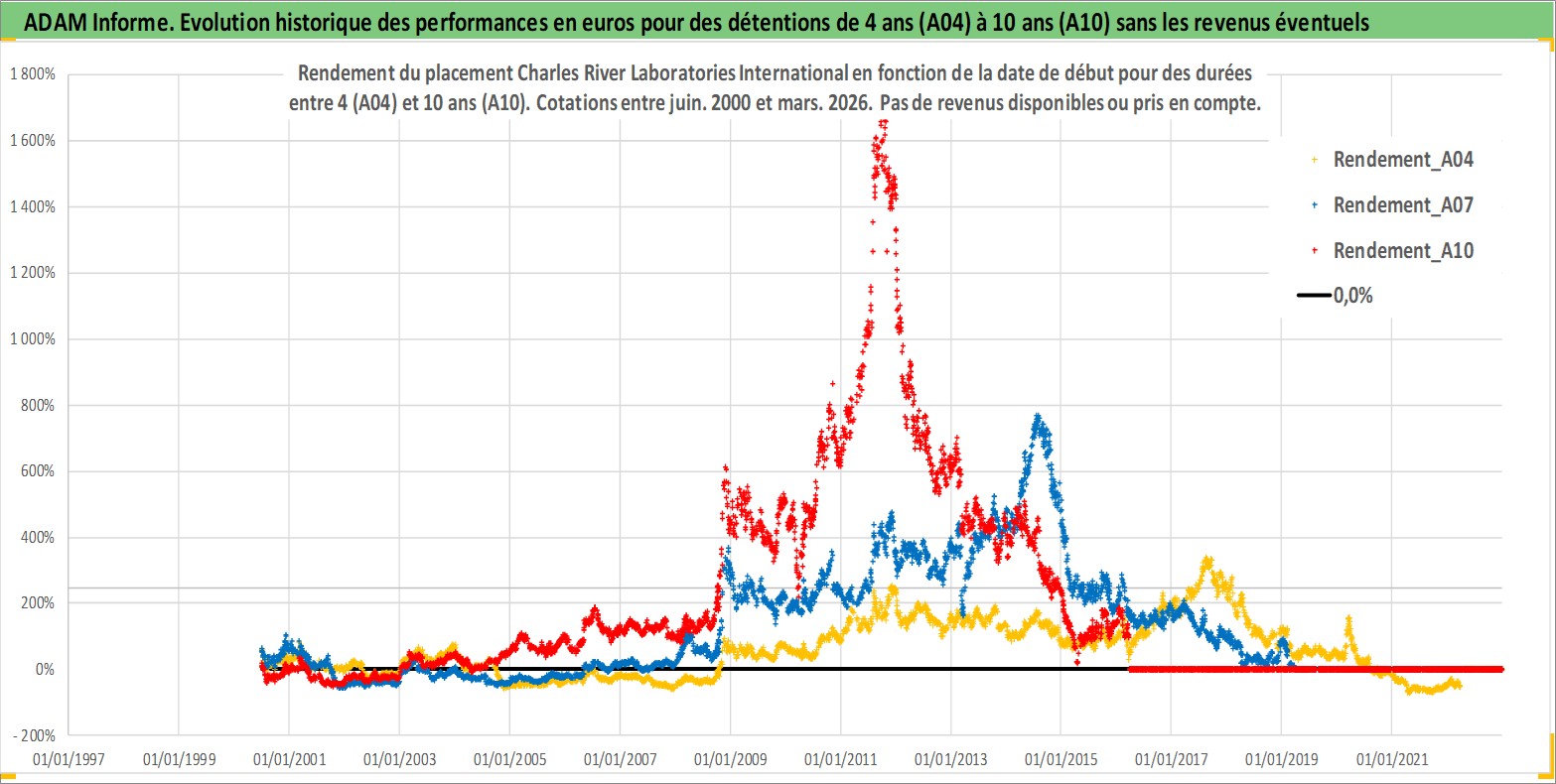 Site dédié aux investisseursPage dédiée sur site financeAnalyse des valorisations hebdomadaires de l'action Charles River Laboratories International. Cet actif est cote en USD. Les valorisations sont en contrevaleur EURO et couvrent les semaines 2000W25 a 2026W13. Les revenus de cet actif financier ne sont pas connus car non existants ou non disponibles sur le site Yahoo Finance. La note ESG de cet actif n'est pas connue.
