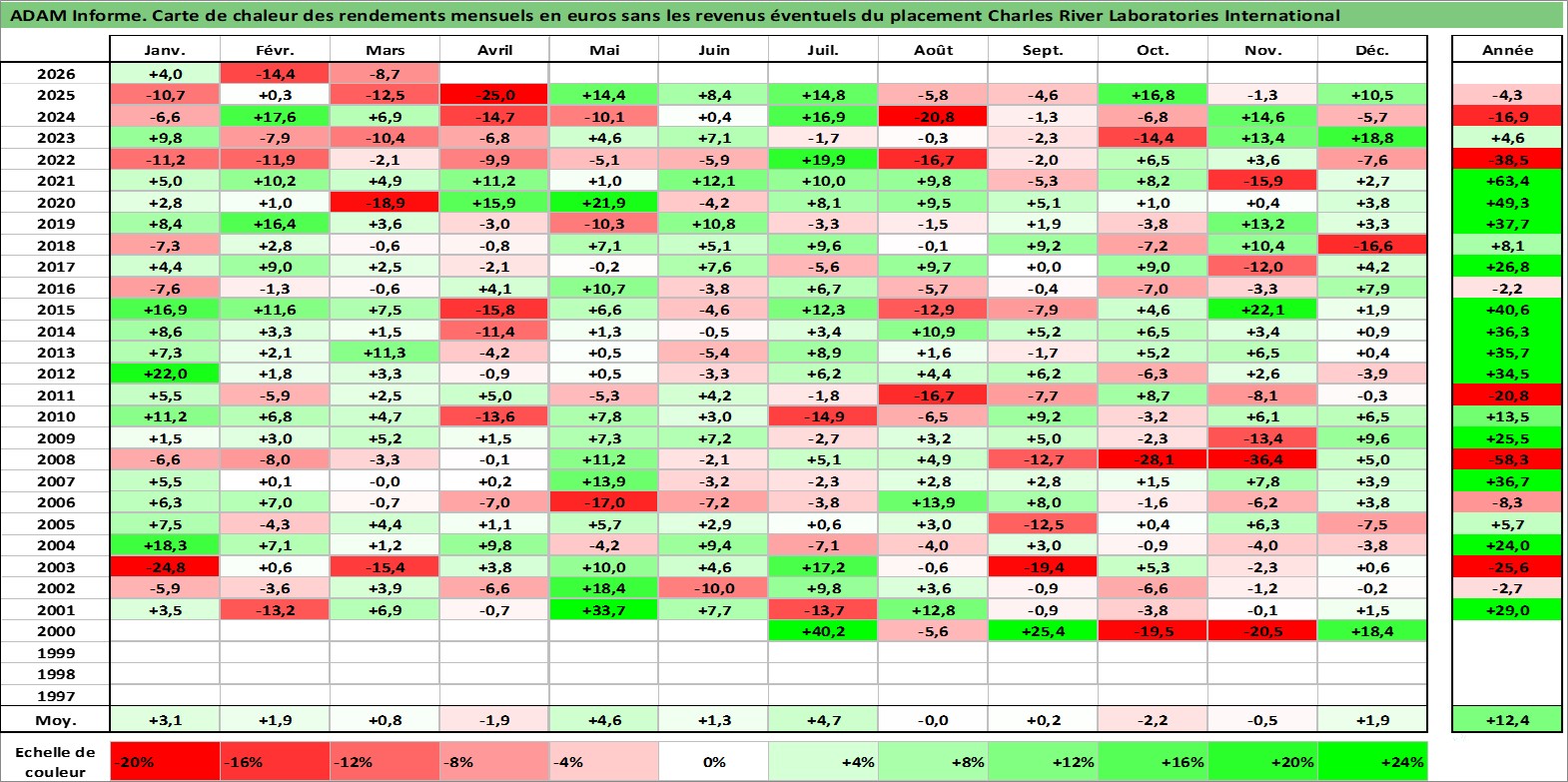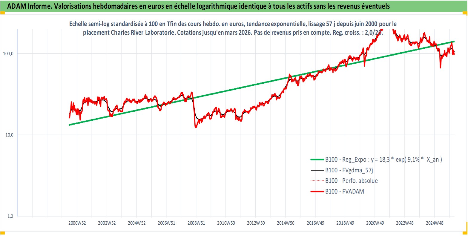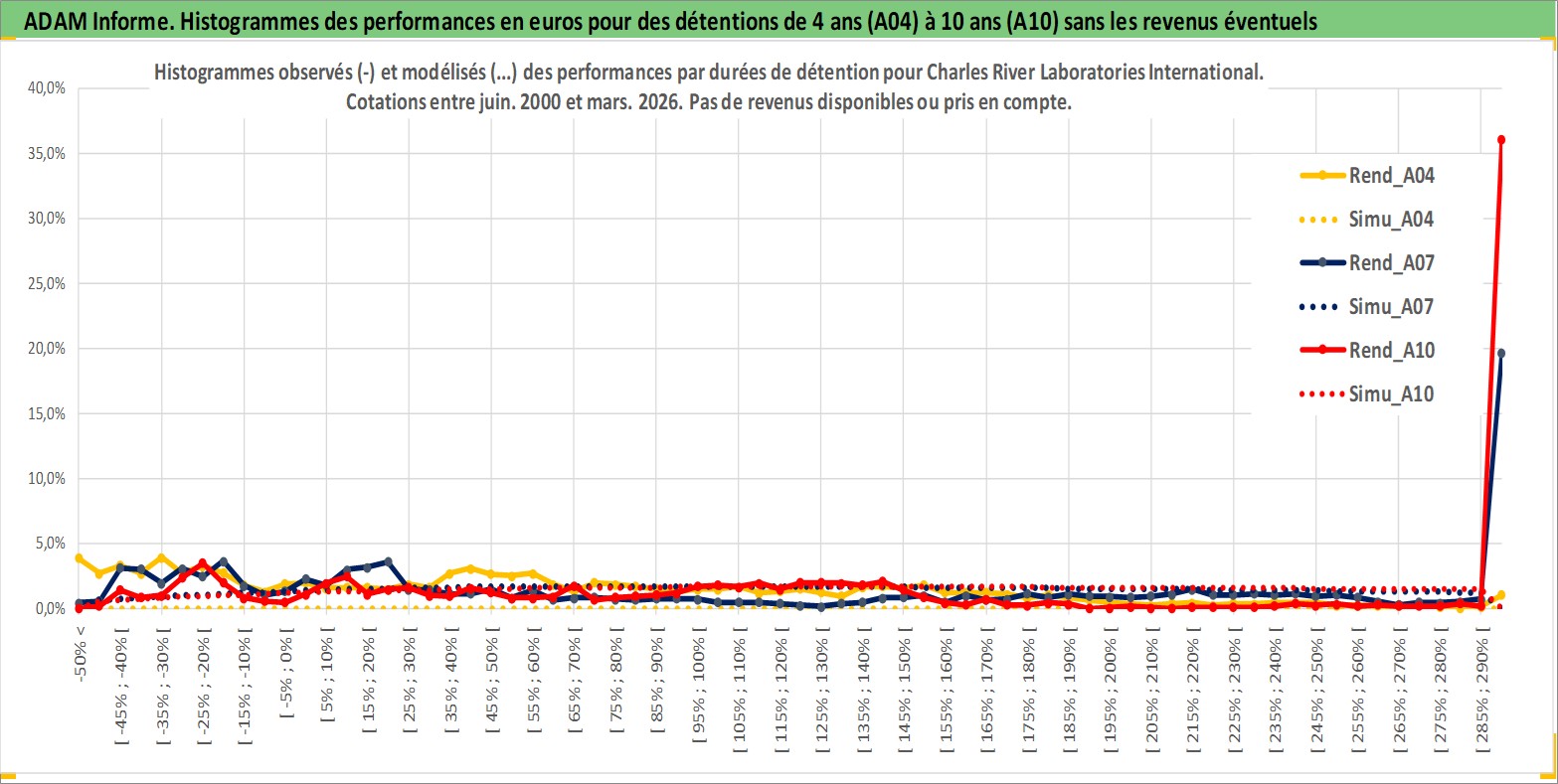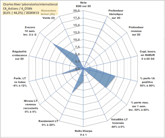 Site dédié aux investisseursPage dédiée sur site financeAnalyse des valorisations hebdomadaires de l'action Charles River Laboratories International. Cet actif est cote en USD. Les valorisations sont en contrevaleur EURO et couvrent les semaines 2000W25 a 2026W13. Les revenus de cet actif financier ne sont pas connus car non existants ou non disponibles sur le site Yahoo Finance. La note ESG de cet actif n'est pas connue.