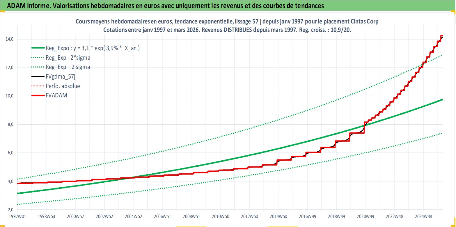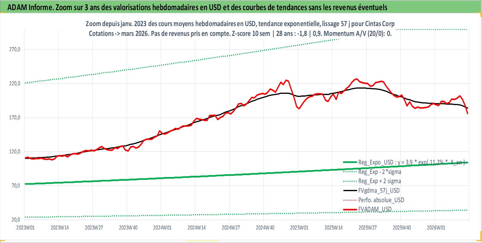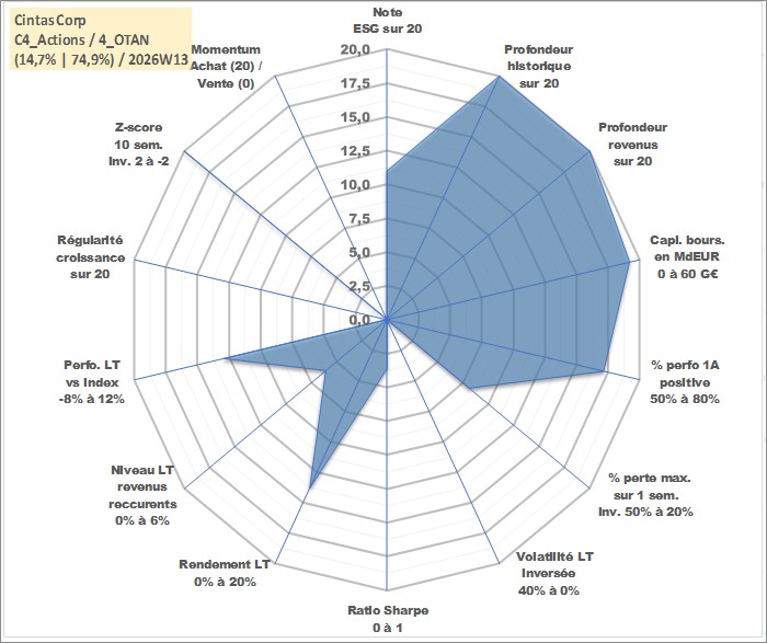 Site dédié aux investisseursPage dédiée sur site financeAnalyse des valorisations hebdomadaires de l'action Cintas Corp. Cet actif est cote en USD. Les valorisations sont en contrevaleur EURO et couvrent les semaines 1997W01 a 2026W13. Les revenus de cet actif financier sont pris en compte depuis la semaine 1997W10. La note globale ESG de cet actif est estimee a 11.0 (apres rebasage entre 0 et 20).