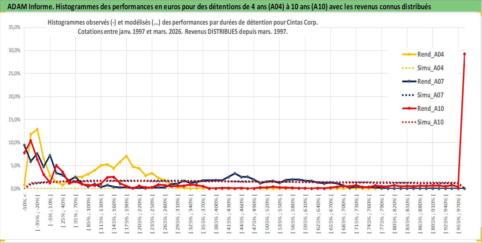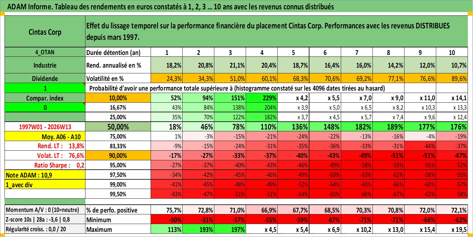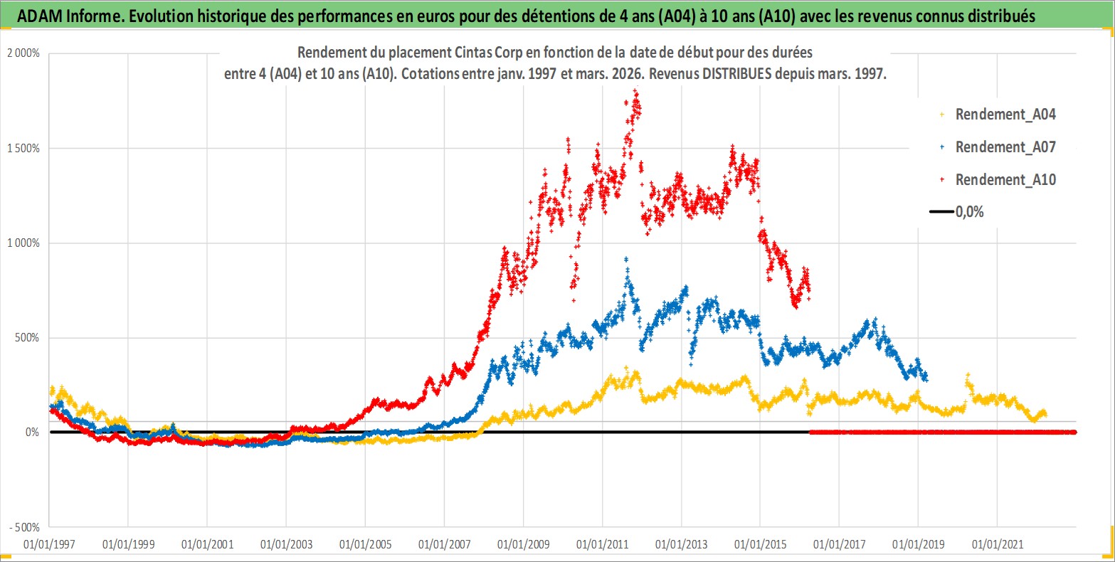 Site dédié aux investisseursPage dédiée sur site financeAnalyse des valorisations hebdomadaires de l'action Cintas Corp. Cet actif est cote en USD. Les valorisations sont en contrevaleur EURO et couvrent les semaines 1997W01 a 2026W13. Les revenus de cet actif financier sont pris en compte depuis la semaine 1997W10. La note globale ESG de cet actif est estimee a 11.0 (apres rebasage entre 0 et 20).