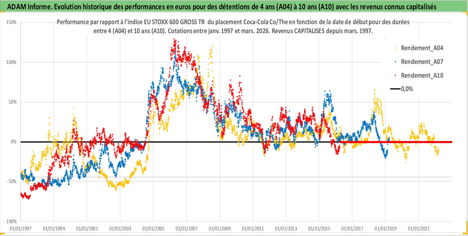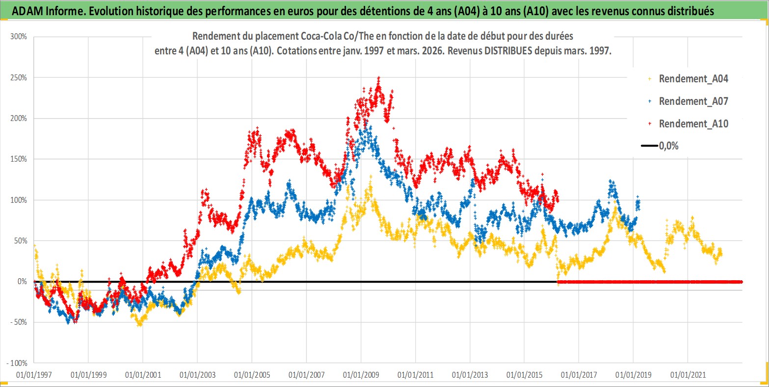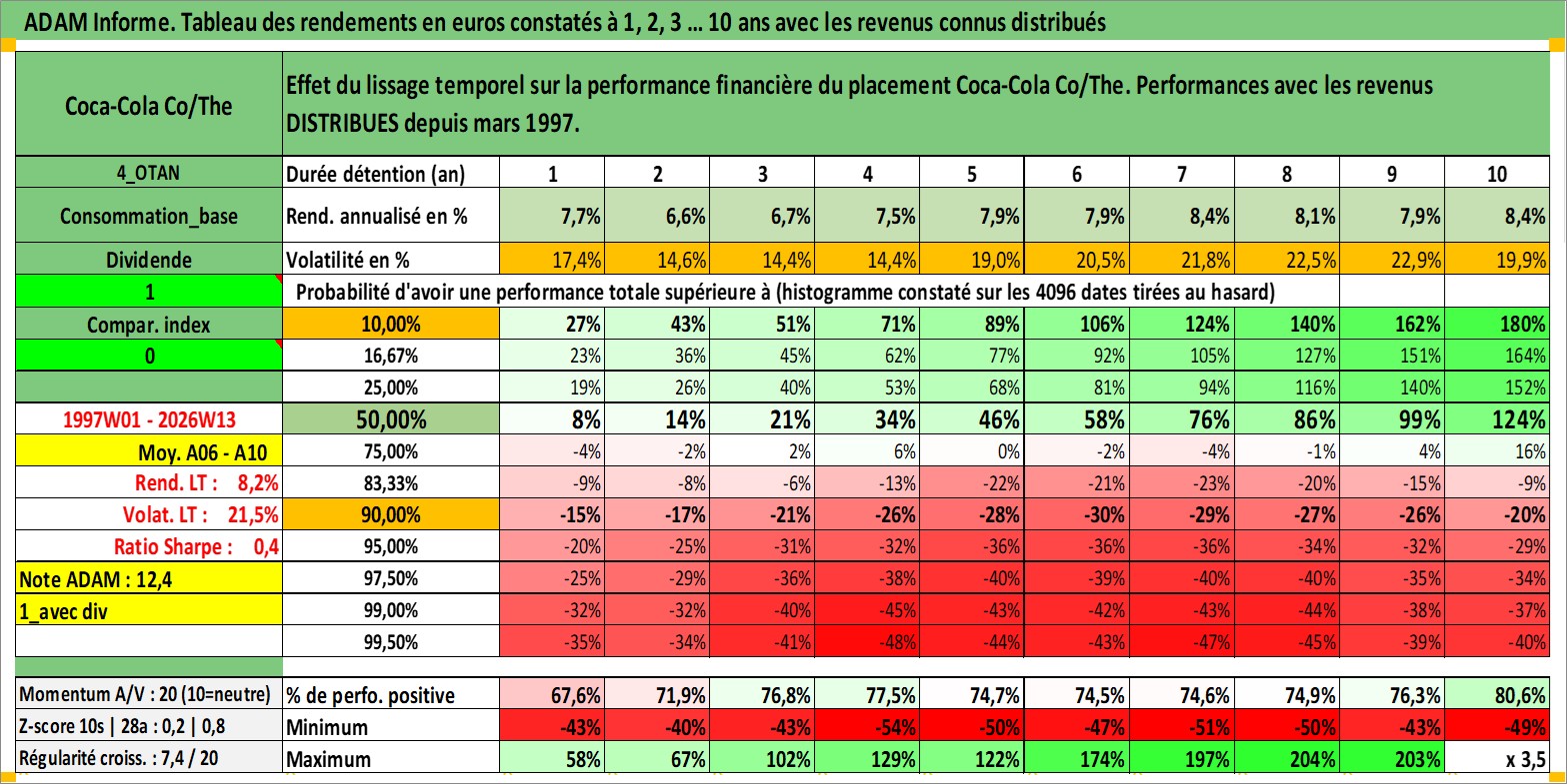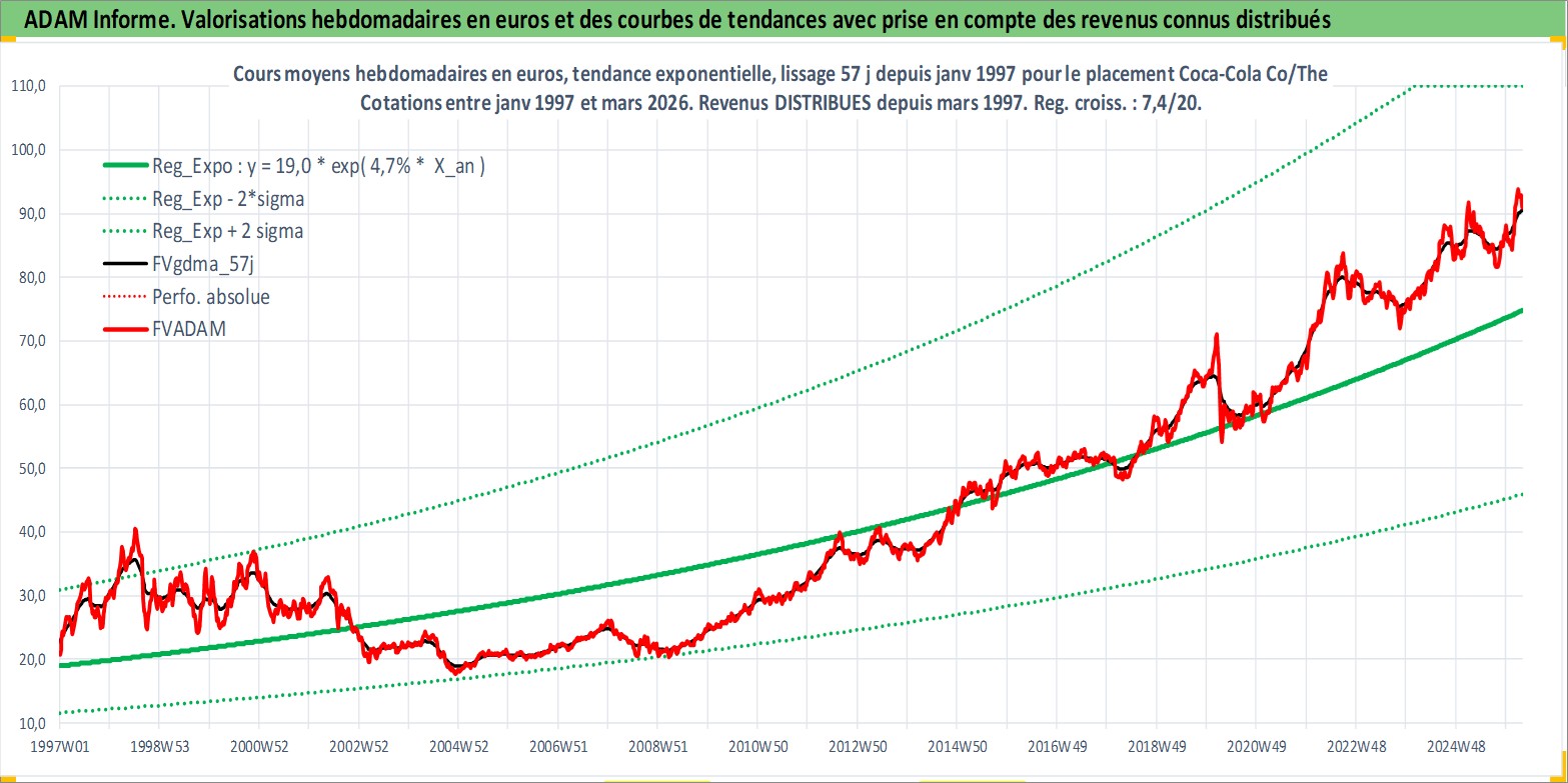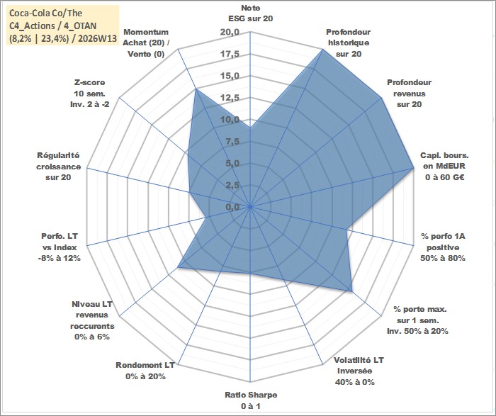 Site dédié aux investisseursPage dédiée sur site financeAnalyse des valorisations hebdomadaires de l'action Coca-Cola Co/The. Cet actif est cote en USD. Les valorisations sont en contrevaleur EURO et couvrent les semaines 1997W01 a 2026W13. Les revenus de cet actif financier sont pris en compte depuis la semaine 1997W11. La note globale ESG de cet actif est estimee a 9.0 (apres rebasage entre 0 et 20).