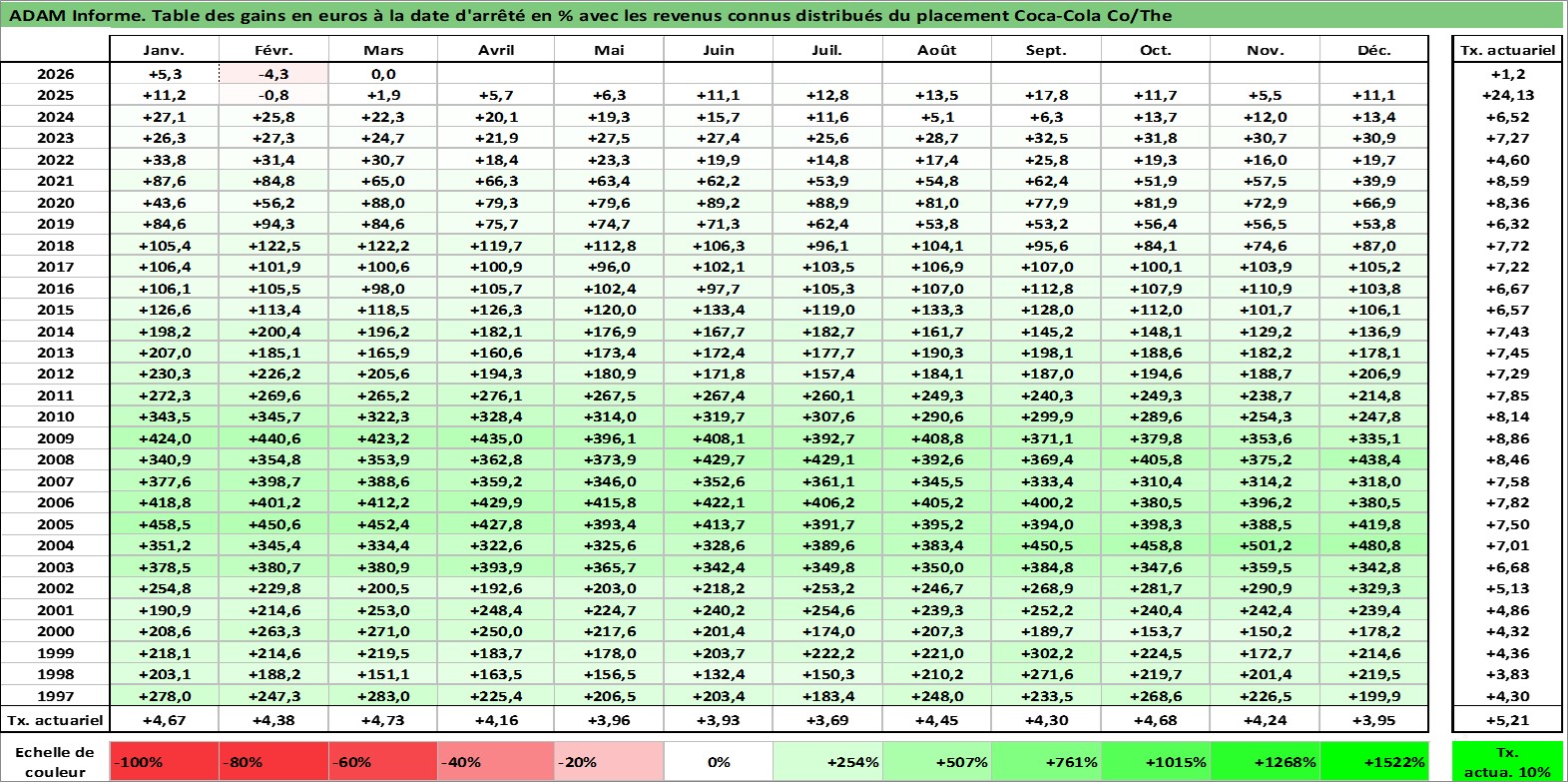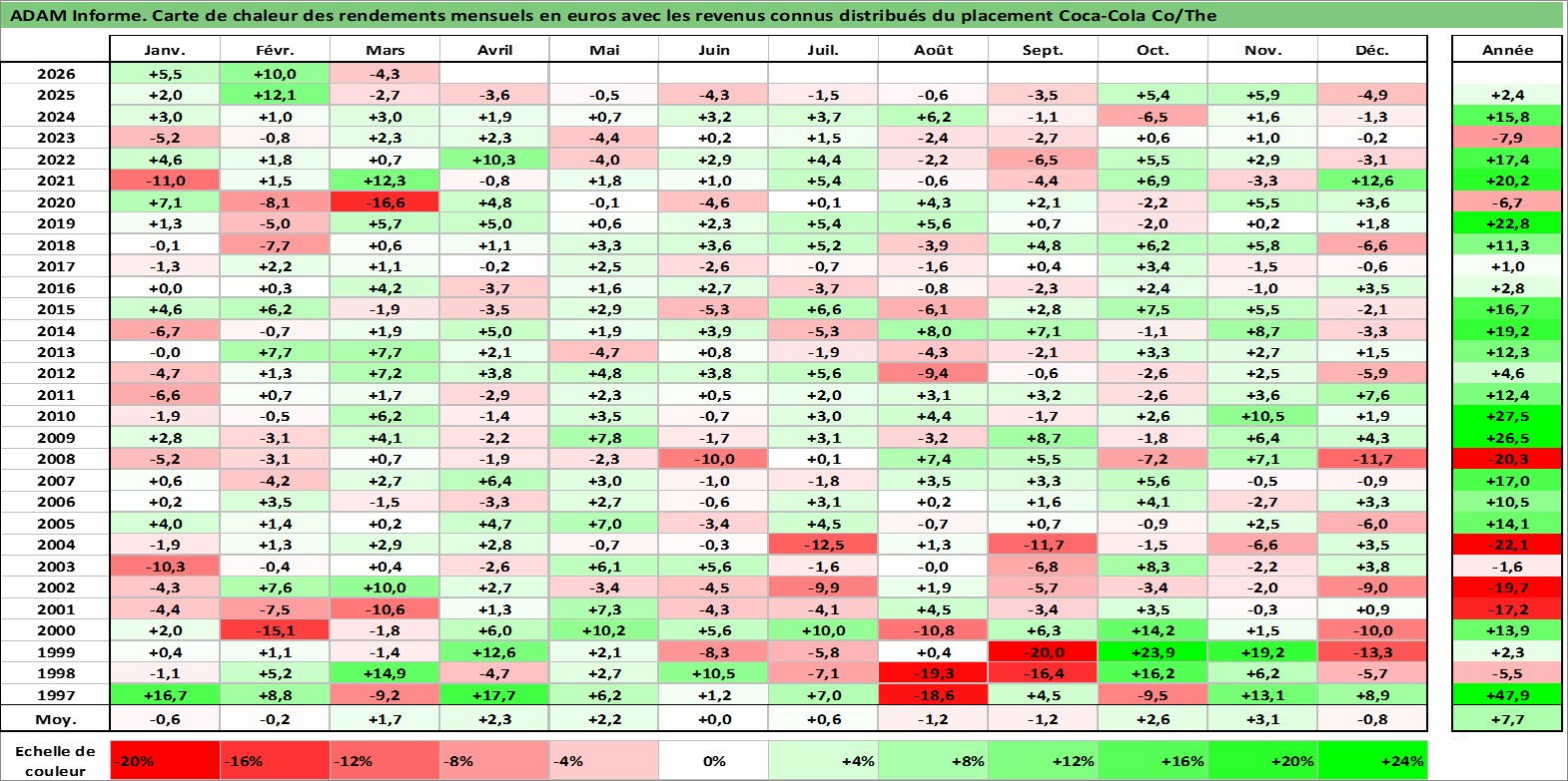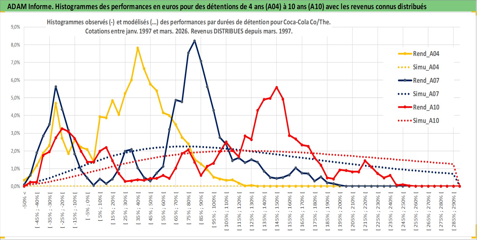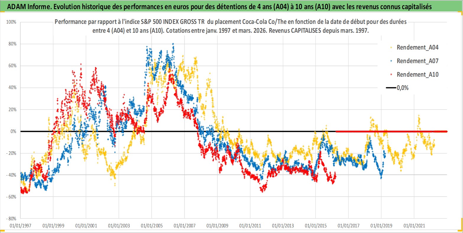 Site dédié aux investisseursPage dédiée sur site financeAnalyse des valorisations hebdomadaires de l'action Coca-Cola Co/The. Cet actif est cote en USD. Les valorisations sont en contrevaleur EURO et couvrent les semaines 1997W01 a 2026W13. Les revenus de cet actif financier sont pris en compte depuis la semaine 1997W11. La note globale ESG de cet actif est estimee a 9.0 (apres rebasage entre 0 et 20).