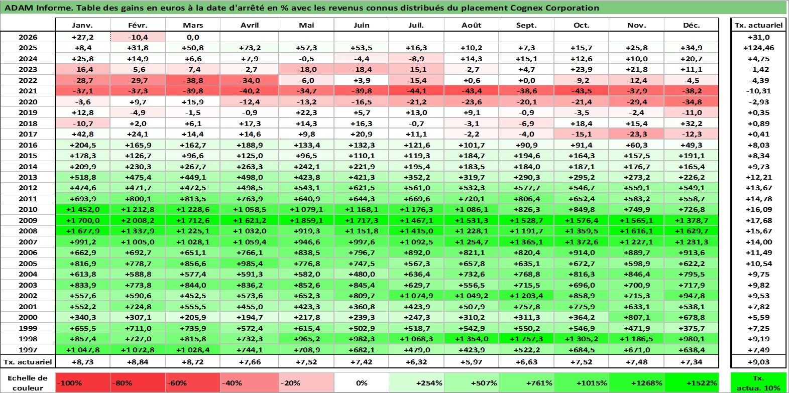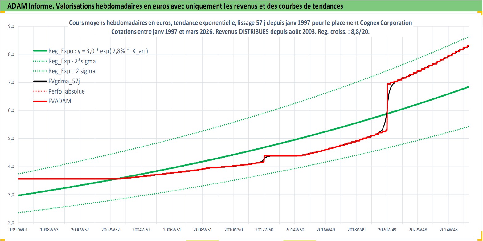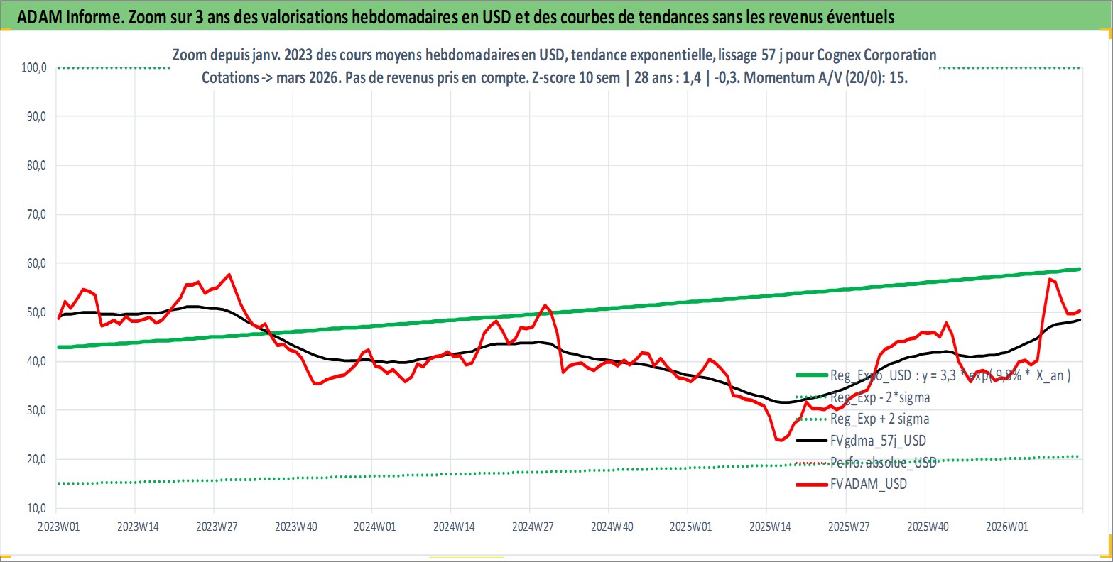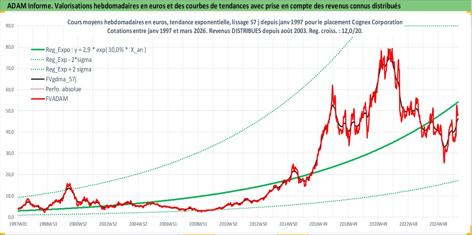 Site dédié aux investisseursPage dédiée sur site financeAnalyse des valorisations hebdomadaires de l'action Cognex Corporation. Cet actif est cote en USD. Les valorisations sont en contrevaleur EURO et couvrent les semaines 1997W01 a 2026W13. Les revenus de cet actif financier sont pris en compte depuis la semaine 2003W35. La note ESG de cet actif n'est pas connue.