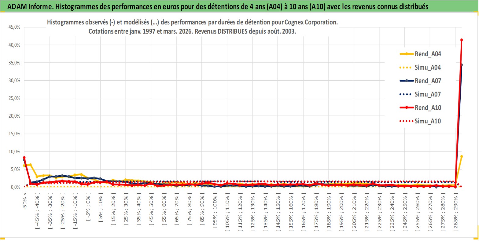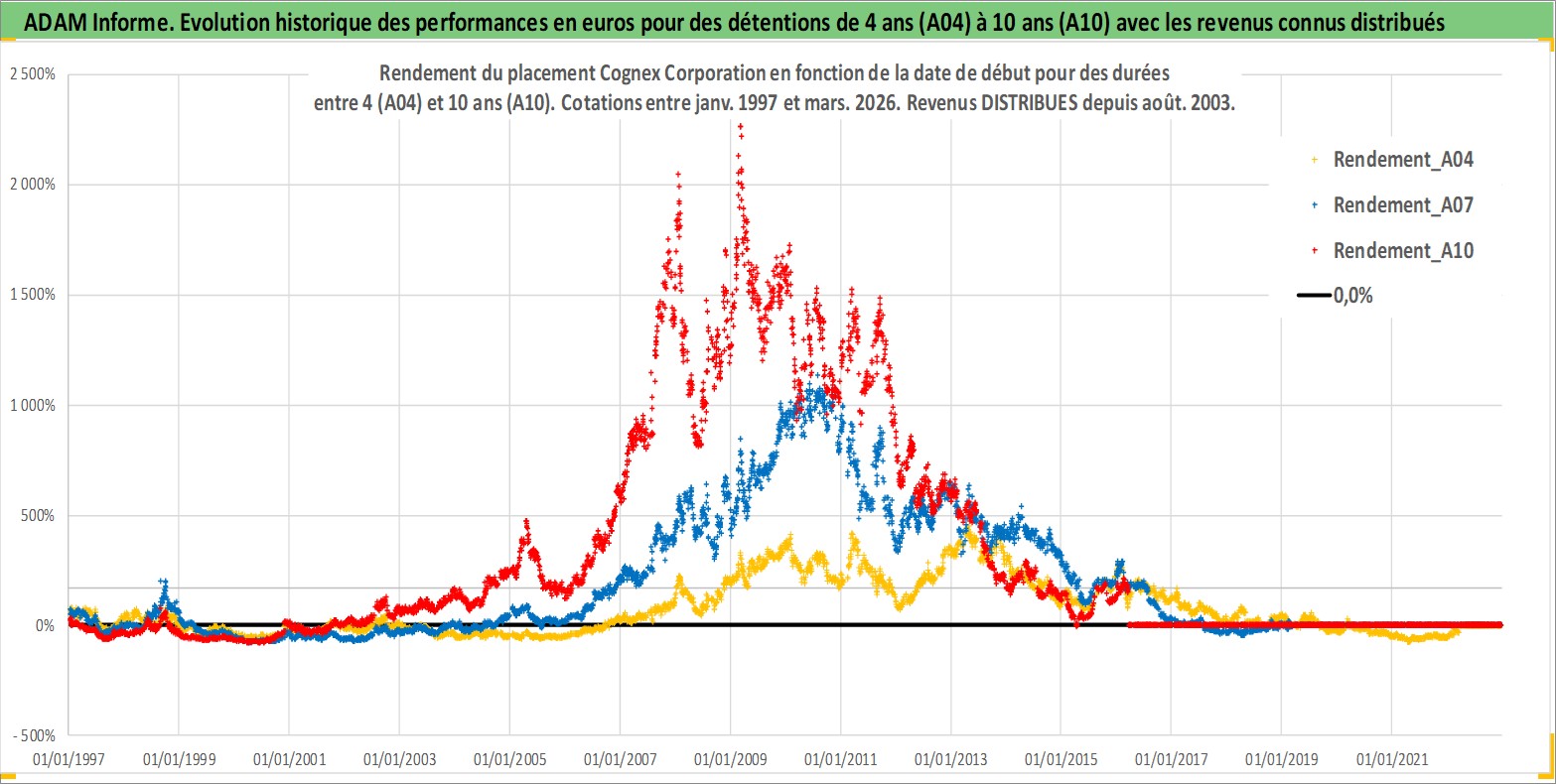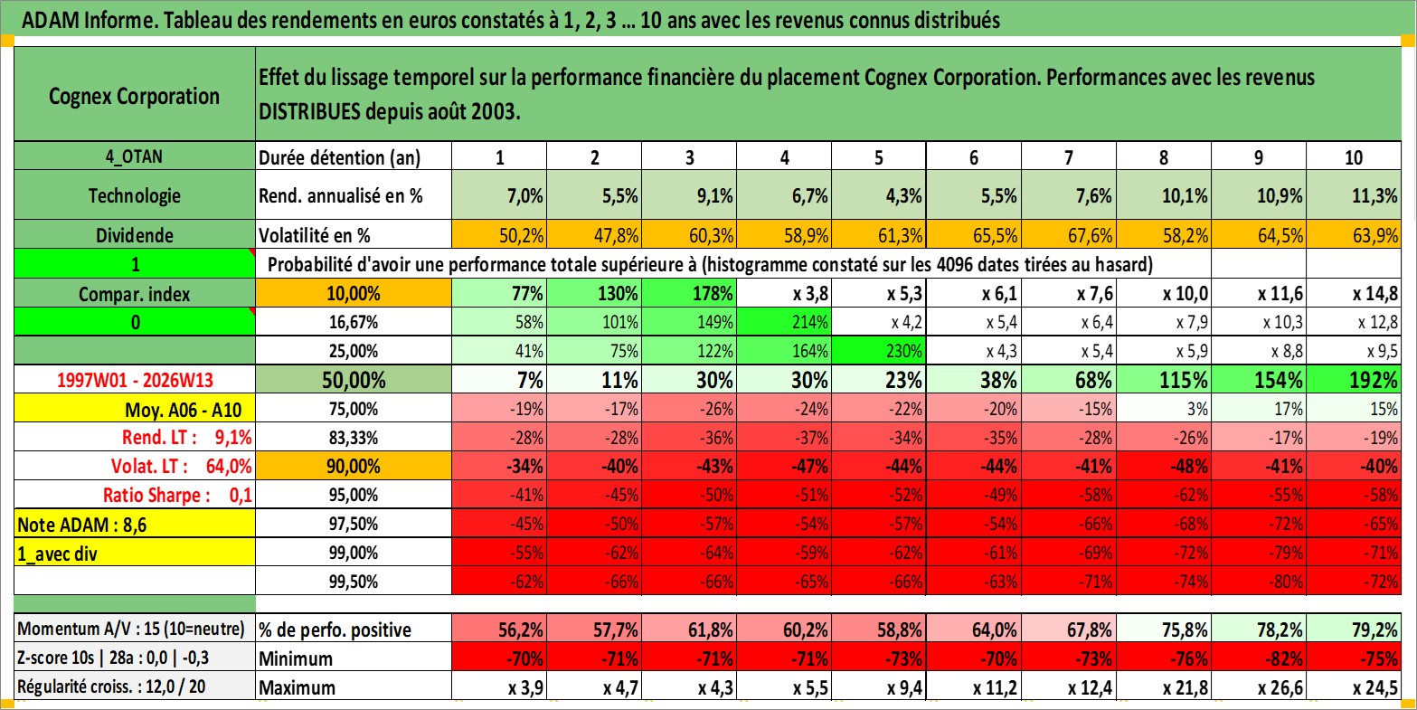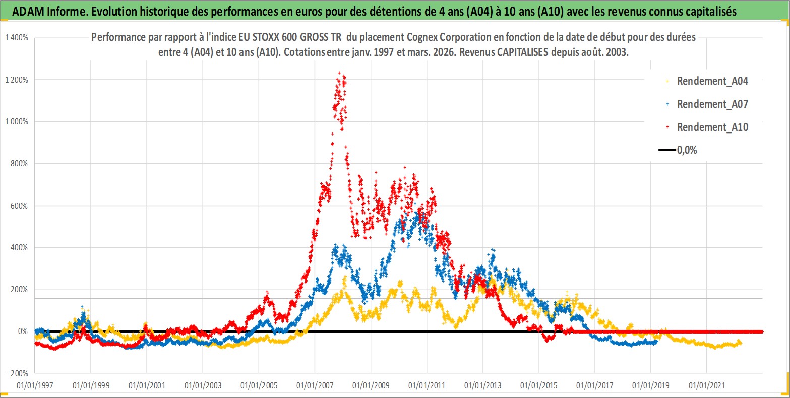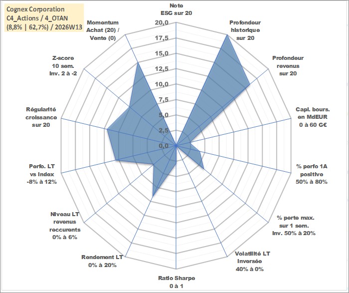 Site dédié aux investisseursPage dédiée sur site financeAnalyse des valorisations hebdomadaires de l'action Cognex Corporation. Cet actif est cote en USD. Les valorisations sont en contrevaleur EURO et couvrent les semaines 1997W01 a 2026W13. Les revenus de cet actif financier sont pris en compte depuis la semaine 2003W35. La note ESG de cet actif n'est pas connue.