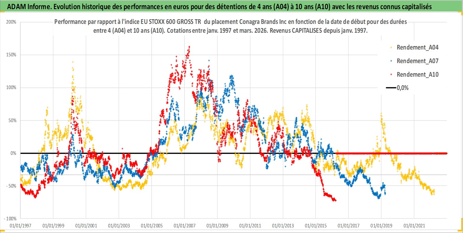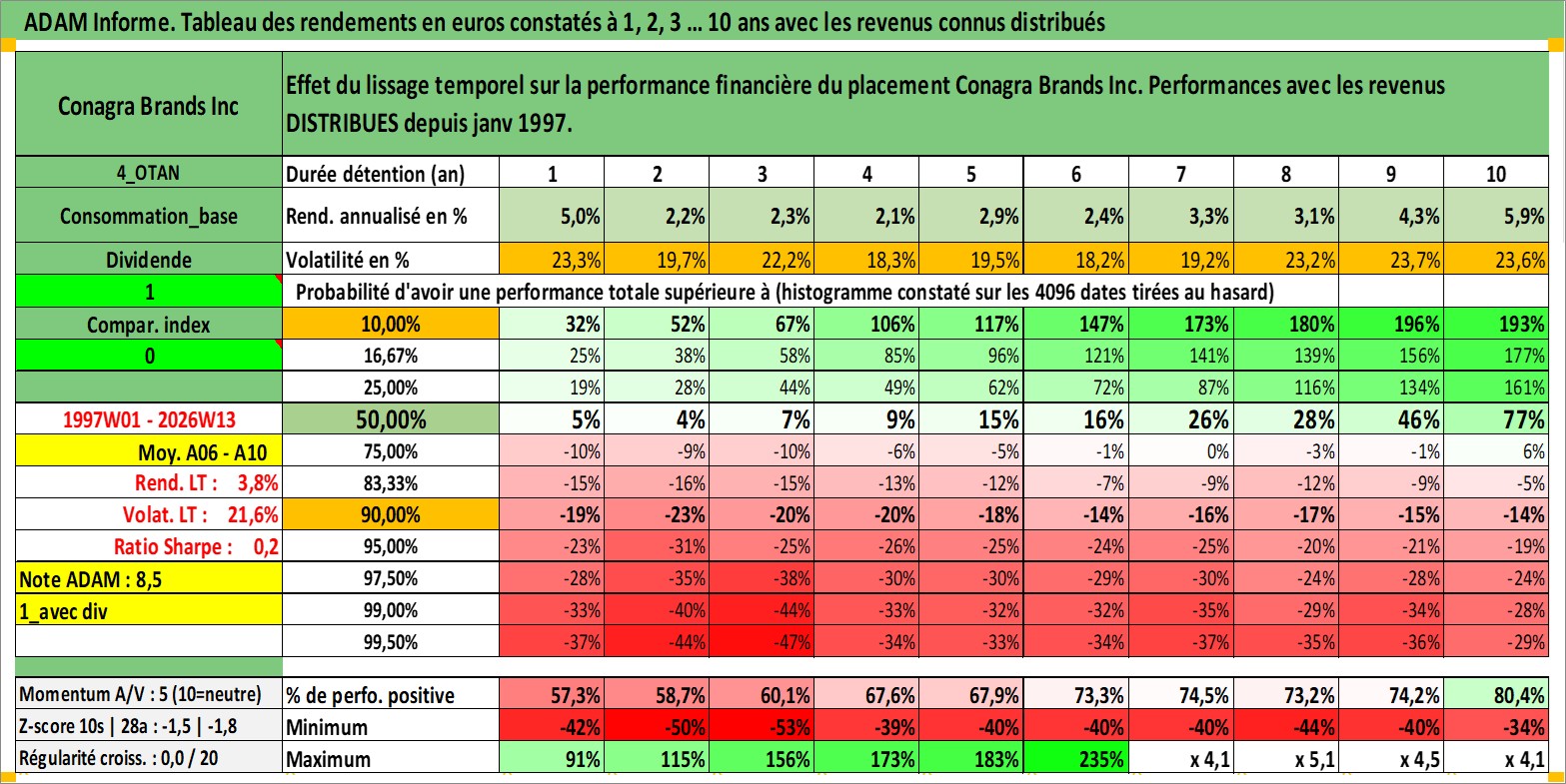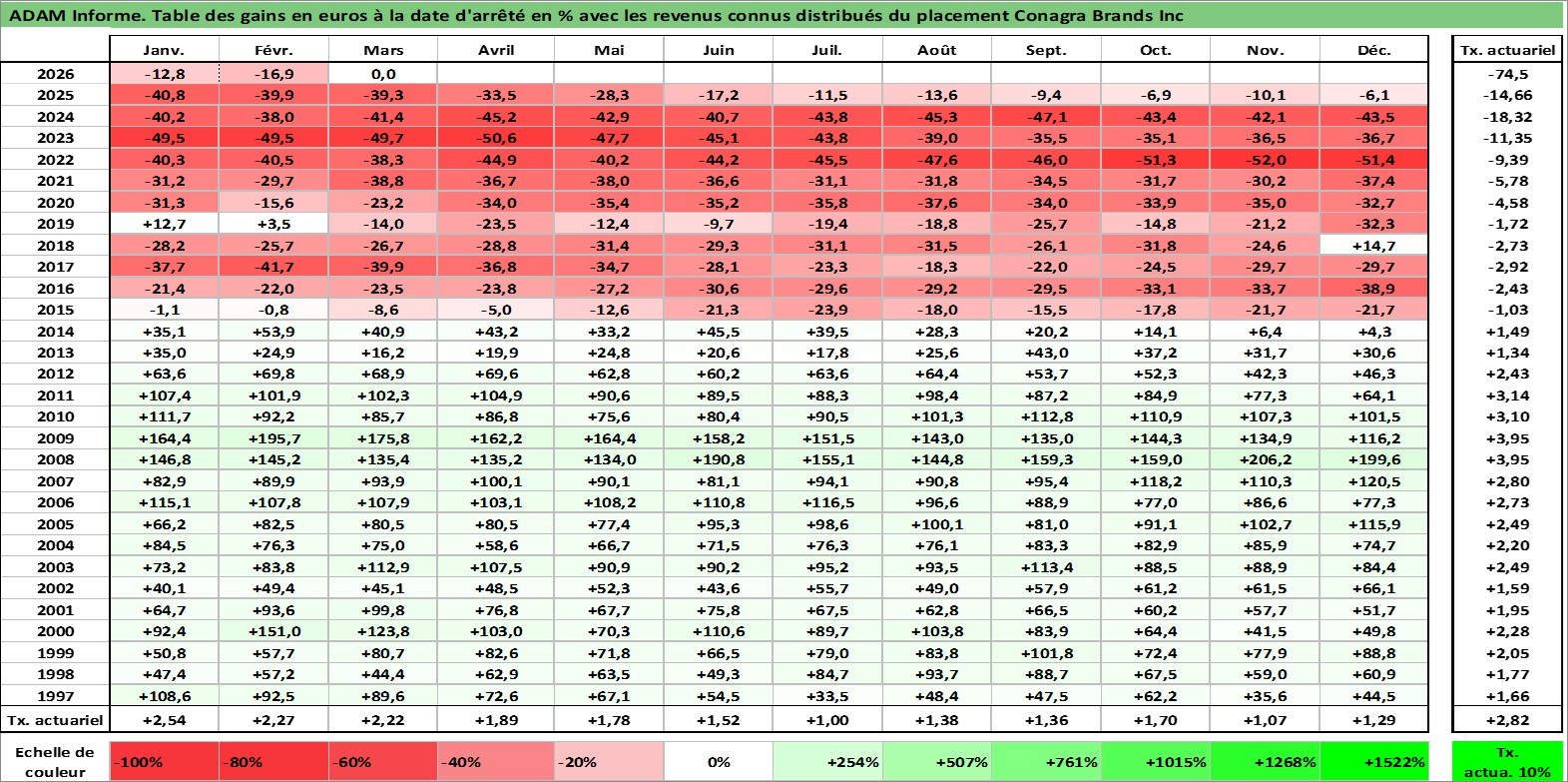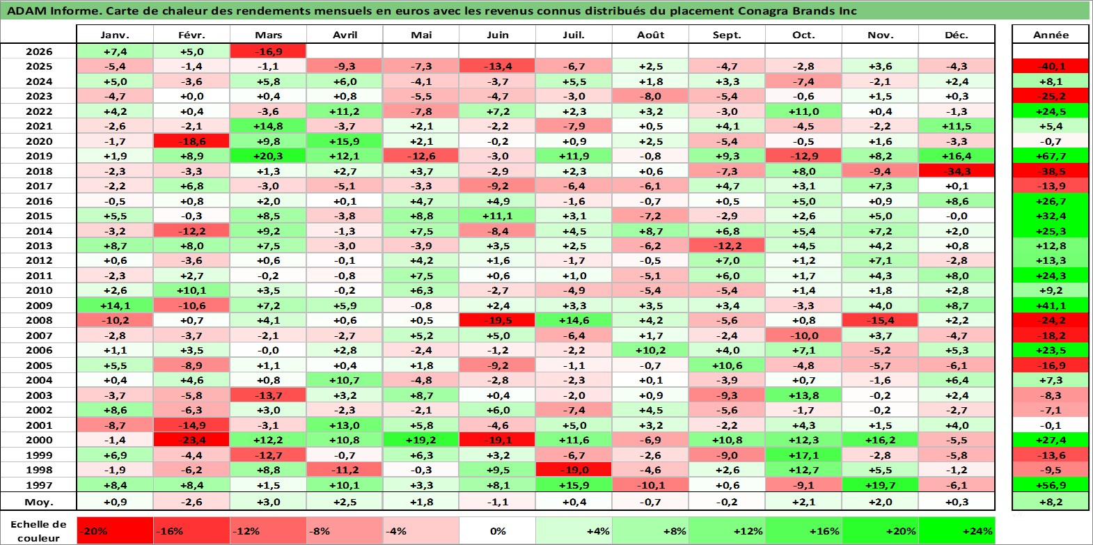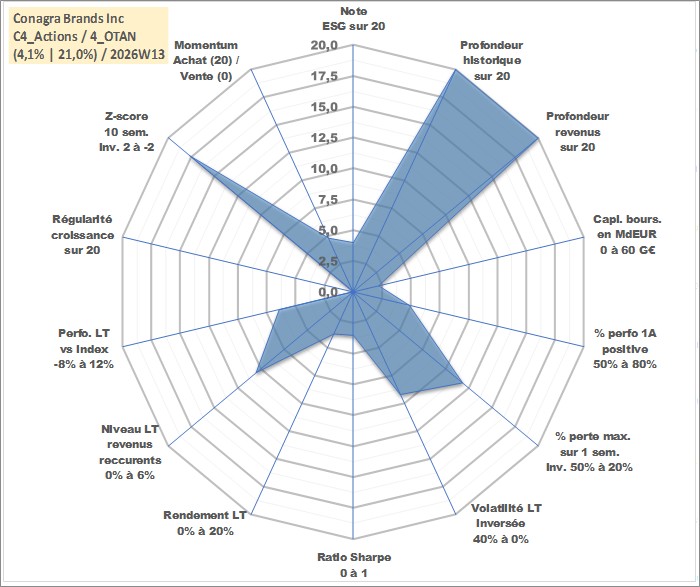 Site dédié aux investisseursPage dédiée sur site financeAnalyse des valorisations hebdomadaires de l'action Conagra Brands Inc. Cet actif est cote en USD. Les valorisations sont en contrevaleur EURO et couvrent les semaines 1997W01 a 2026W13. Les revenus de cet actif financier sont pris en compte depuis la semaine 1997W05. La note globale ESG de cet actif est estimee a 4.0 (apres rebasage entre 0 et 20).