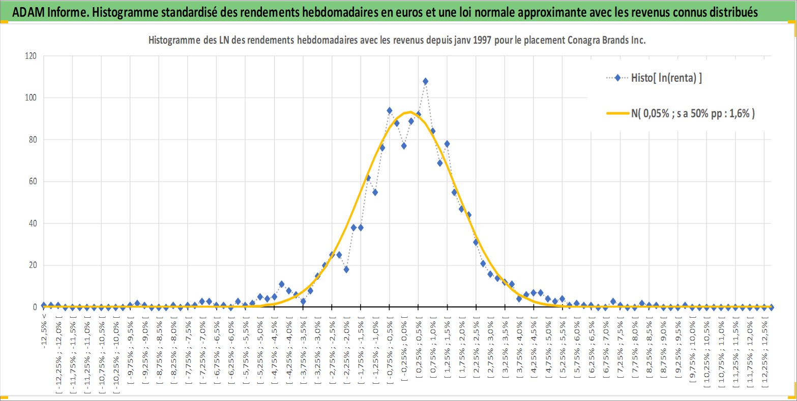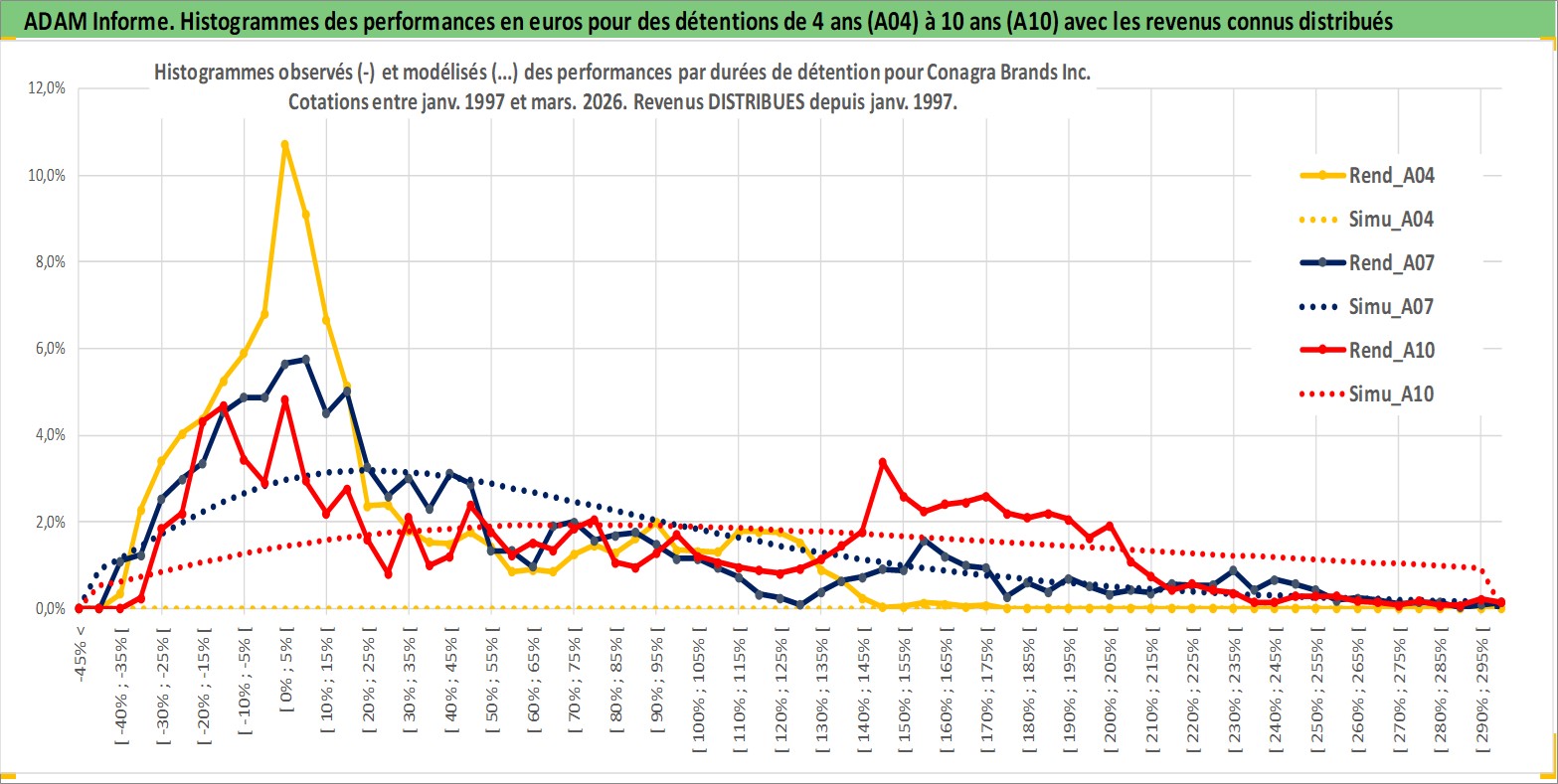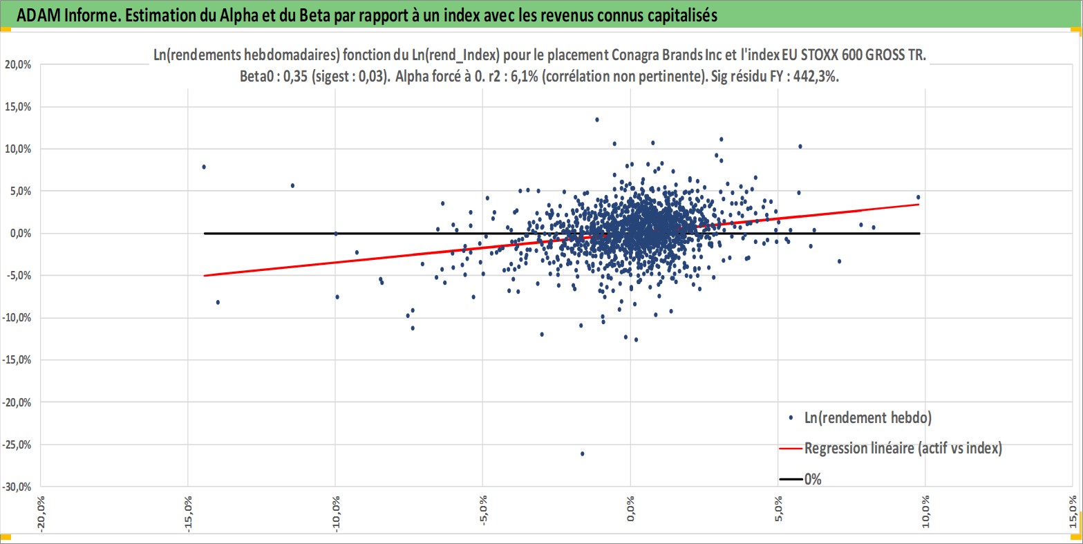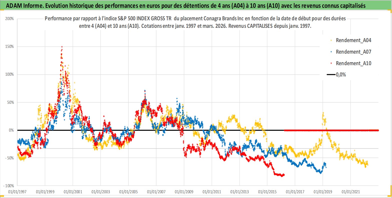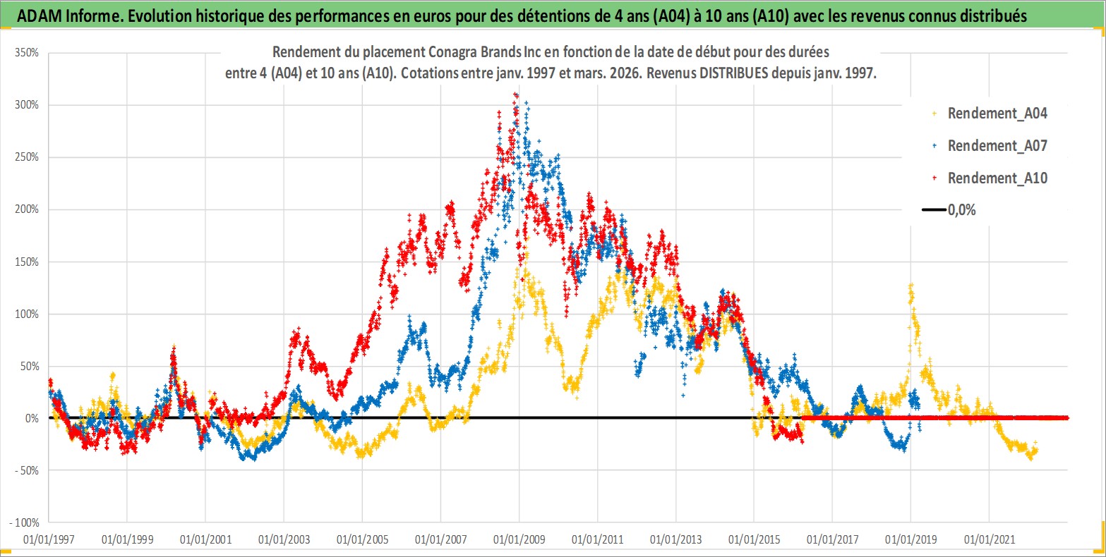 Site dédié aux investisseursPage dédiée sur site financeAnalyse des valorisations hebdomadaires de l'action Conagra Brands Inc. Cet actif est cote en USD. Les valorisations sont en contrevaleur EURO et couvrent les semaines 1997W01 a 2026W13. Les revenus de cet actif financier sont pris en compte depuis la semaine 1997W05. La note globale ESG de cet actif est estimee a 4.0 (apres rebasage entre 0 et 20).