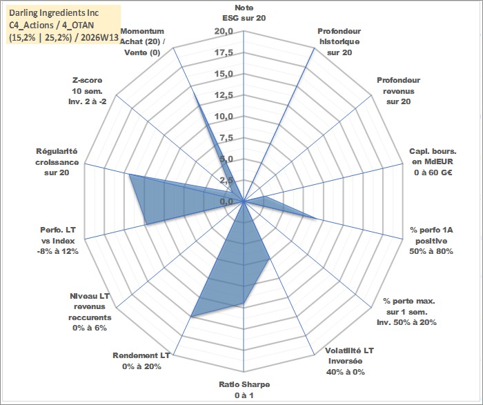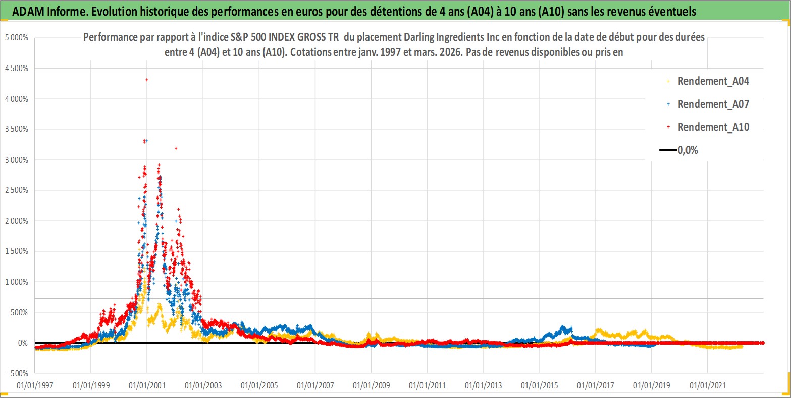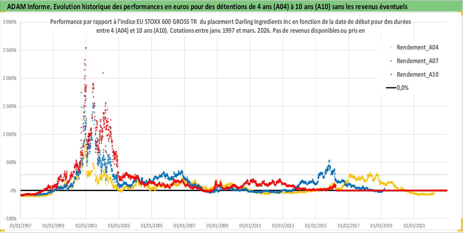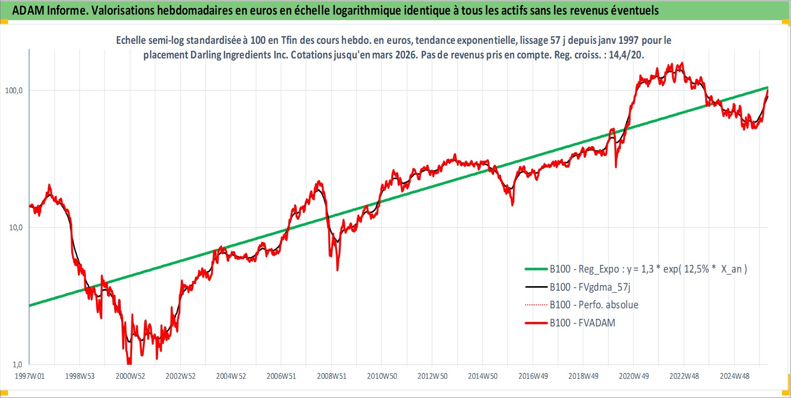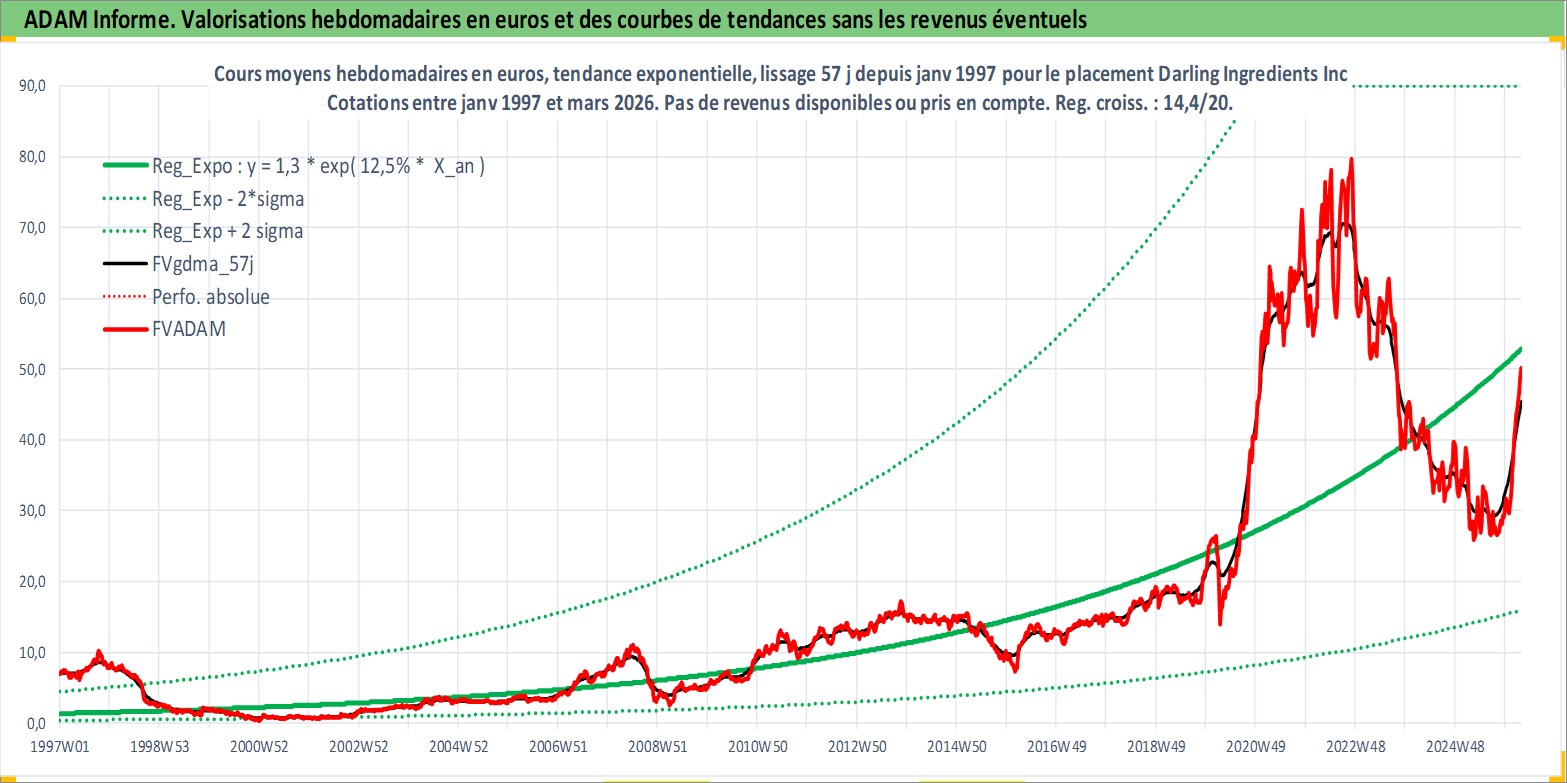 Site dédié aux investisseursPage dédiée sur site financeAnalyse des valorisations hebdomadaires de l'action Darling Ingredients Inc. Cet actif est cote en USD. Les valorisations sont en contrevaleur EURO et couvrent les semaines 1997W01 a 2026W13. Les revenus de cet actif financier ne sont pas connus car non existants ou non disponibles sur le site Yahoo Finance. La note ESG de cet actif n'est pas connue.