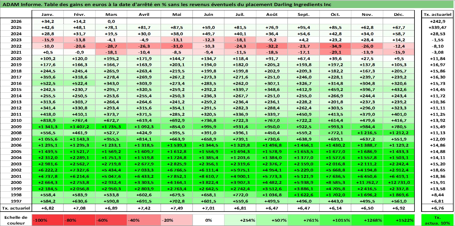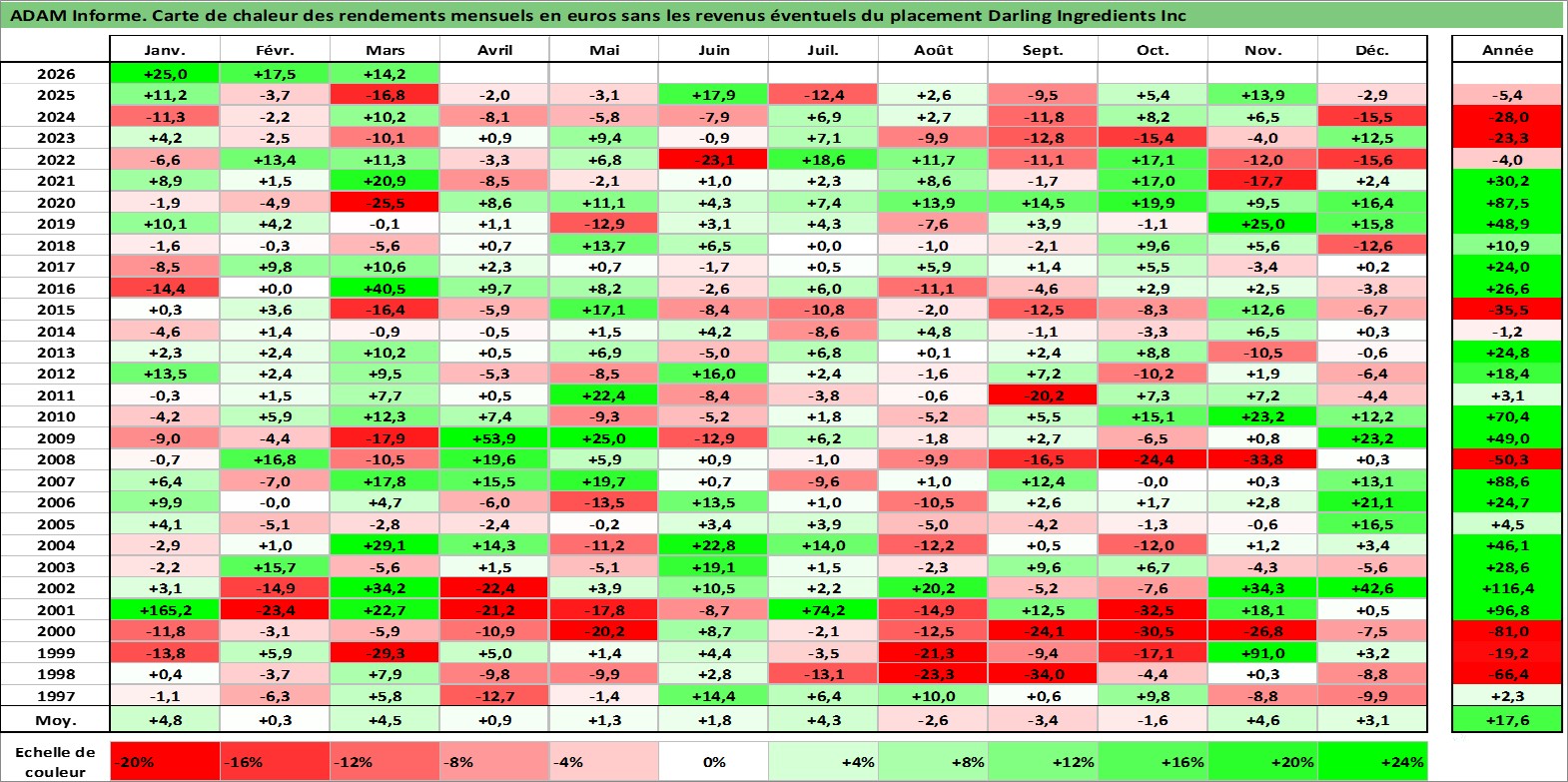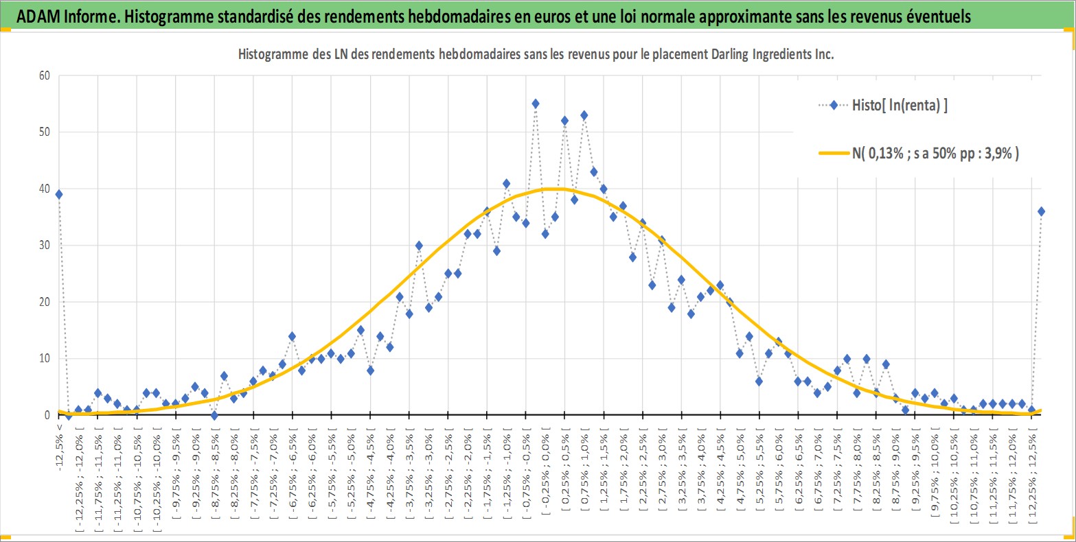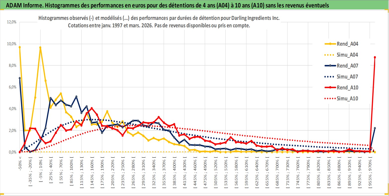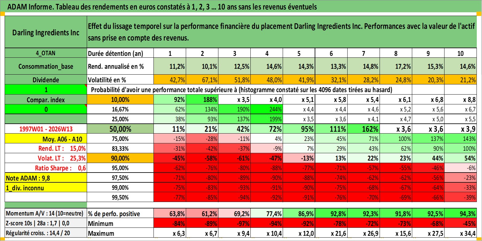 Site dédié aux investisseursPage dédiée sur site financeAnalyse des valorisations hebdomadaires de l'action Darling Ingredients Inc. Cet actif est cote en USD. Les valorisations sont en contrevaleur EURO et couvrent les semaines 1997W01 a 2026W13. Les revenus de cet actif financier ne sont pas connus car non existants ou non disponibles sur le site Yahoo Finance. La note ESG de cet actif n'est pas connue.