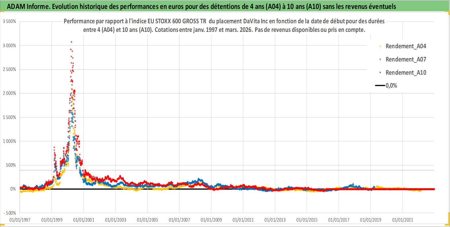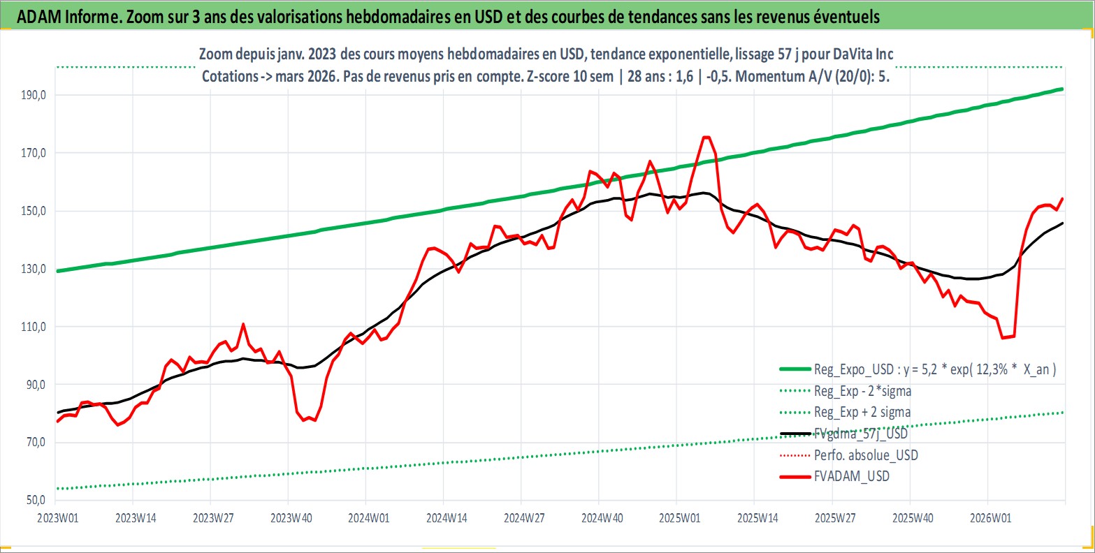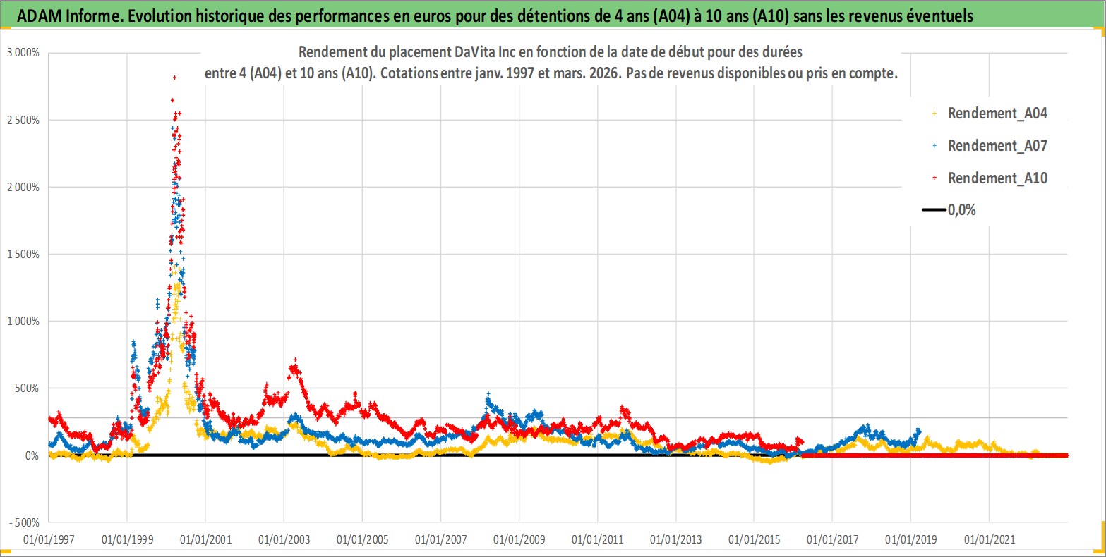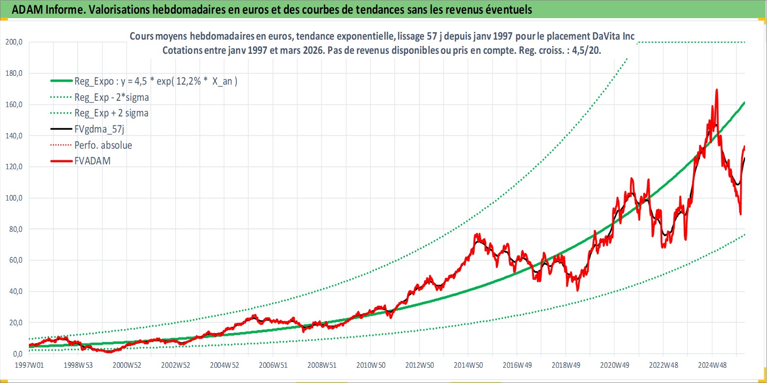 Site dédié aux investisseursPage dédiée sur site financeAnalyse des valorisations hebdomadaires de l'action DaVita Inc. Cet actif est cote en USD. Les valorisations sont en contrevaleur EURO et couvrent les semaines 1997W01 a 2026W13. Les revenus de cet actif financier ne sont pas connus car non existants ou non disponibles sur le site Yahoo Finance. La note globale ESG de cet actif est estimee a 9.0 (apres rebasage entre 0 et 20).