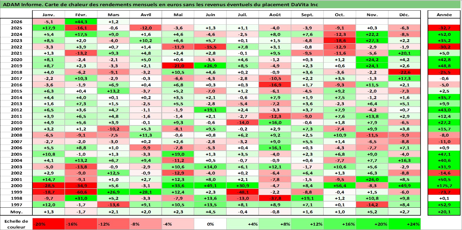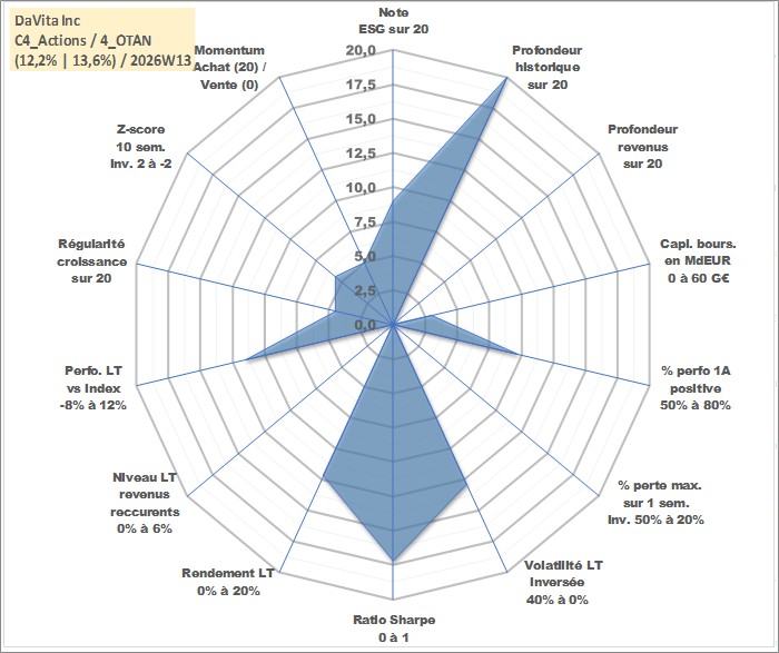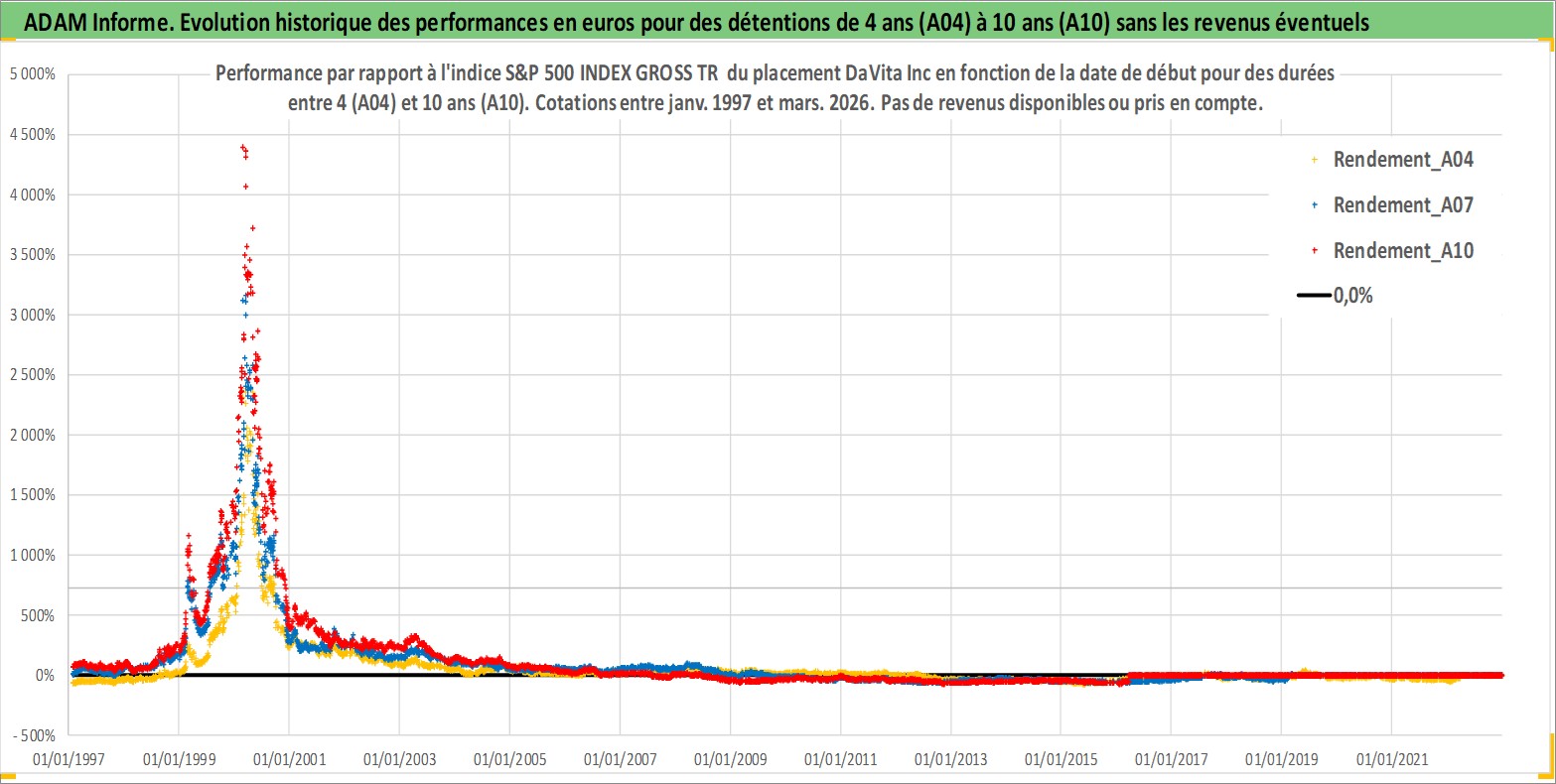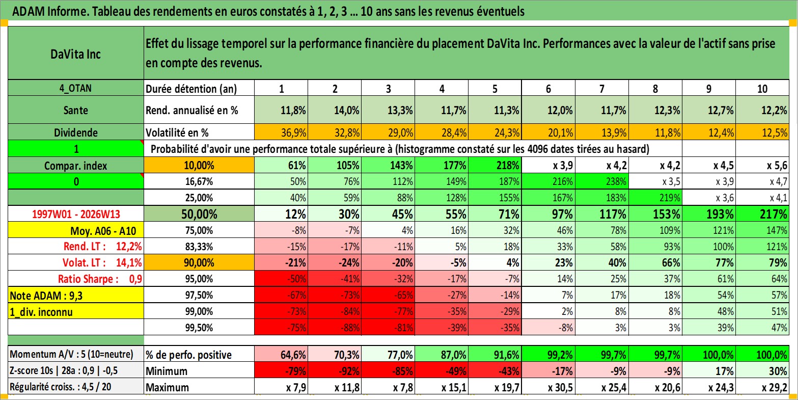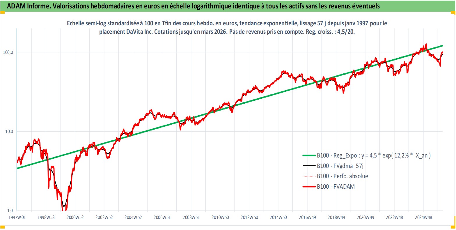 Site dédié aux investisseursPage dédiée sur site financeAnalyse des valorisations hebdomadaires de l'action DaVita Inc. Cet actif est cote en USD. Les valorisations sont en contrevaleur EURO et couvrent les semaines 1997W01 a 2026W13. Les revenus de cet actif financier ne sont pas connus car non existants ou non disponibles sur le site Yahoo Finance. La note globale ESG de cet actif est estimee a 9.0 (apres rebasage entre 0 et 20).