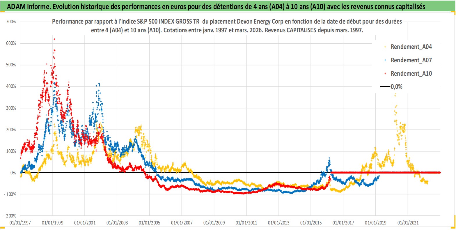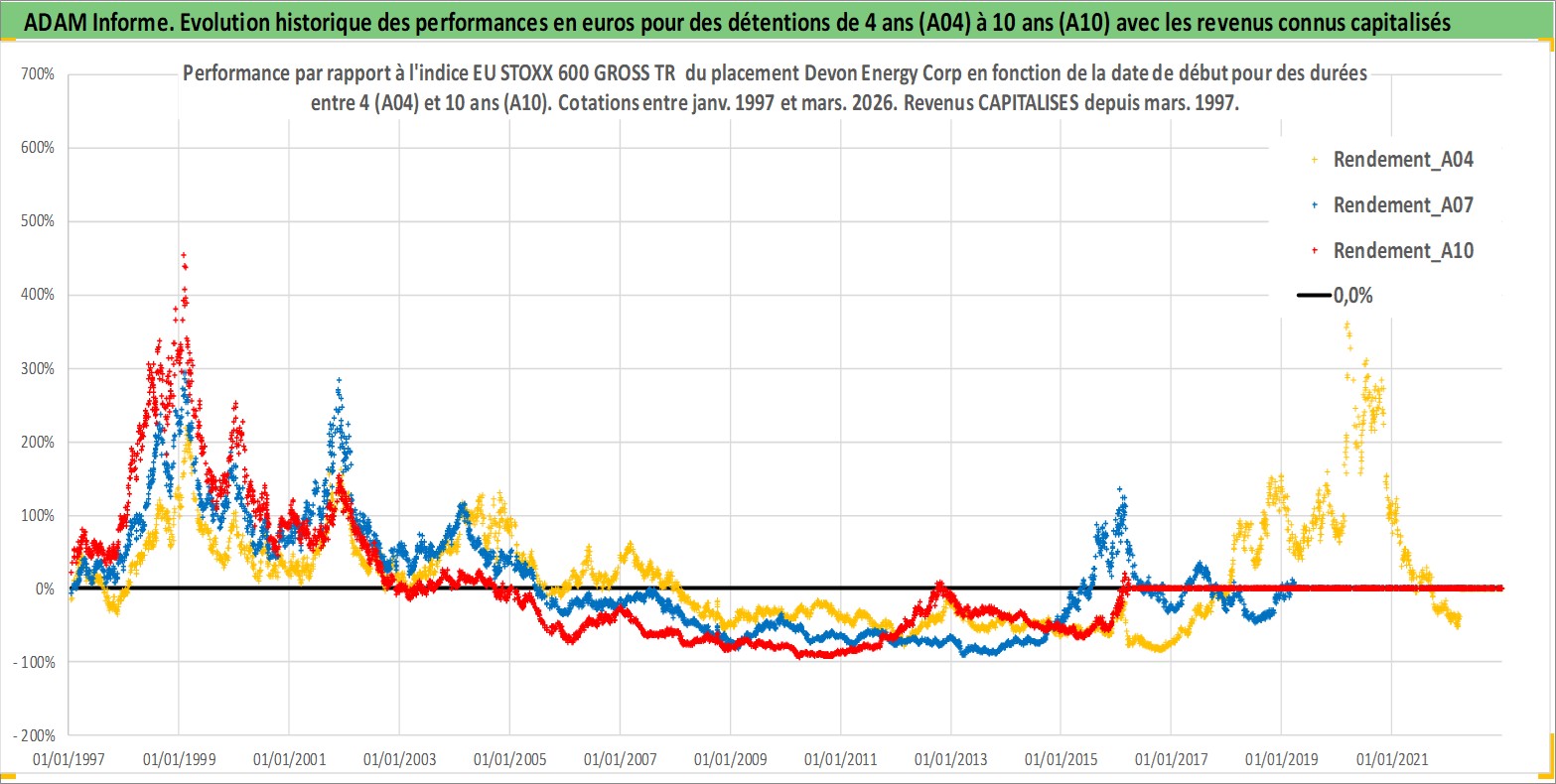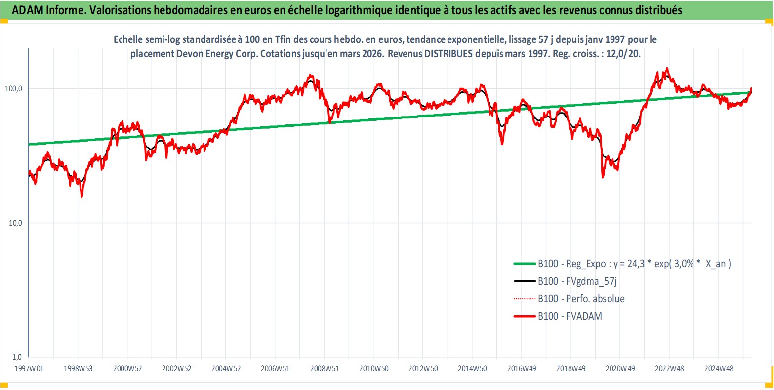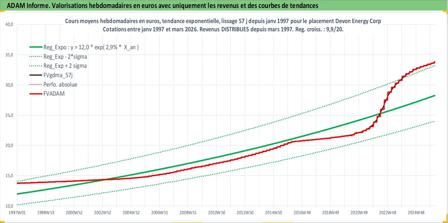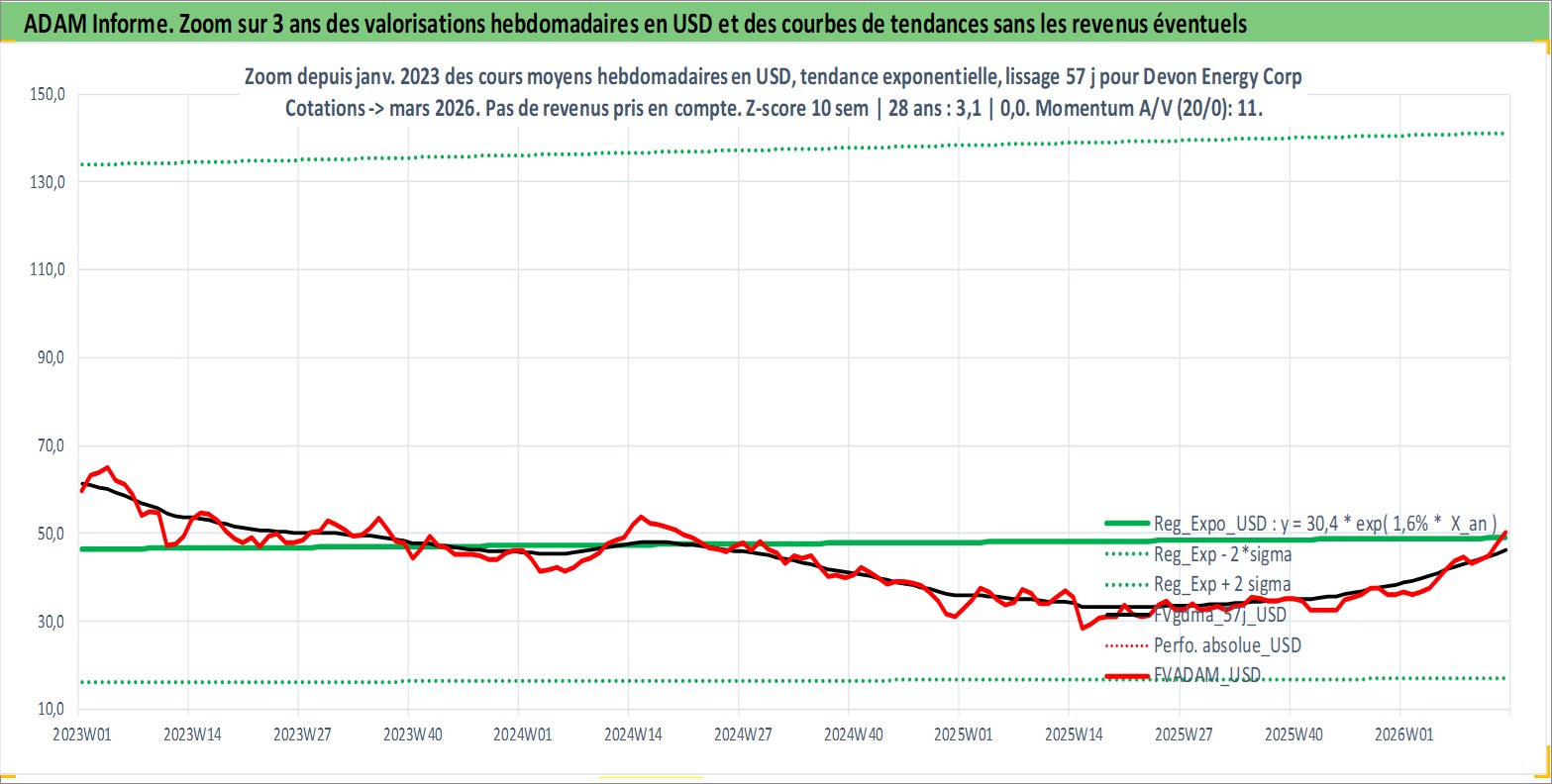 Site dédié aux investisseursPage dédiée sur site financeAnalyse des valorisations hebdomadaires de l'action Devon Energy Corp. Cet actif est cote en USD. Les valorisations sont en contrevaleur EURO et couvrent les semaines 1997W01 a 2026W13. Les revenus de cet actif financier sont pris en compte depuis la semaine 1997W11. La note globale ESG de cet actif est estimee a 3.0 (apres rebasage entre 0 et 20).