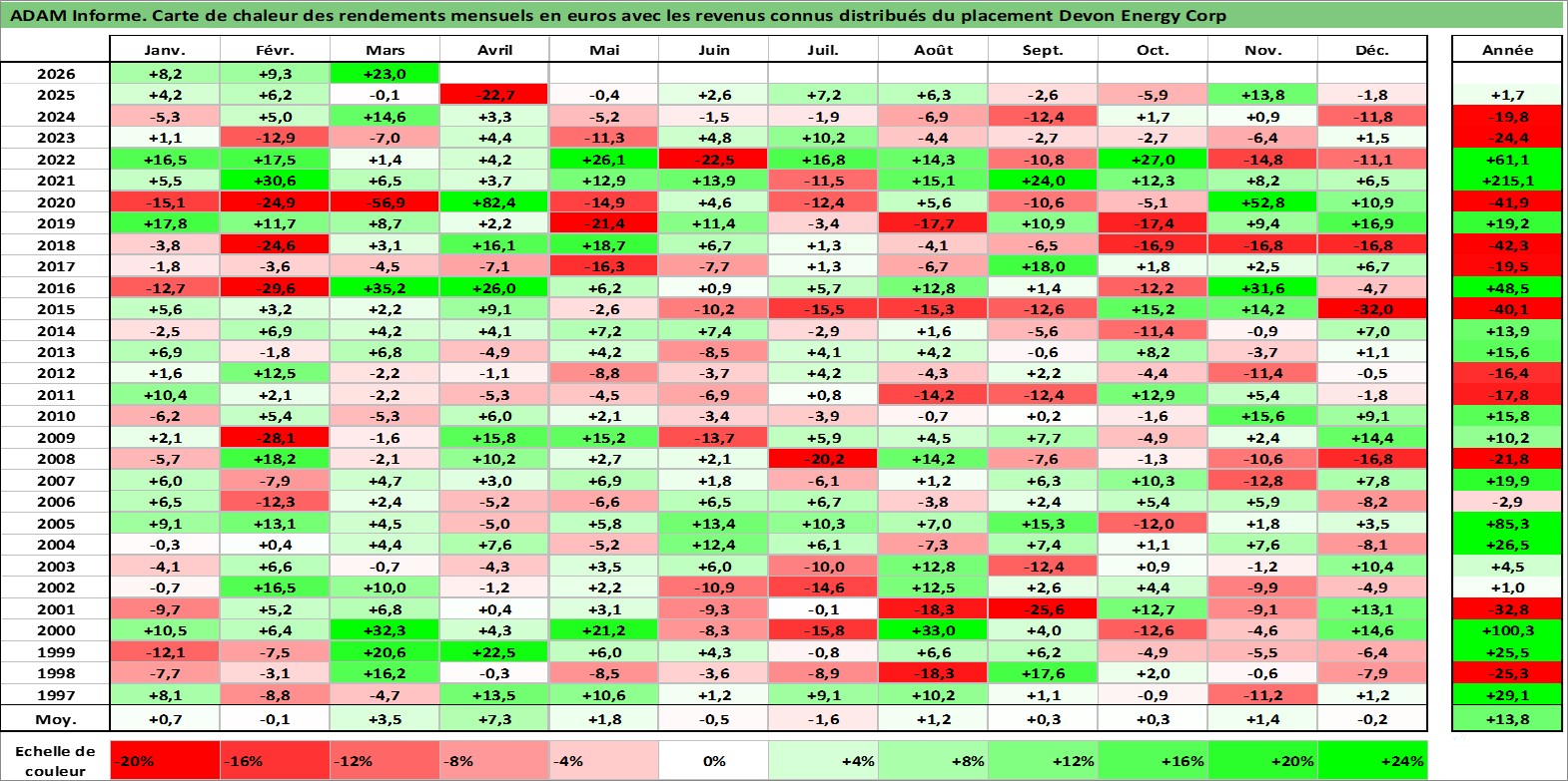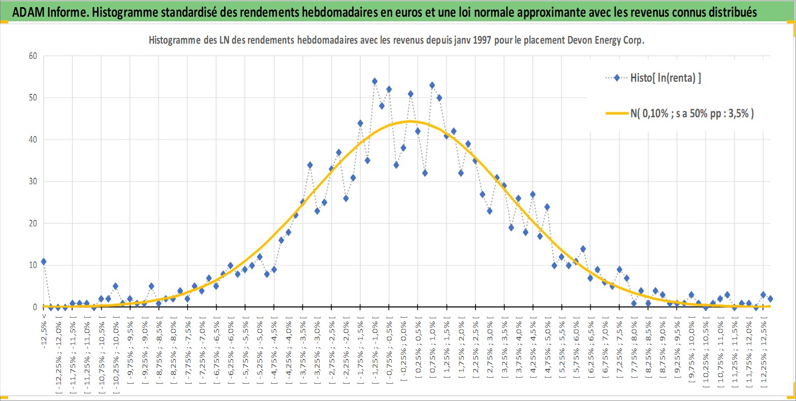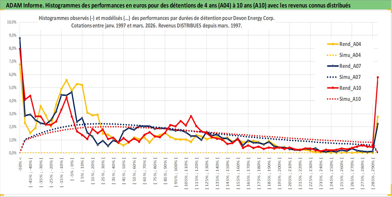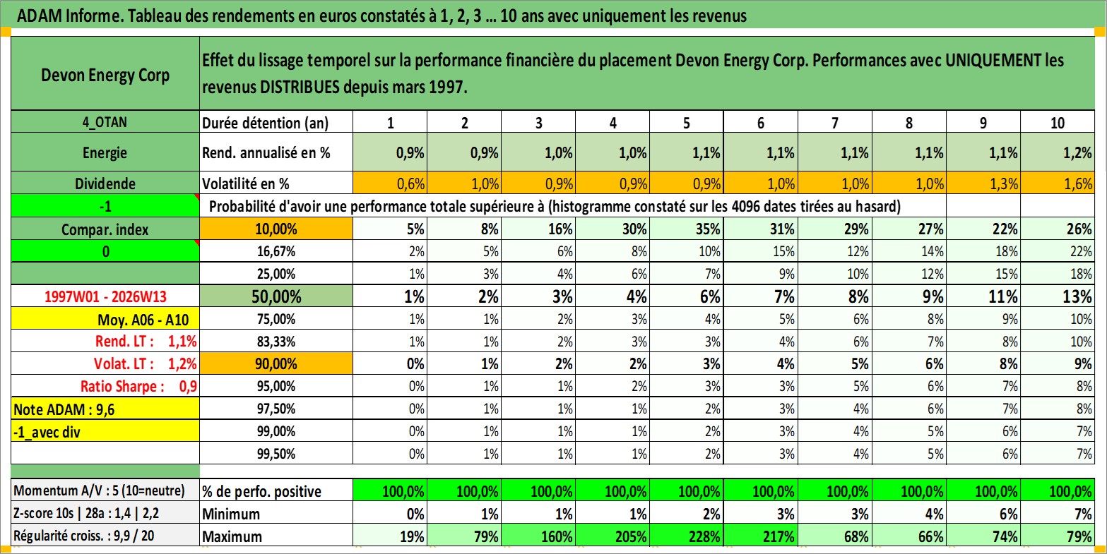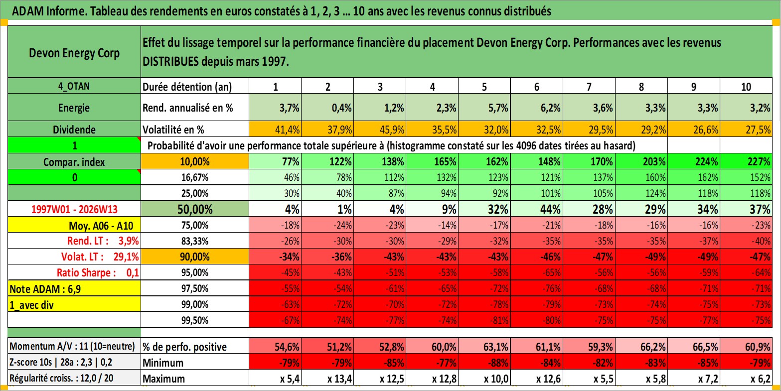 Site dédié aux investisseursPage dédiée sur site financeAnalyse des valorisations hebdomadaires de l'action Devon Energy Corp. Cet actif est cote en USD. Les valorisations sont en contrevaleur EURO et couvrent les semaines 1997W01 a 2026W13. Les revenus de cet actif financier sont pris en compte depuis la semaine 1997W11. La note globale ESG de cet actif est estimee a 3.0 (apres rebasage entre 0 et 20).