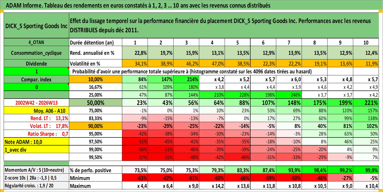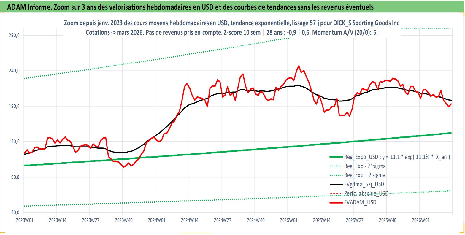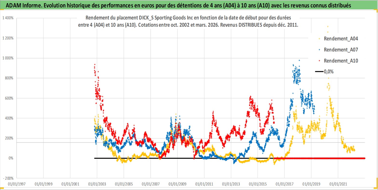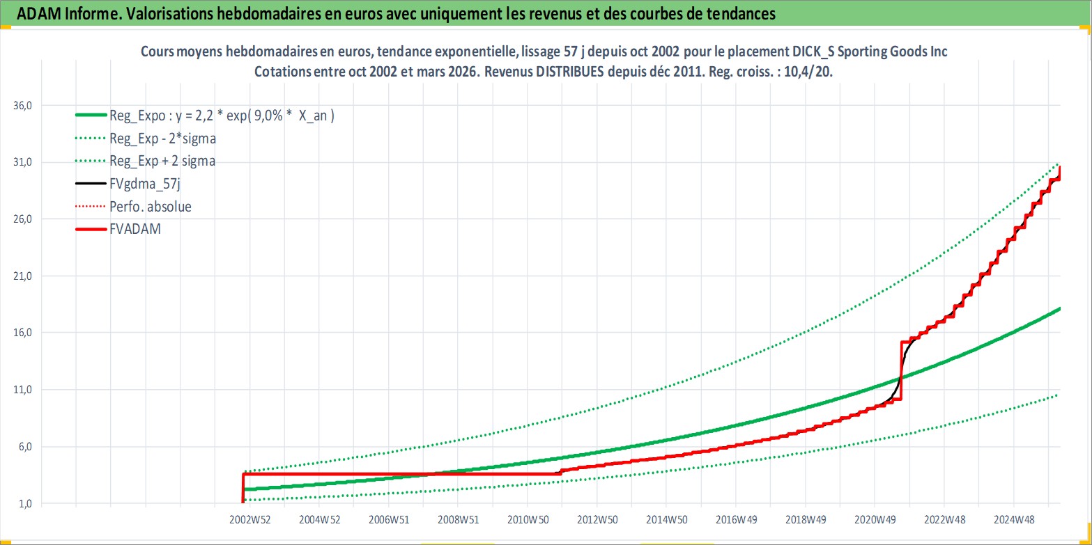 Site dédié aux investisseursPage dédiée sur site financeAnalyse des valorisations hebdomadaires de l'action DICK_S Sporting Goods Inc. Cet actif est cote en USD. Les valorisations sont en contrevaleur EURO et couvrent les semaines 2002W42 a 2026W13. Les revenus de cet actif financier sont pris en compte depuis la semaine 2011W49. La note globale ESG de cet actif est estimee a 13.0 (apres rebasage entre 0 et 20).