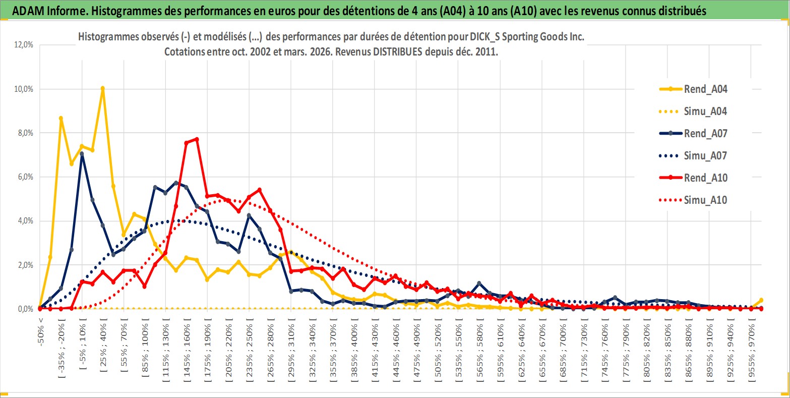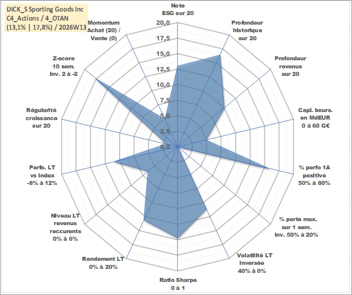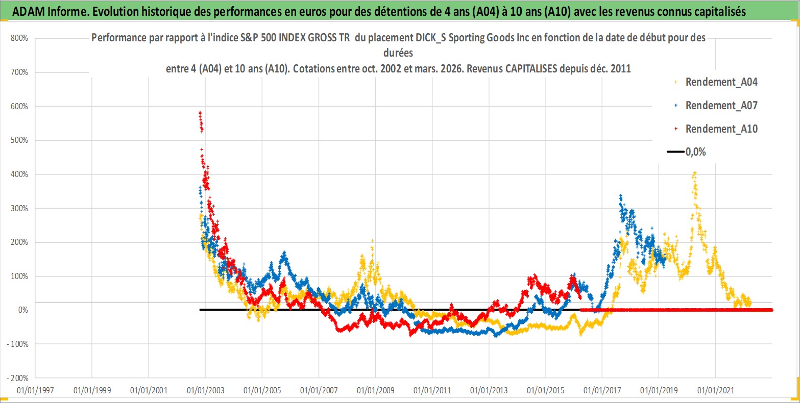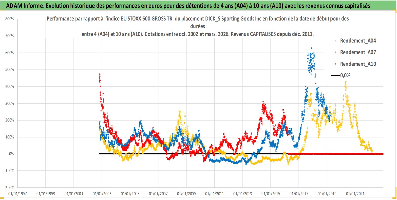 Site dédié aux investisseursPage dédiée sur site financeAnalyse des valorisations hebdomadaires de l'action DICK_S Sporting Goods Inc. Cet actif est cote en USD. Les valorisations sont en contrevaleur EURO et couvrent les semaines 2002W42 a 2026W13. Les revenus de cet actif financier sont pris en compte depuis la semaine 2011W49. La note globale ESG de cet actif est estimee a 13.0 (apres rebasage entre 0 et 20).