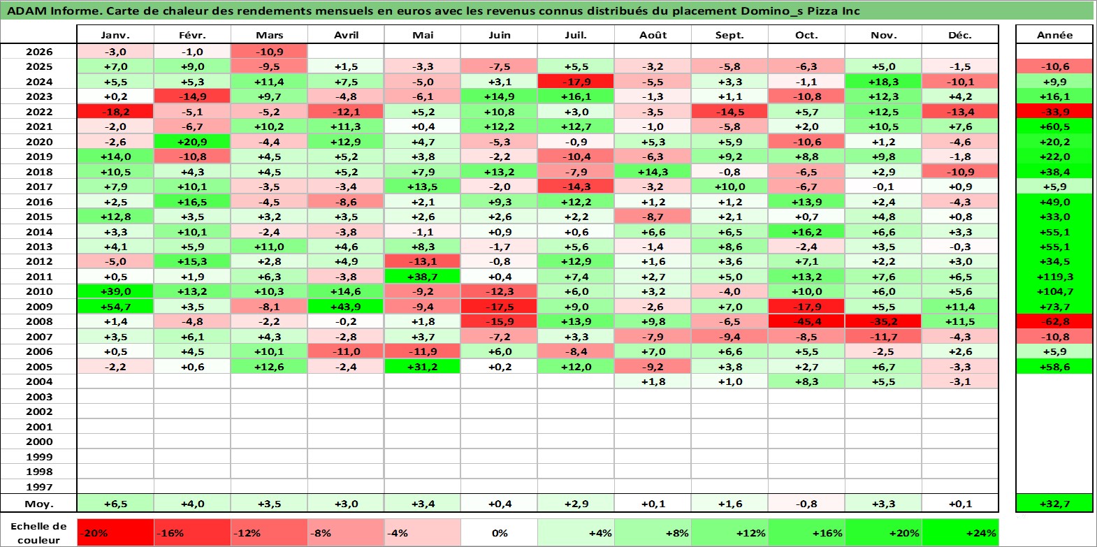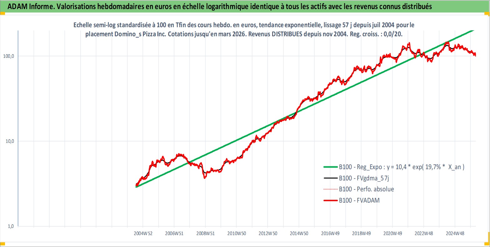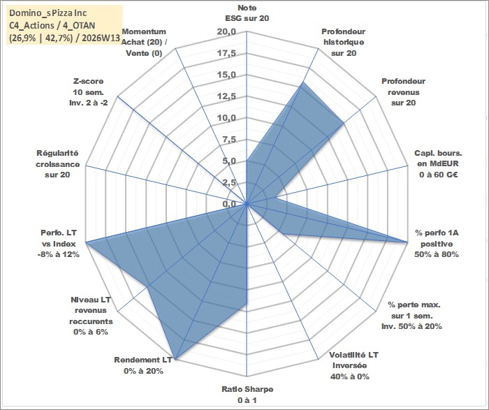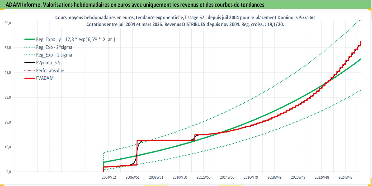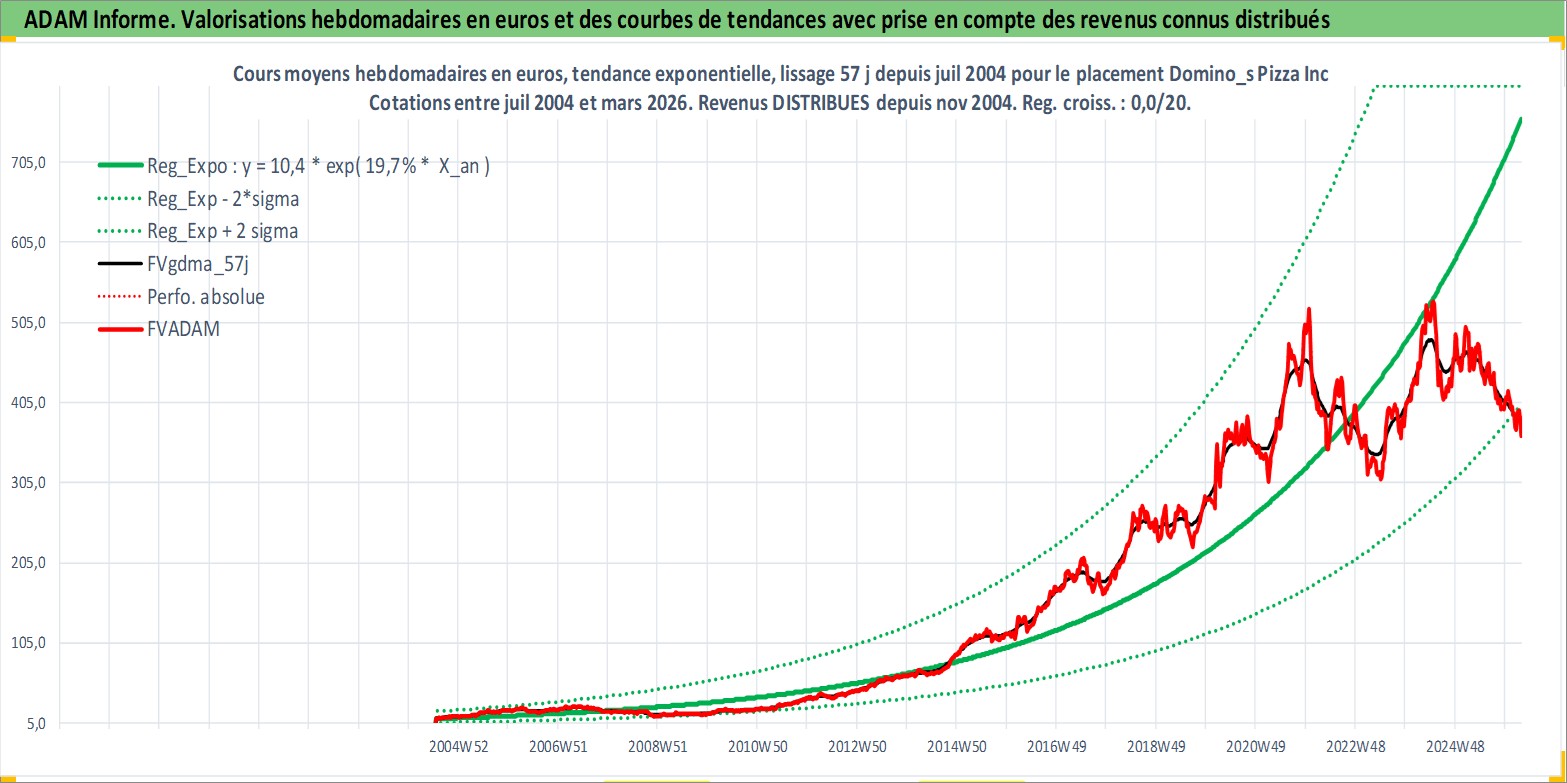 Site dédié aux investisseursPage dédiée sur site financeAnalyse des valorisations hebdomadaires de l'action Domino_s Pizza Inc. Cet actif est cote en USD. Les valorisations sont en contrevaleur EURO et couvrent les semaines 2004W29 a 2026W13. Les revenus de cet actif financier sont pris en compte depuis la semaine 2004W49. La note globale ESG de cet actif est estimee a 5.0 (apres rebasage entre 0 et 20).