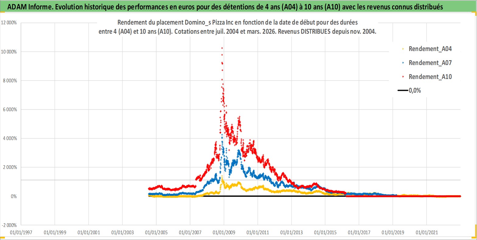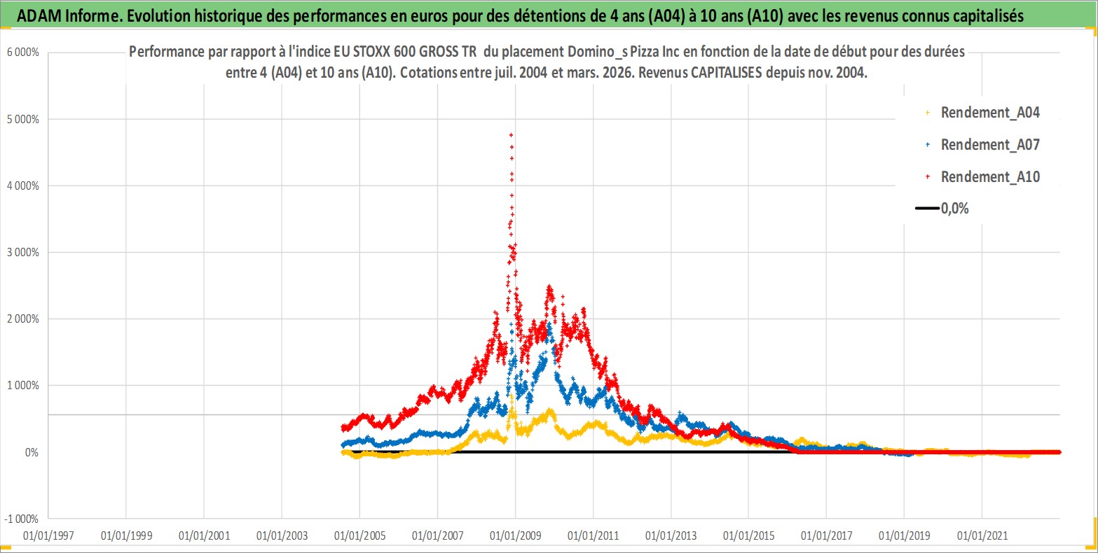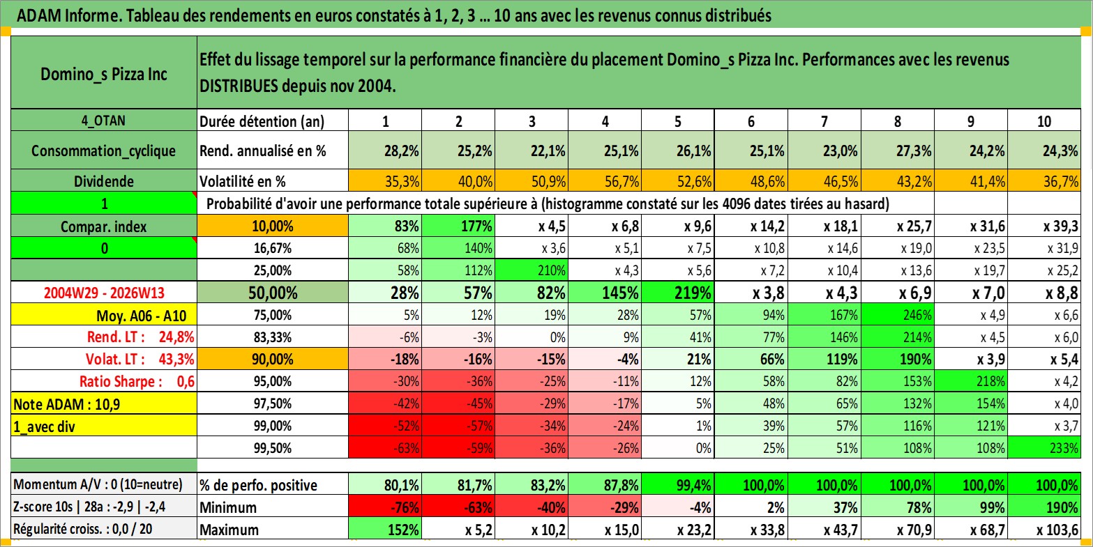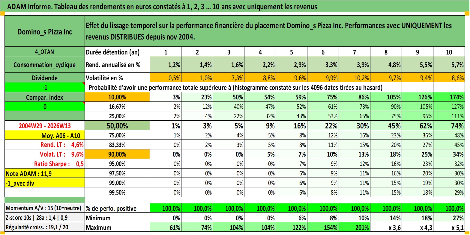 Site dédié aux investisseursPage dédiée sur site financeAnalyse des valorisations hebdomadaires de l'action Domino_s Pizza Inc. Cet actif est cote en USD. Les valorisations sont en contrevaleur EURO et couvrent les semaines 2004W29 a 2026W13. Les revenus de cet actif financier sont pris en compte depuis la semaine 2004W49. La note globale ESG de cet actif est estimee a 5.0 (apres rebasage entre 0 et 20).