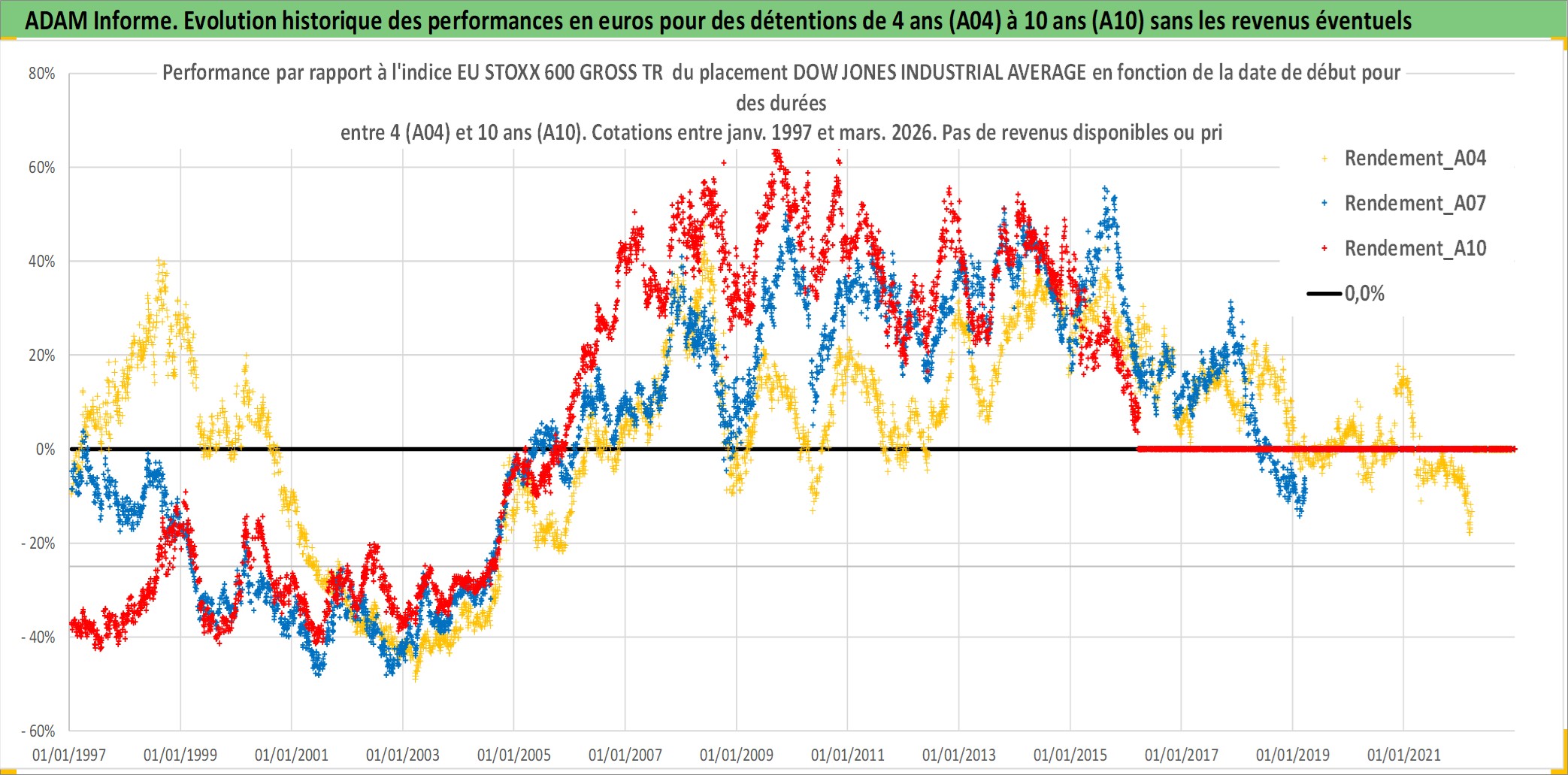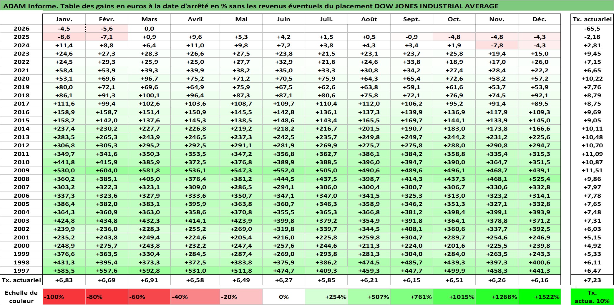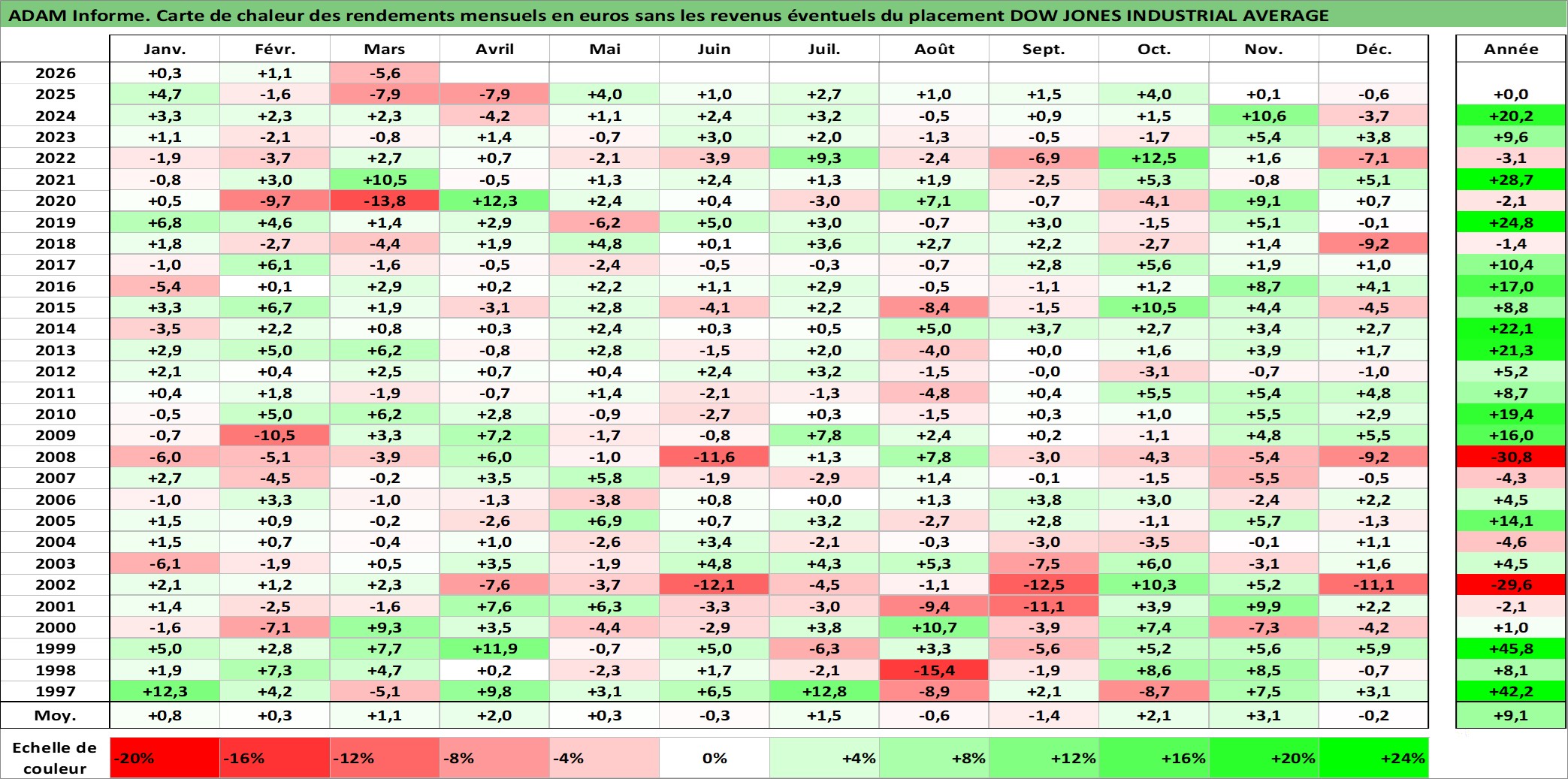 Site dédié aux investisseursPage dédiée sur site financeAnalyse des valorisations hebdomadaires de l'actif DOW JONES INDUSTRIAL AVERAGE. Cet actif est cote en USD. Les valorisations sont en contrevaleur EURO et couvrent les semaines 1997W01 a 2026W13. Les revenus de cet actif financier ne sont pas connus car non existants ou non disponibles sur le site Yahoo Finance. La note ESG de cet actif n'est pas connue.