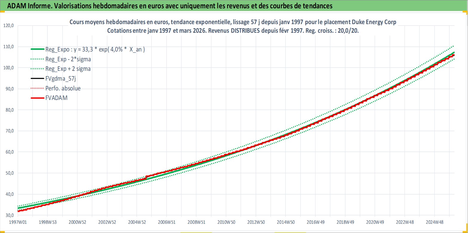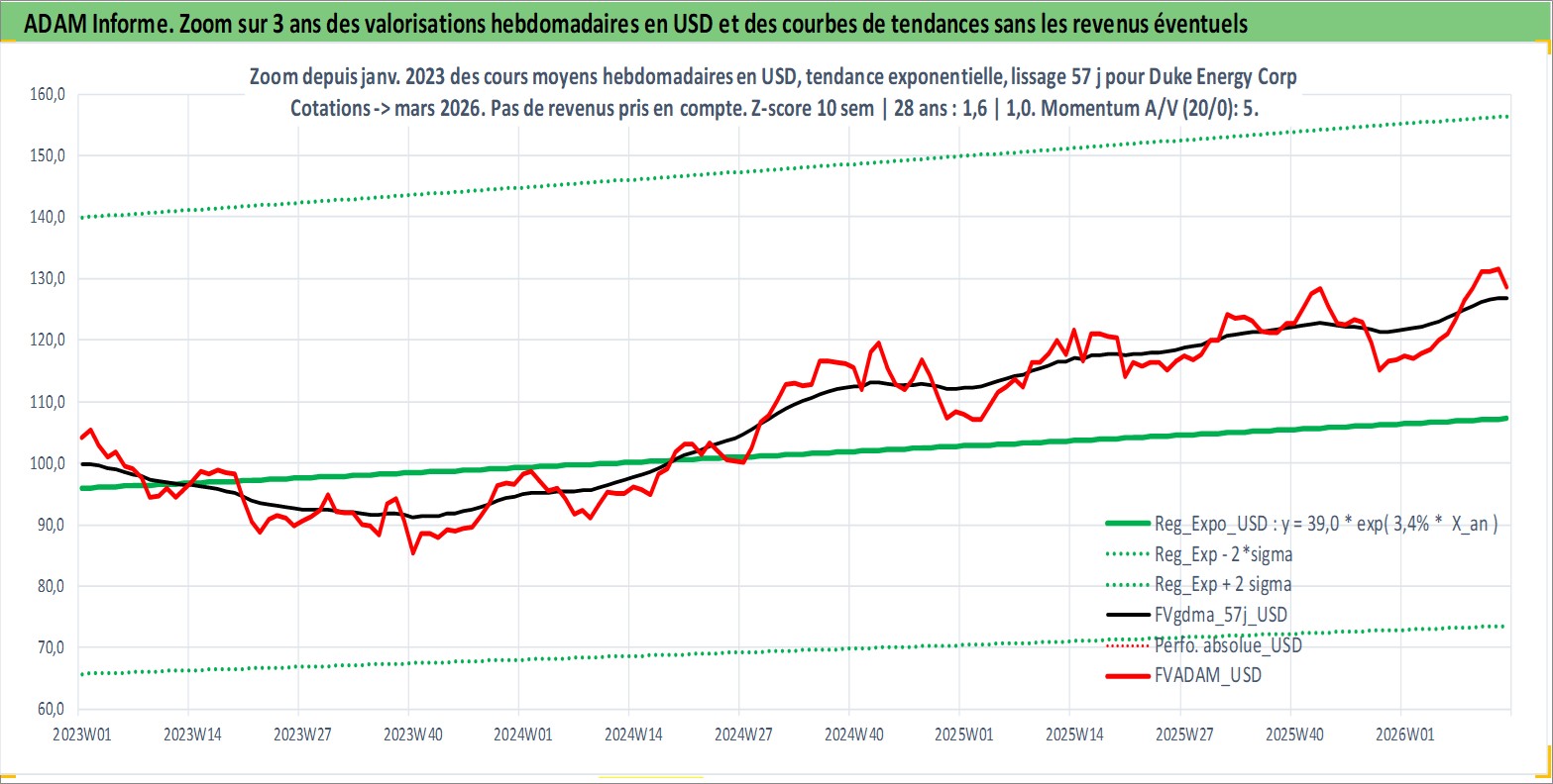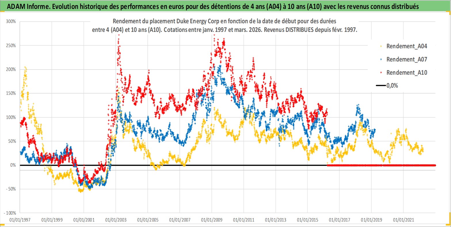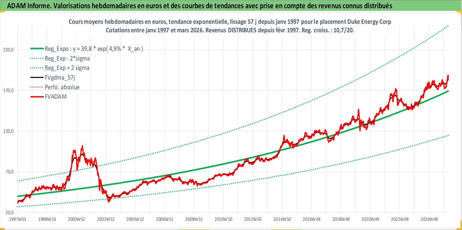Site dédié aux investisseursPage dédiée sur site financeAnalyse des valorisations hebdomadaires de l'action Duke Energy Corp. Cet actif est cote en USD. Les valorisations sont en contrevaleur EURO et couvrent les semaines 1997W01 a 2026W13. Les revenus de cet actif financier sont pris en compte depuis la semaine 1997W07. La note globale ESG de cet actif est estimee a 6.0 (apres rebasage entre 0 et 20).