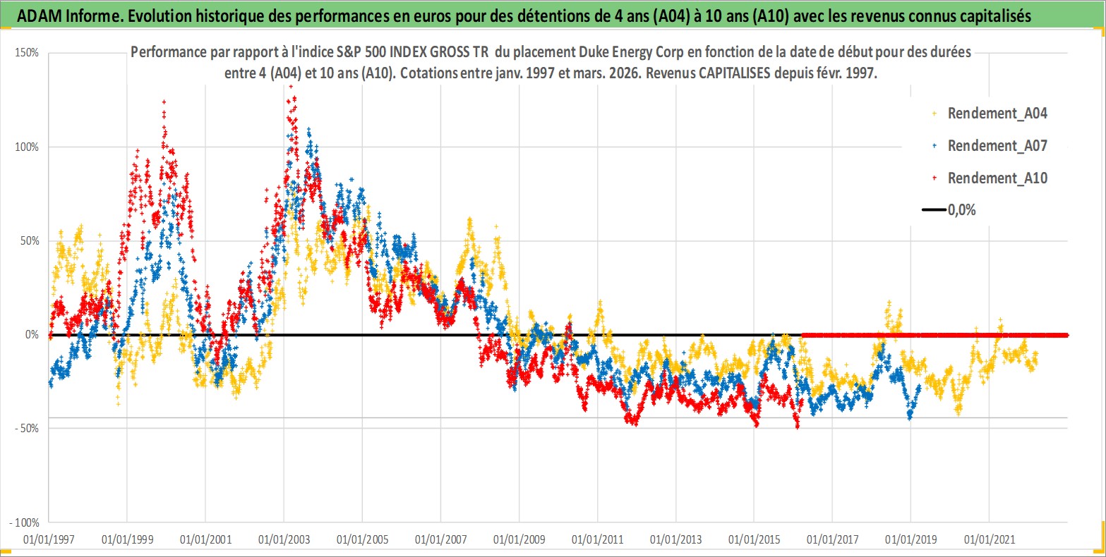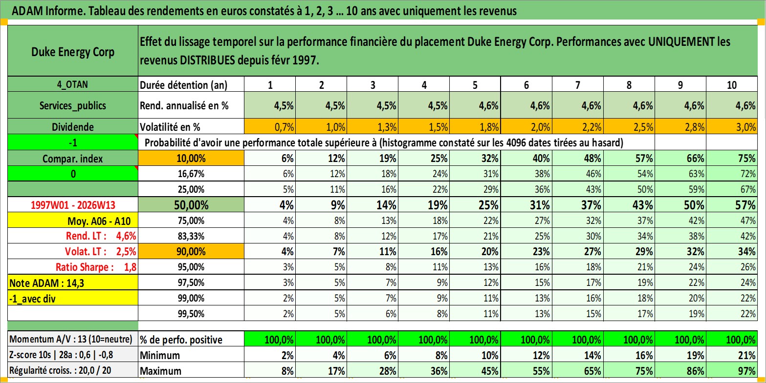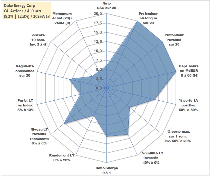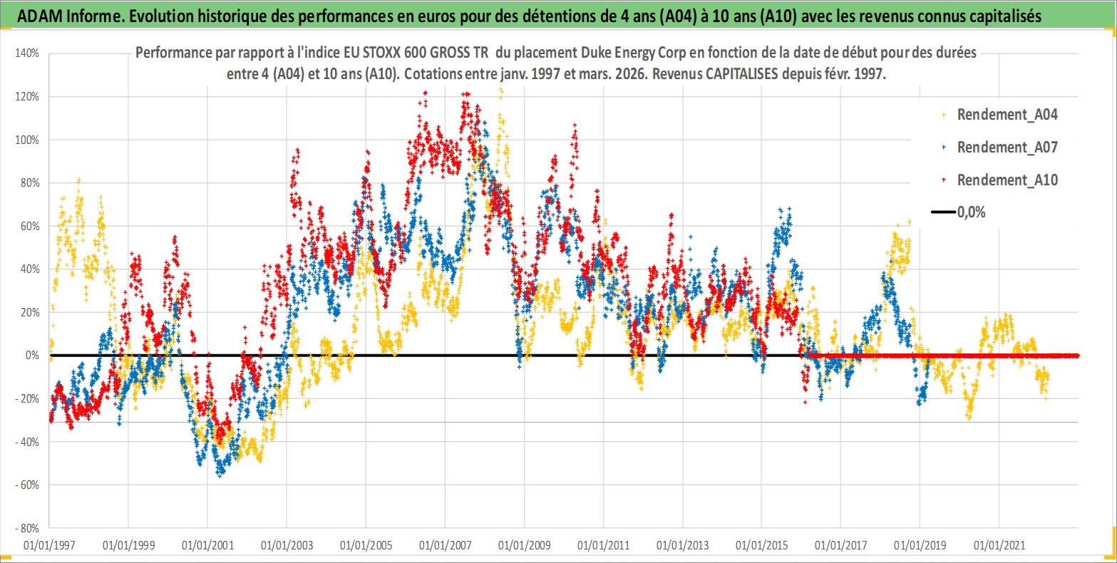 Site dédié aux investisseursPage dédiée sur site financeAnalyse des valorisations hebdomadaires de l'action Duke Energy Corp. Cet actif est cote en USD. Les valorisations sont en contrevaleur EURO et couvrent les semaines 1997W01 a 2026W13. Les revenus de cet actif financier sont pris en compte depuis la semaine 1997W07. La note globale ESG de cet actif est estimee a 6.0 (apres rebasage entre 0 et 20).