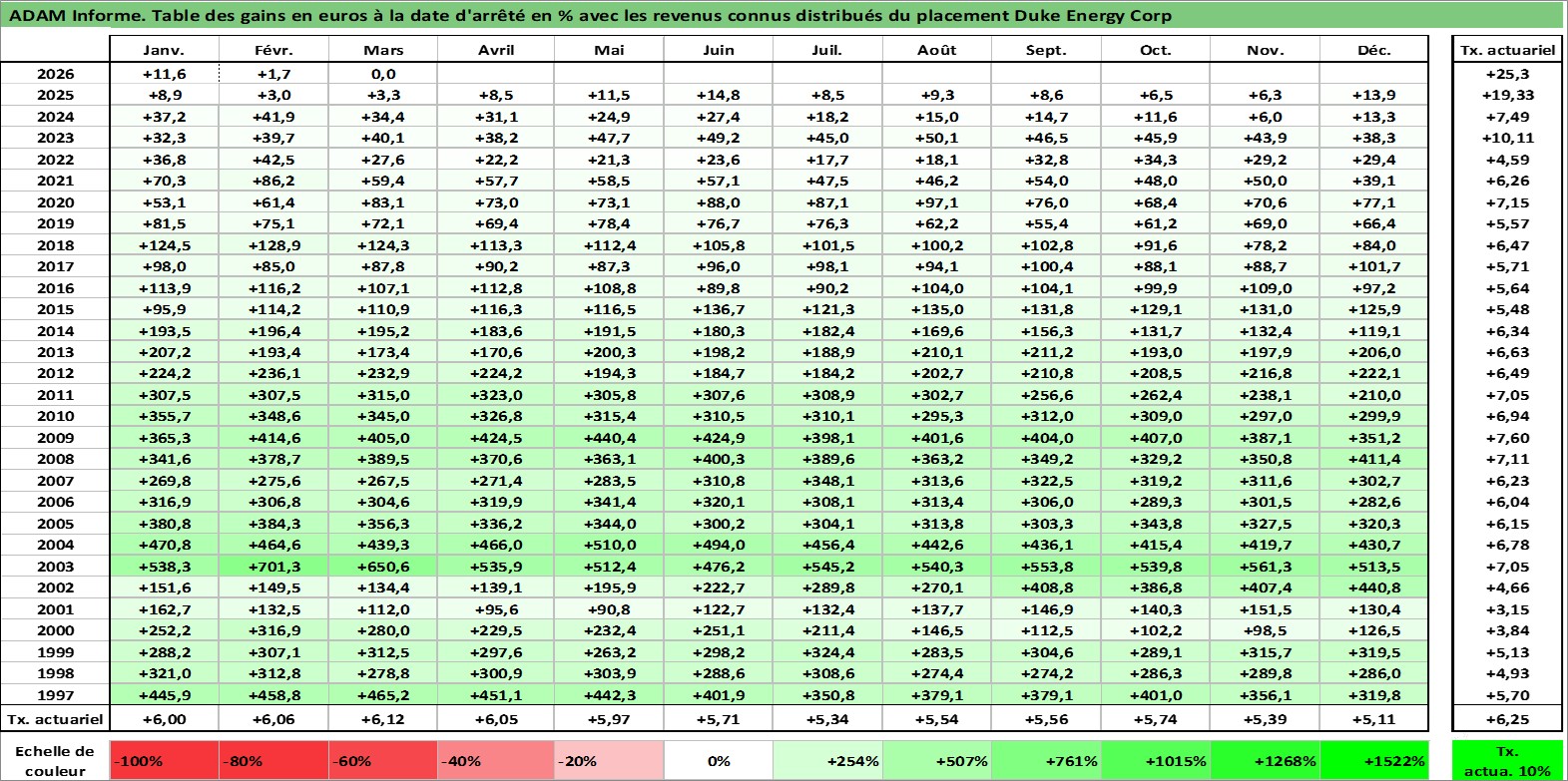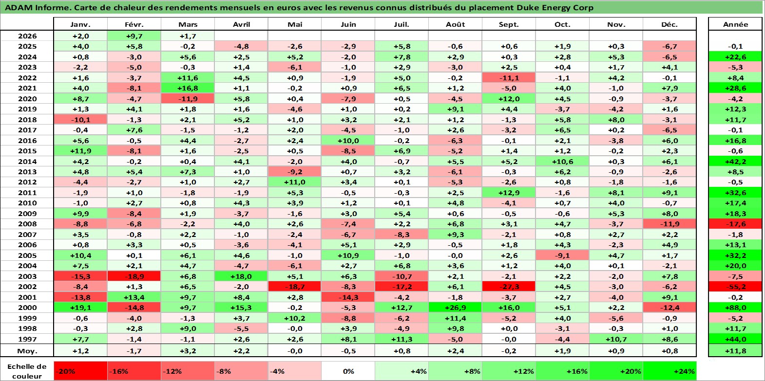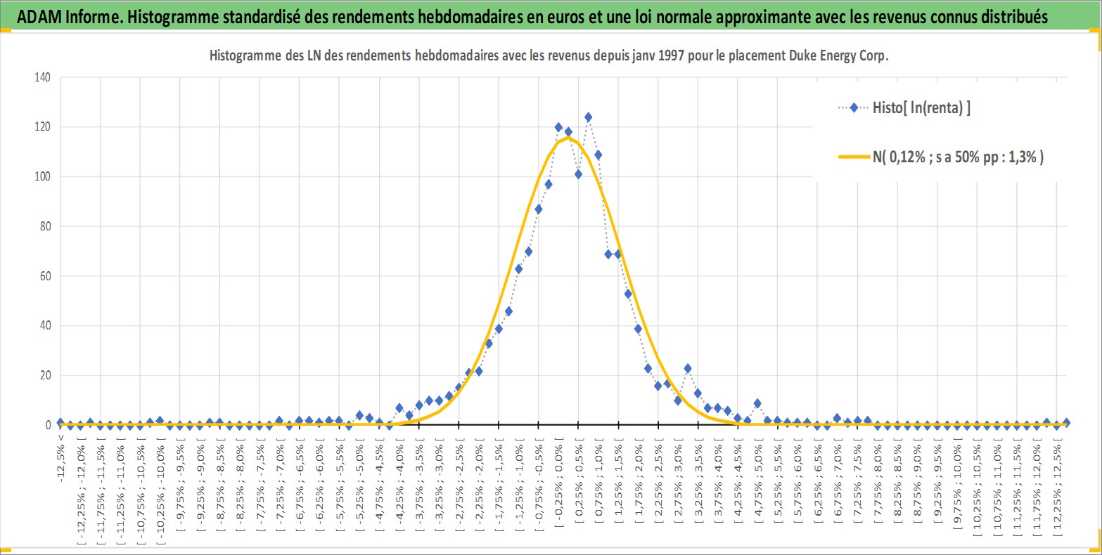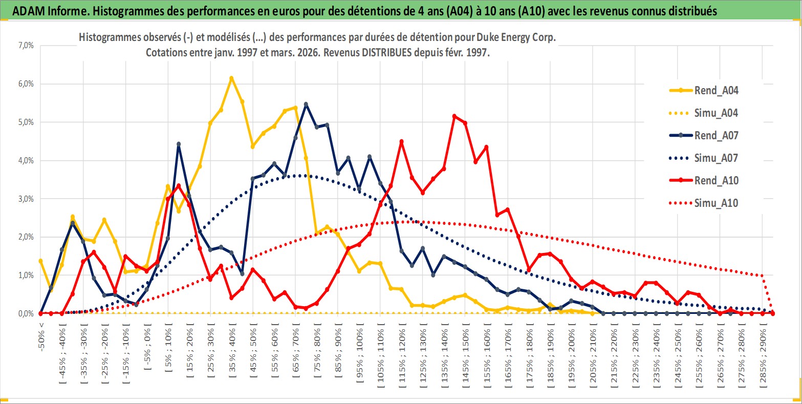 Site dédié aux investisseursPage dédiée sur site financeAnalyse des valorisations hebdomadaires de l'action Duke Energy Corp. Cet actif est cote en USD. Les valorisations sont en contrevaleur EURO et couvrent les semaines 1997W01 a 2026W13. Les revenus de cet actif financier sont pris en compte depuis la semaine 1997W07. La note globale ESG de cet actif est estimee a 6.0 (apres rebasage entre 0 et 20).