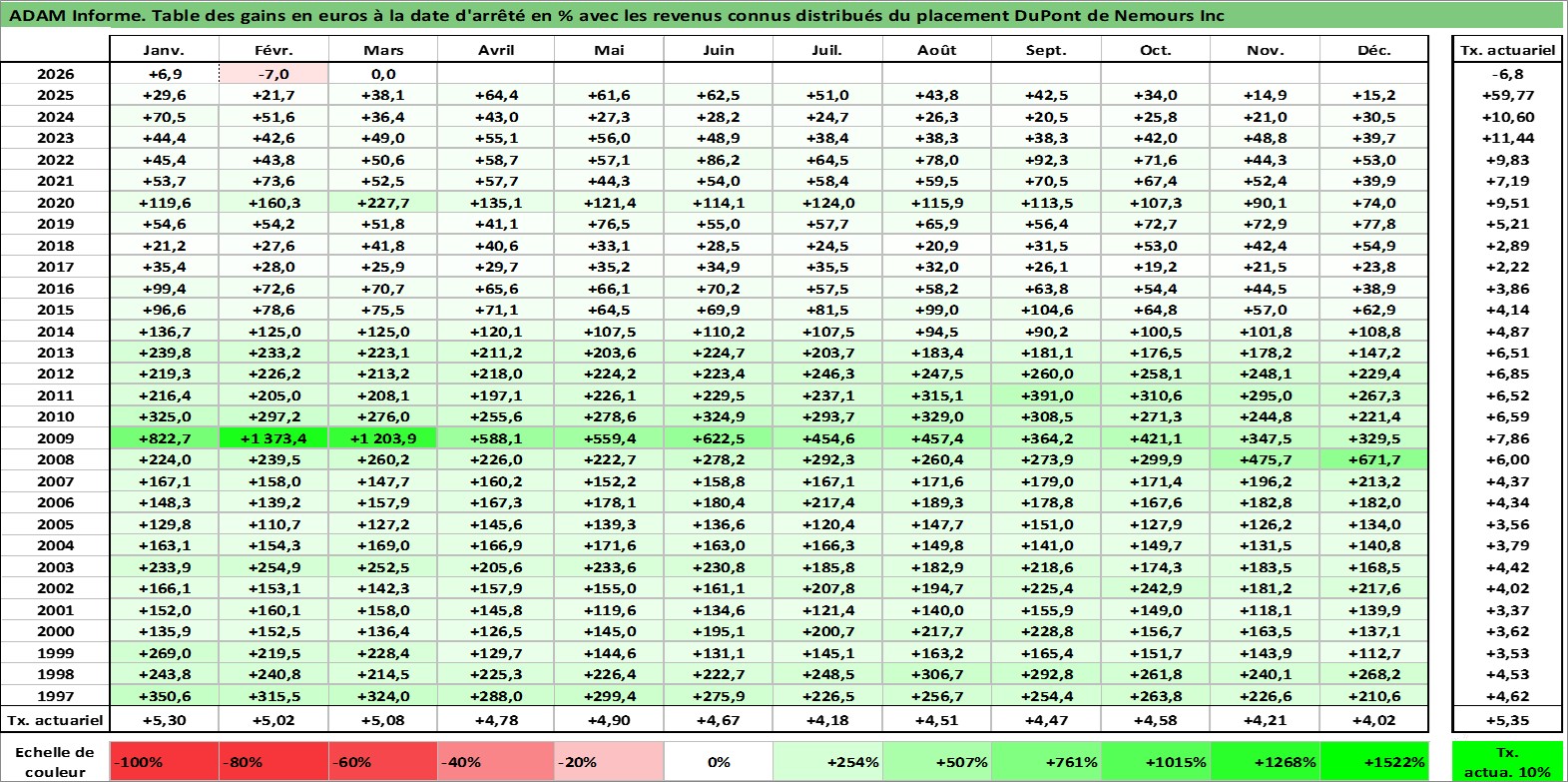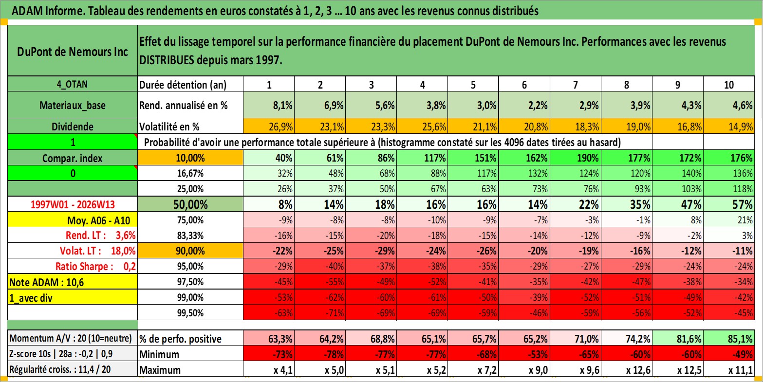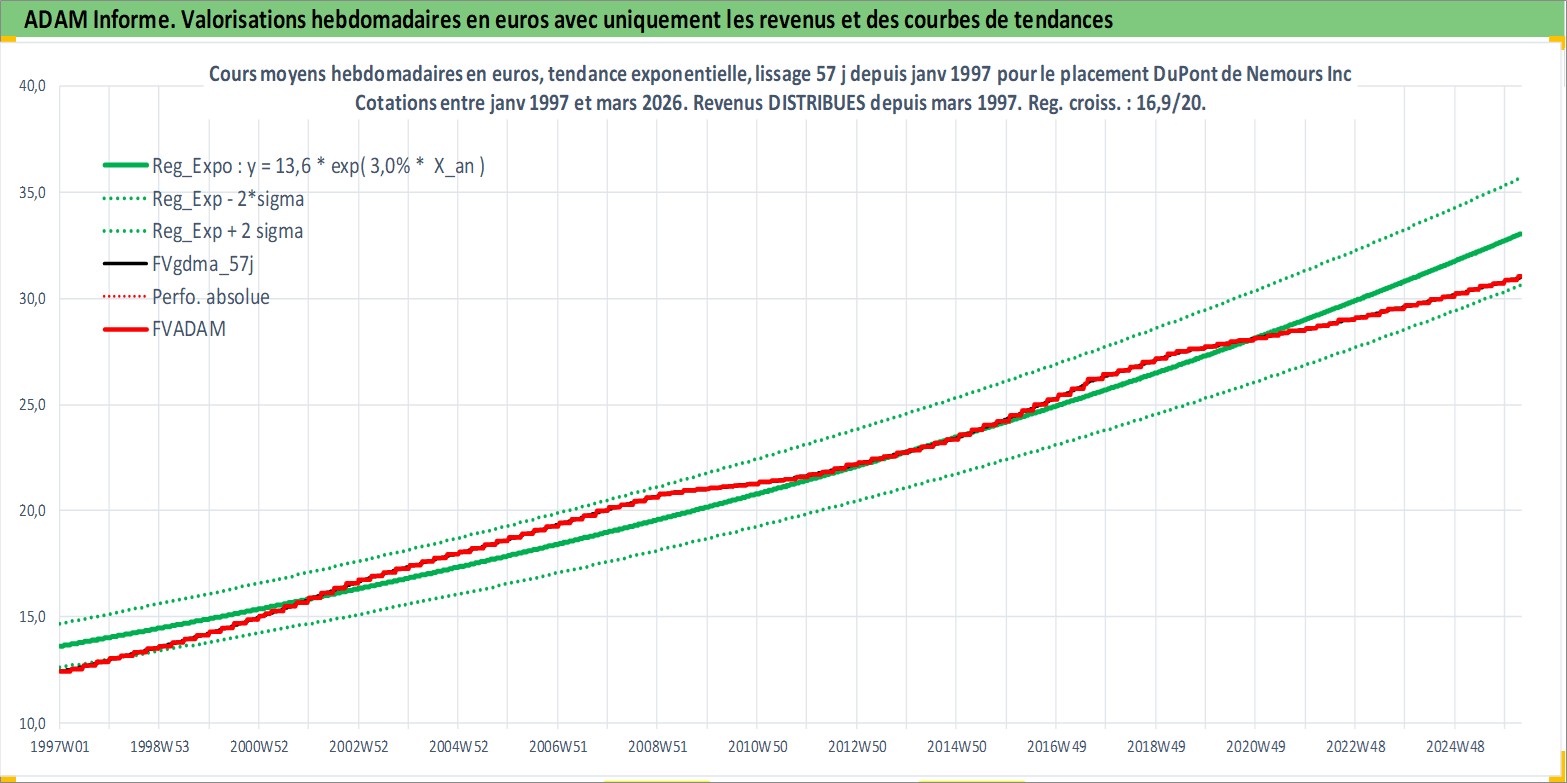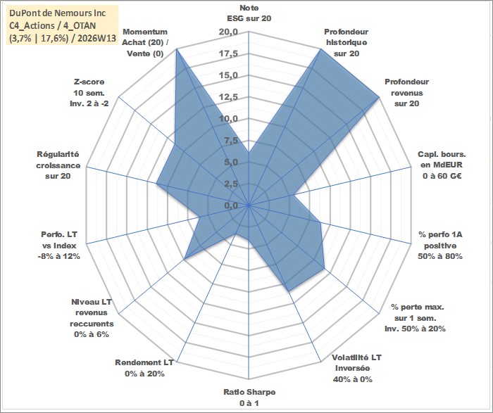 Site dédié aux investisseursPage dédiée sur site financeAnalyse des valorisations hebdomadaires de l'action DuPont de Nemours Inc. Cet actif est cote en USD. Les valorisations sont en contrevaleur EURO et couvrent les semaines 1997W01 a 2026W13. Les revenus de cet actif financier sont pris en compte depuis la semaine 1997W13. La note globale ESG de cet actif est estimee a 6.0 (apres rebasage entre 0 et 20).