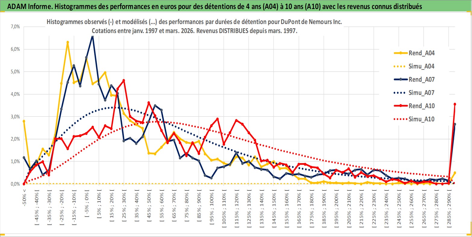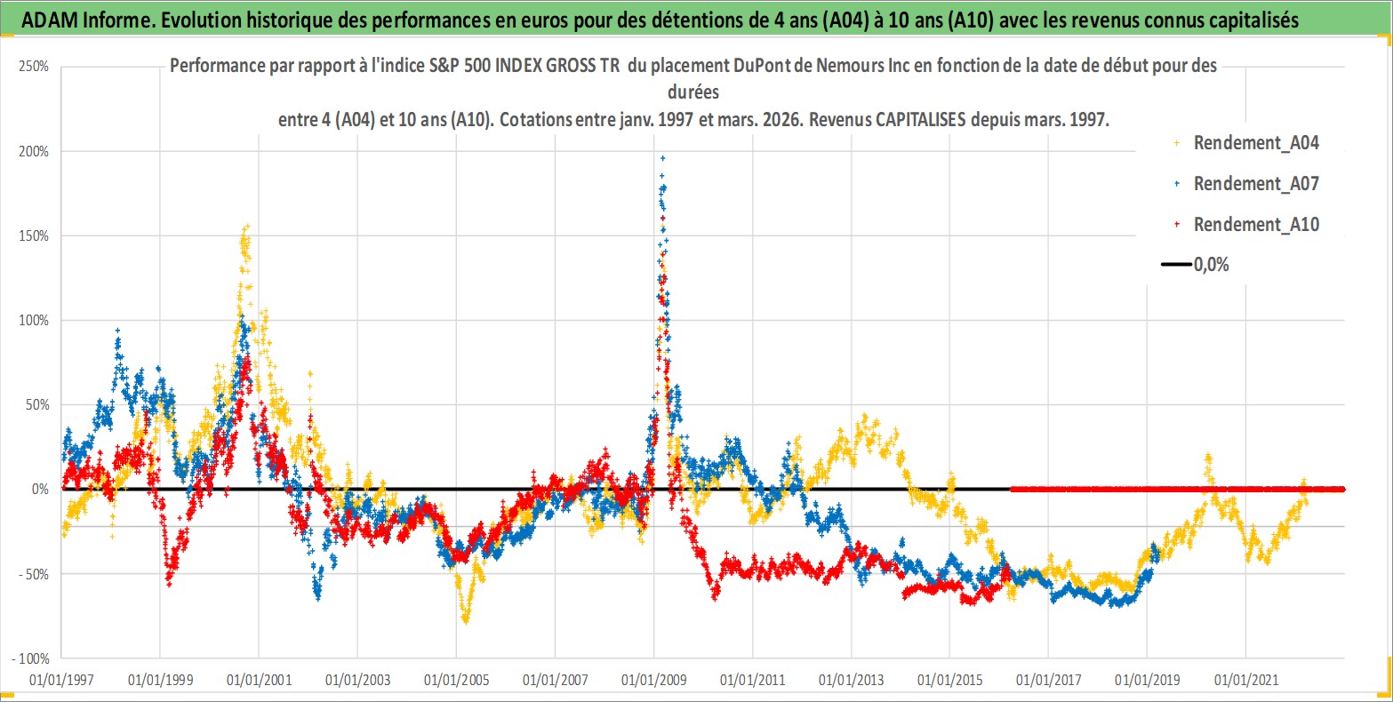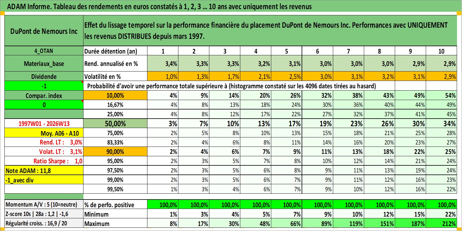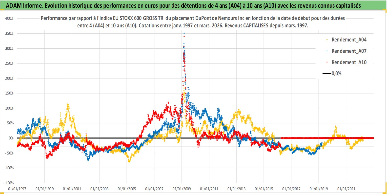 Site dédié aux investisseursPage dédiée sur site financeAnalyse des valorisations hebdomadaires de l'action DuPont de Nemours Inc. Cet actif est cote en USD. Les valorisations sont en contrevaleur EURO et couvrent les semaines 1997W01 a 2026W13. Les revenus de cet actif financier sont pris en compte depuis la semaine 1997W13. La note globale ESG de cet actif est estimee a 6.0 (apres rebasage entre 0 et 20).