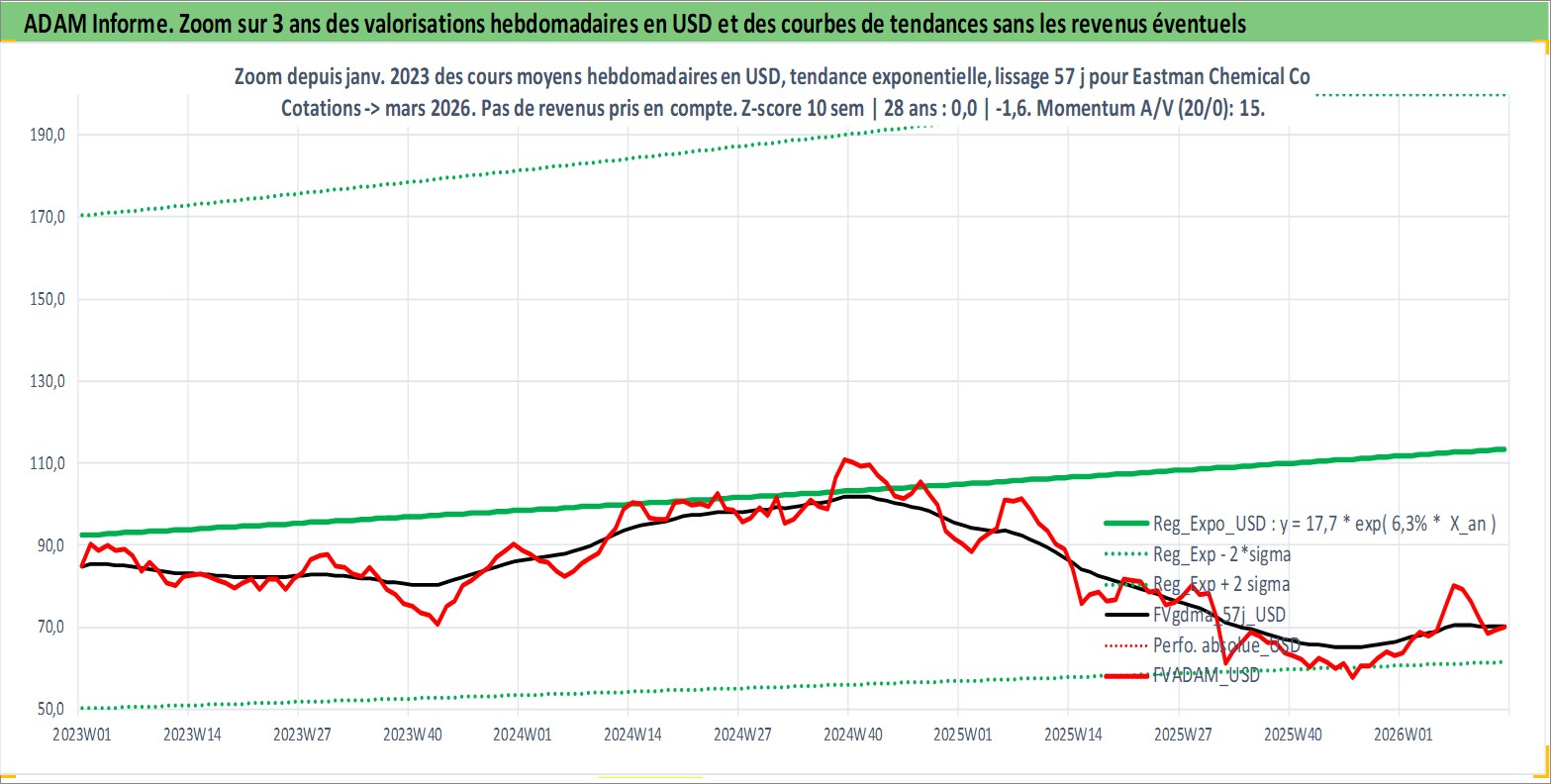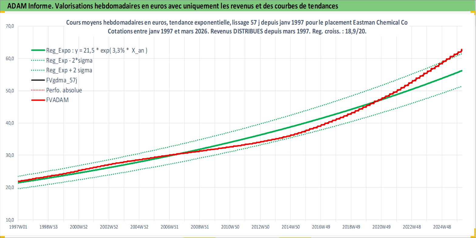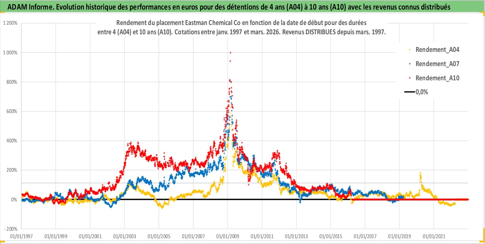 Site dédié aux investisseursPage dédiée sur site financeAnalyse des valorisations hebdomadaires de l'action Eastman Chemical Co. Cet actif est cote en USD. Les valorisations sont en contrevaleur EURO et couvrent les semaines 1997W01 a 2026W13. Les revenus de cet actif financier sont pris en compte depuis la semaine 1997W11. La note globale ESG de cet actif est estimee a 7.0 (apres rebasage entre 0 et 20).