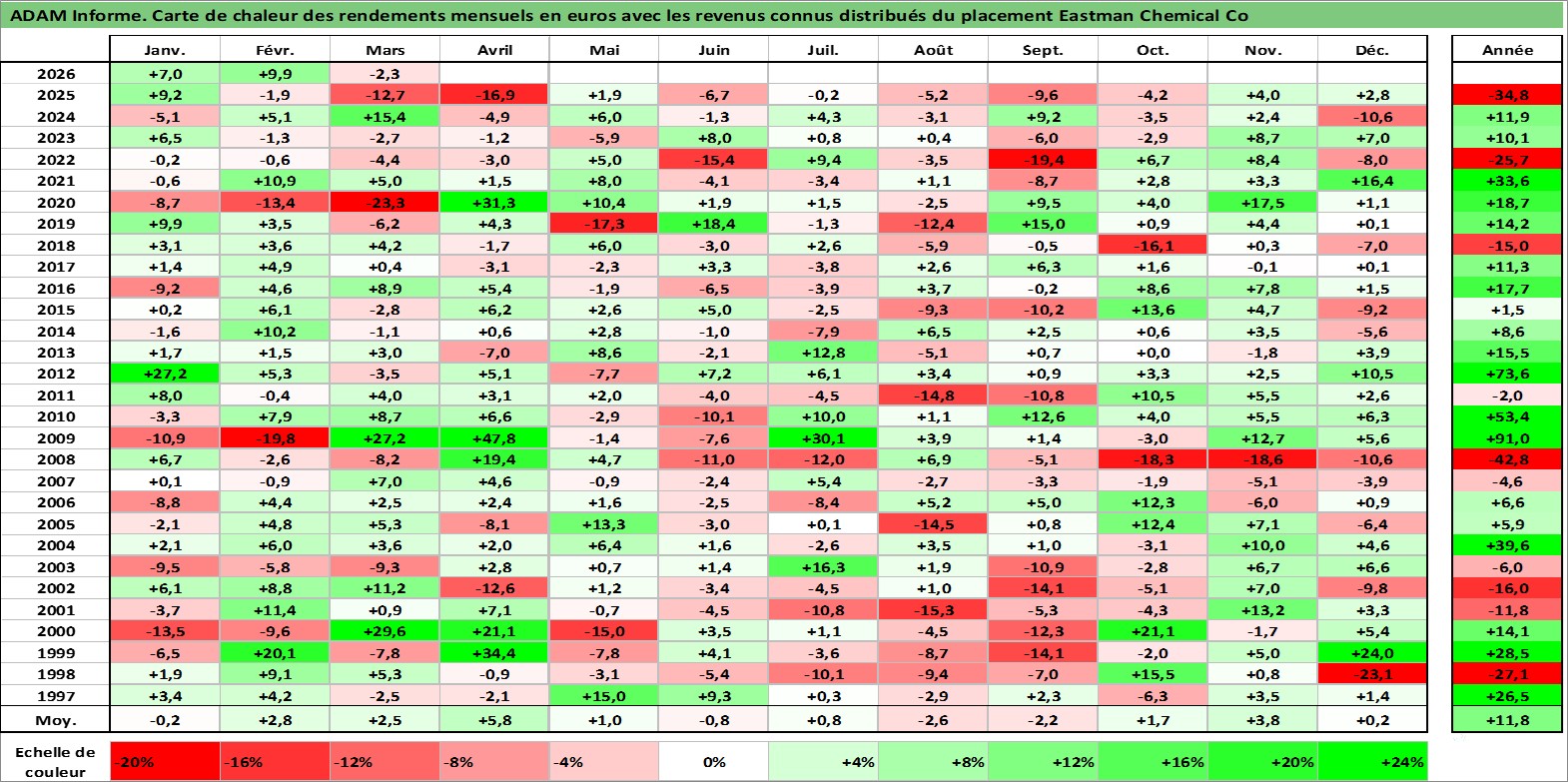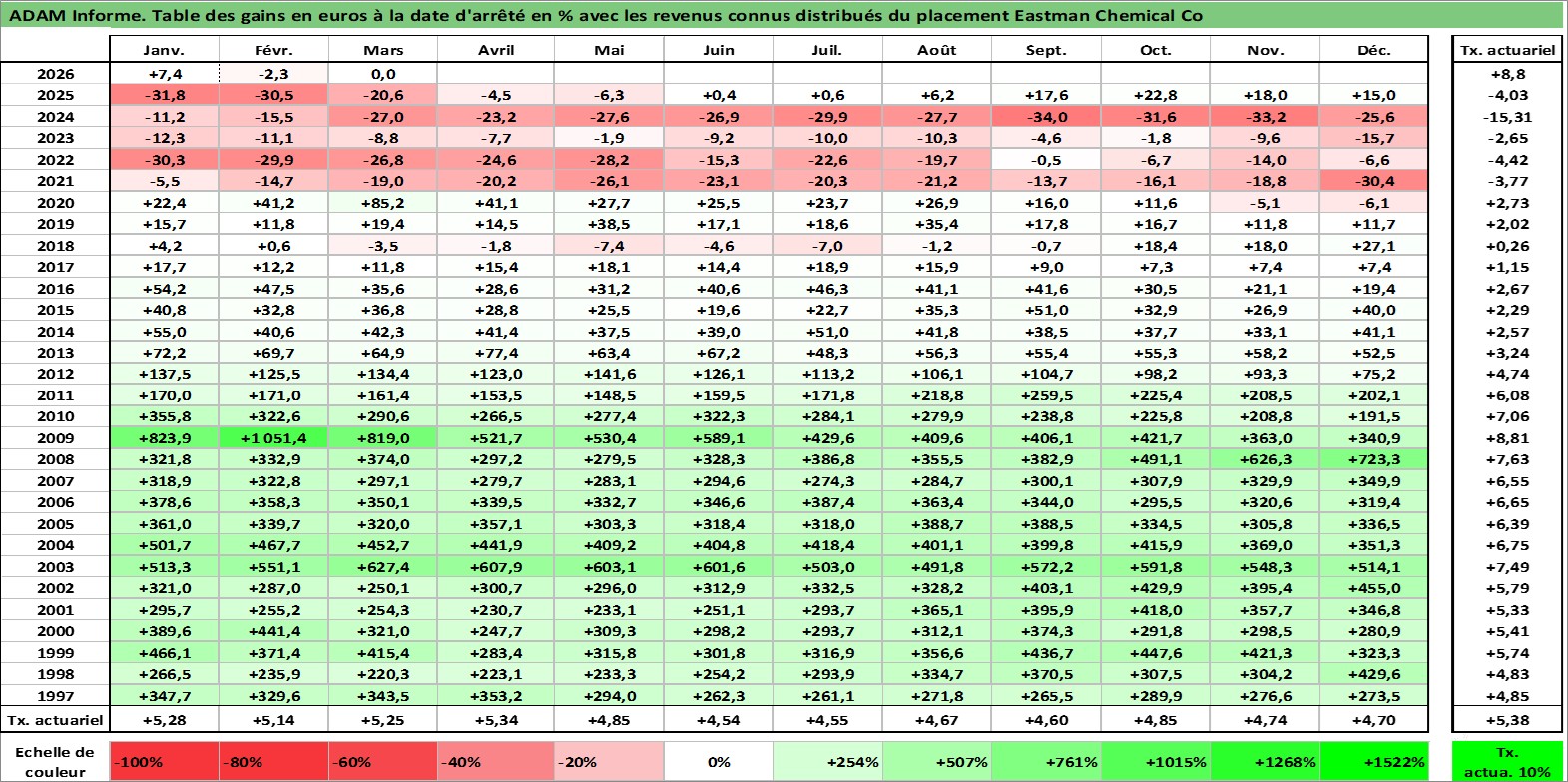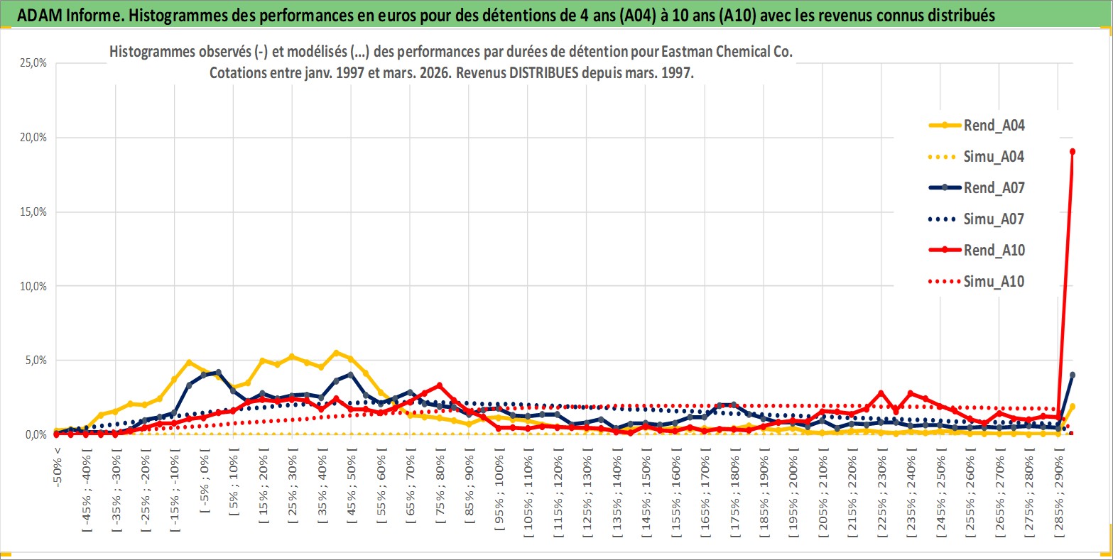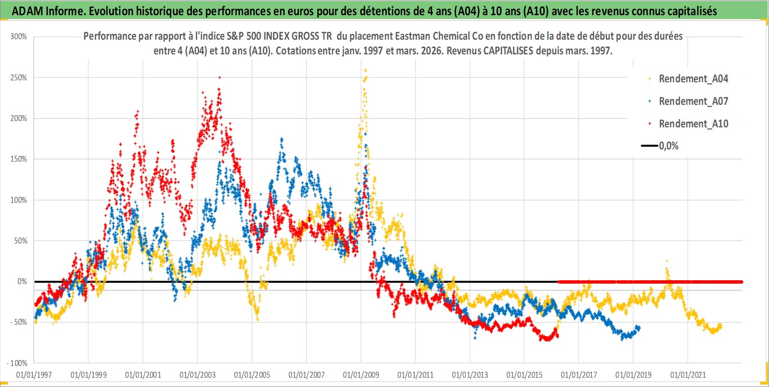 Site dédié aux investisseursPage dédiée sur site financeAnalyse des valorisations hebdomadaires de l'action Eastman Chemical Co. Cet actif est cote en USD. Les valorisations sont en contrevaleur EURO et couvrent les semaines 1997W01 a 2026W13. Les revenus de cet actif financier sont pris en compte depuis la semaine 1997W11. La note globale ESG de cet actif est estimee a 7.0 (apres rebasage entre 0 et 20).