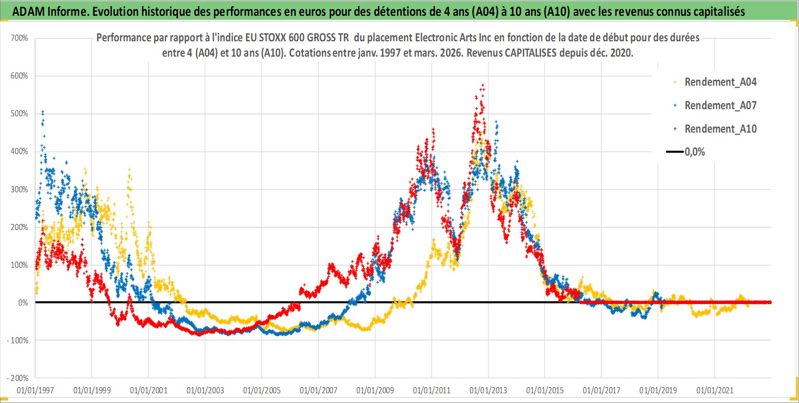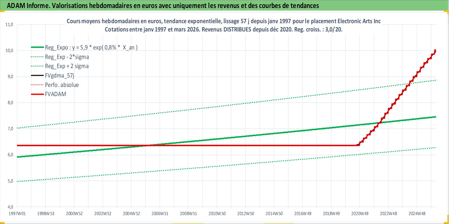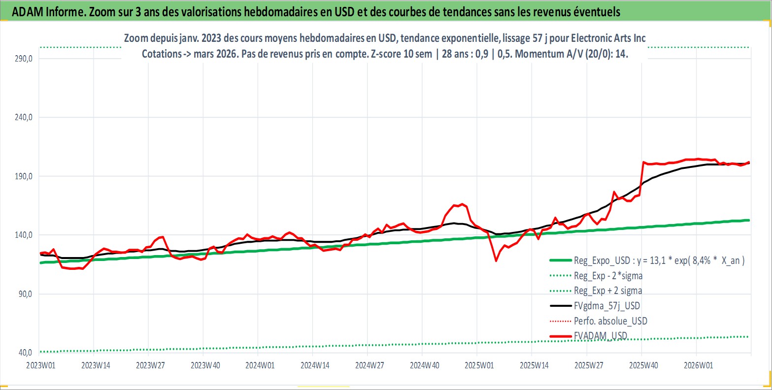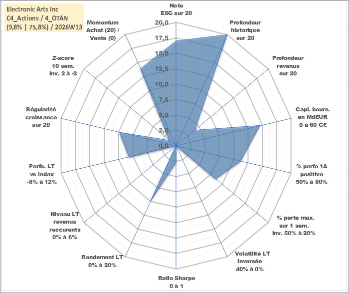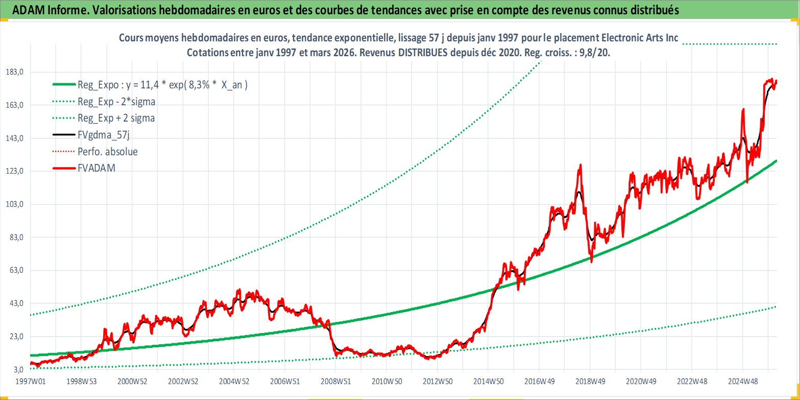 Site dédié aux investisseursPage dédiée sur site financeAnalyse des valorisations hebdomadaires de l'action Electronic Arts Inc. Cet actif est cote en USD. Les valorisations sont en contrevaleur EURO et couvrent les semaines 1997W01 a 2026W13. Les revenus de cet actif financier sont pris en compte depuis la semaine 2020W49. La note globale ESG de cet actif est estimee a 17.0 (apres rebasage entre 0 et 20).