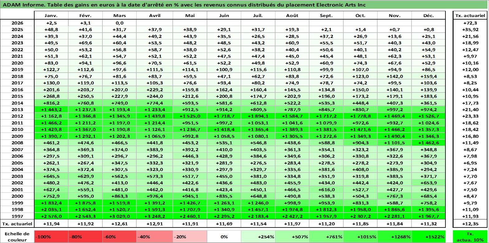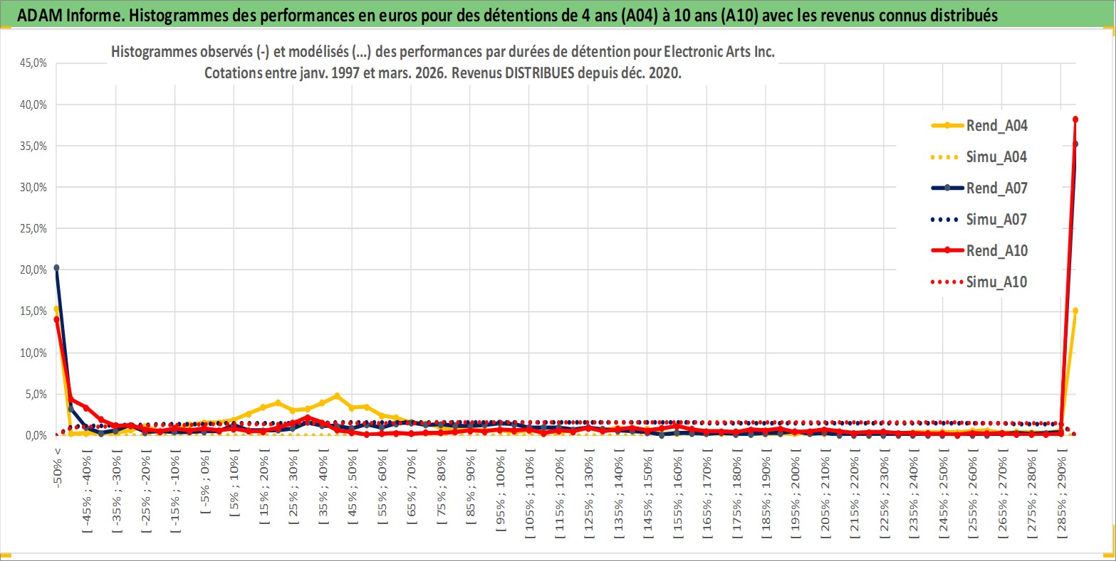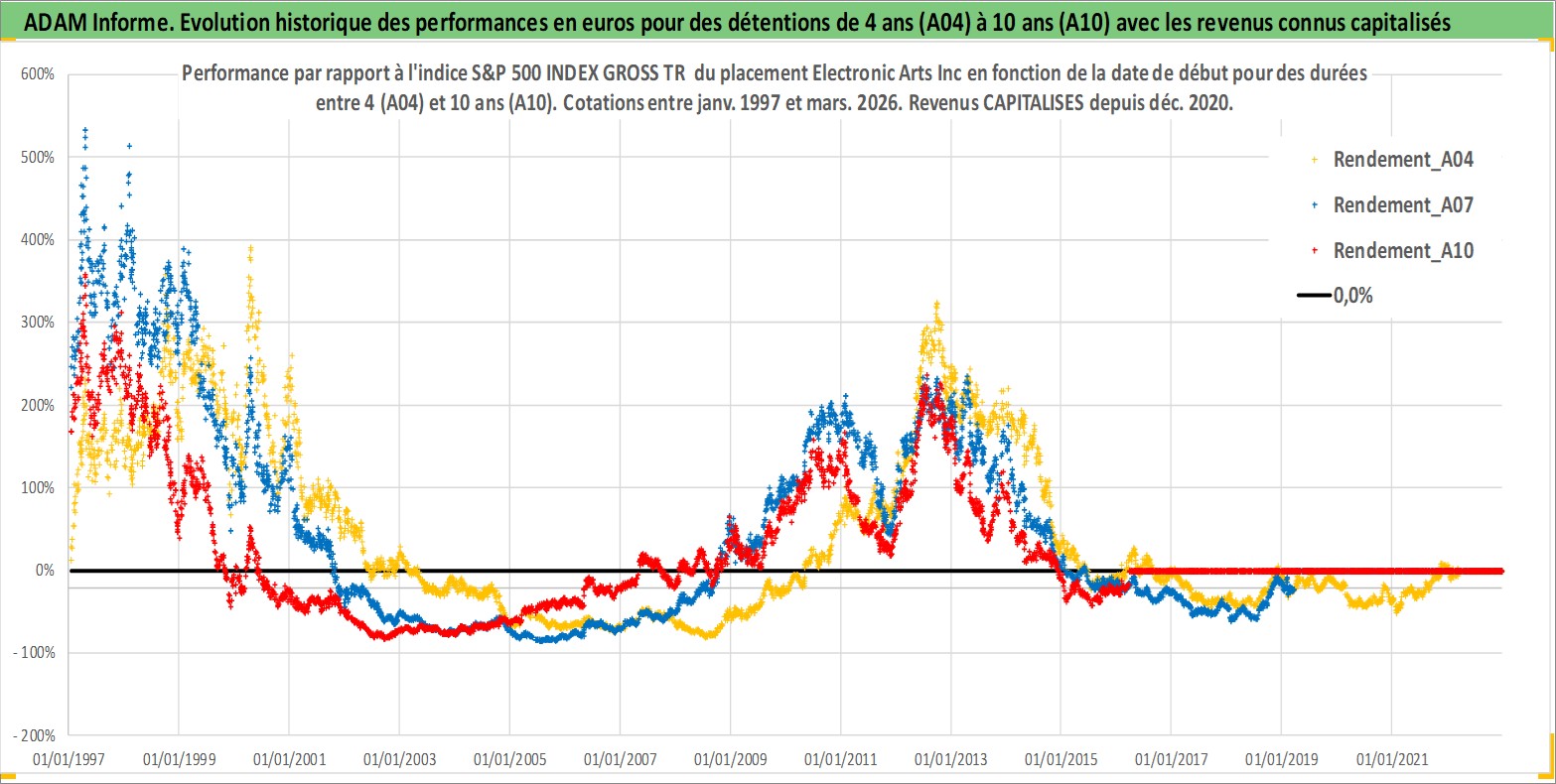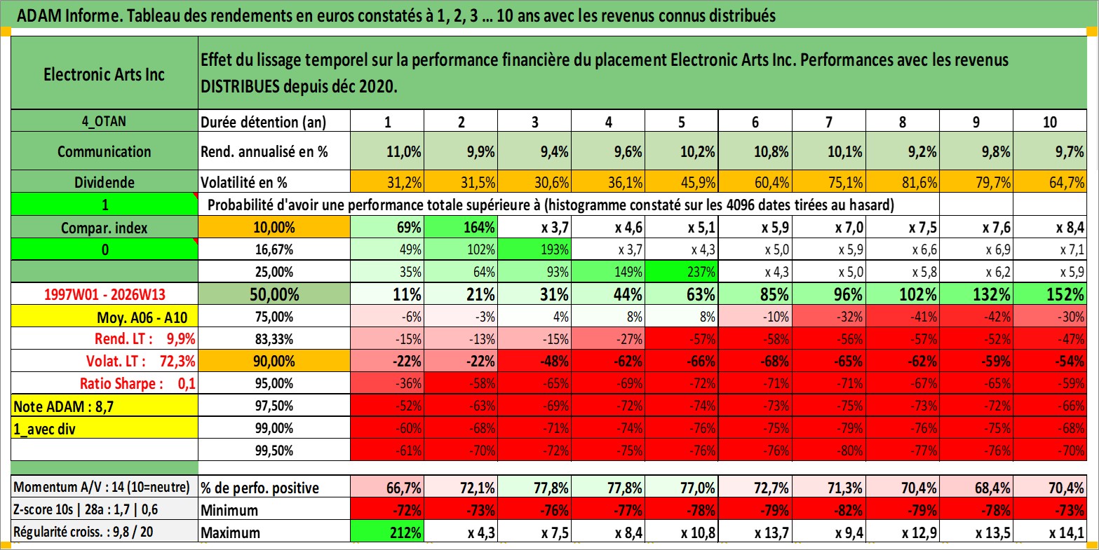 Site dédié aux investisseursPage dédiée sur site financeAnalyse des valorisations hebdomadaires de l'action Electronic Arts Inc. Cet actif est cote en USD. Les valorisations sont en contrevaleur EURO et couvrent les semaines 1997W01 a 2026W13. Les revenus de cet actif financier sont pris en compte depuis la semaine 2020W49. La note globale ESG de cet actif est estimee a 17.0 (apres rebasage entre 0 et 20).
